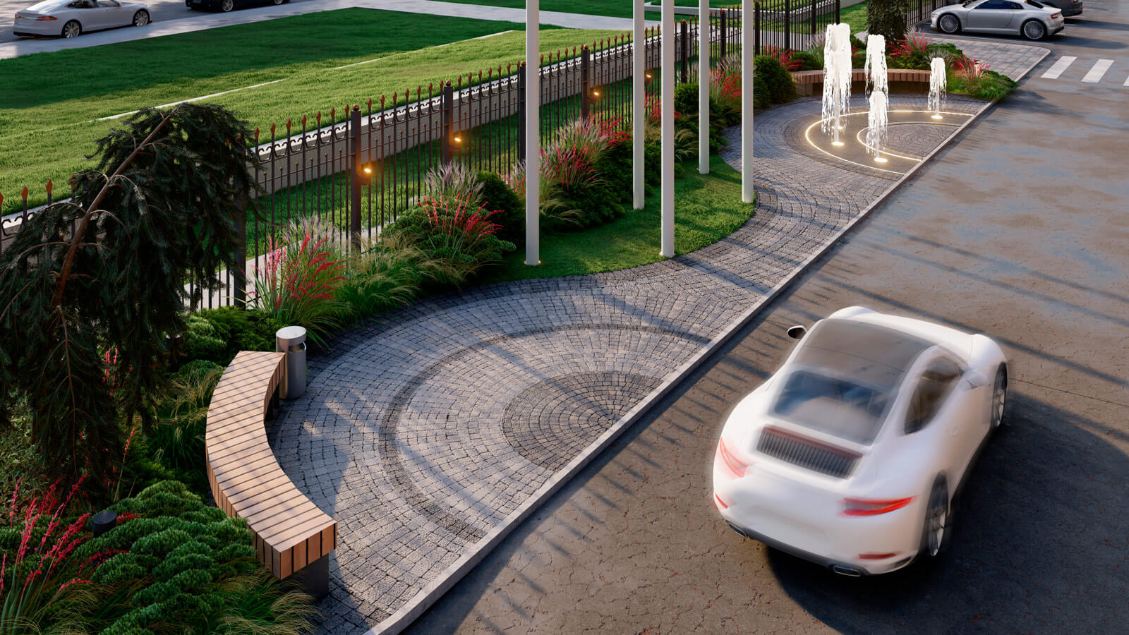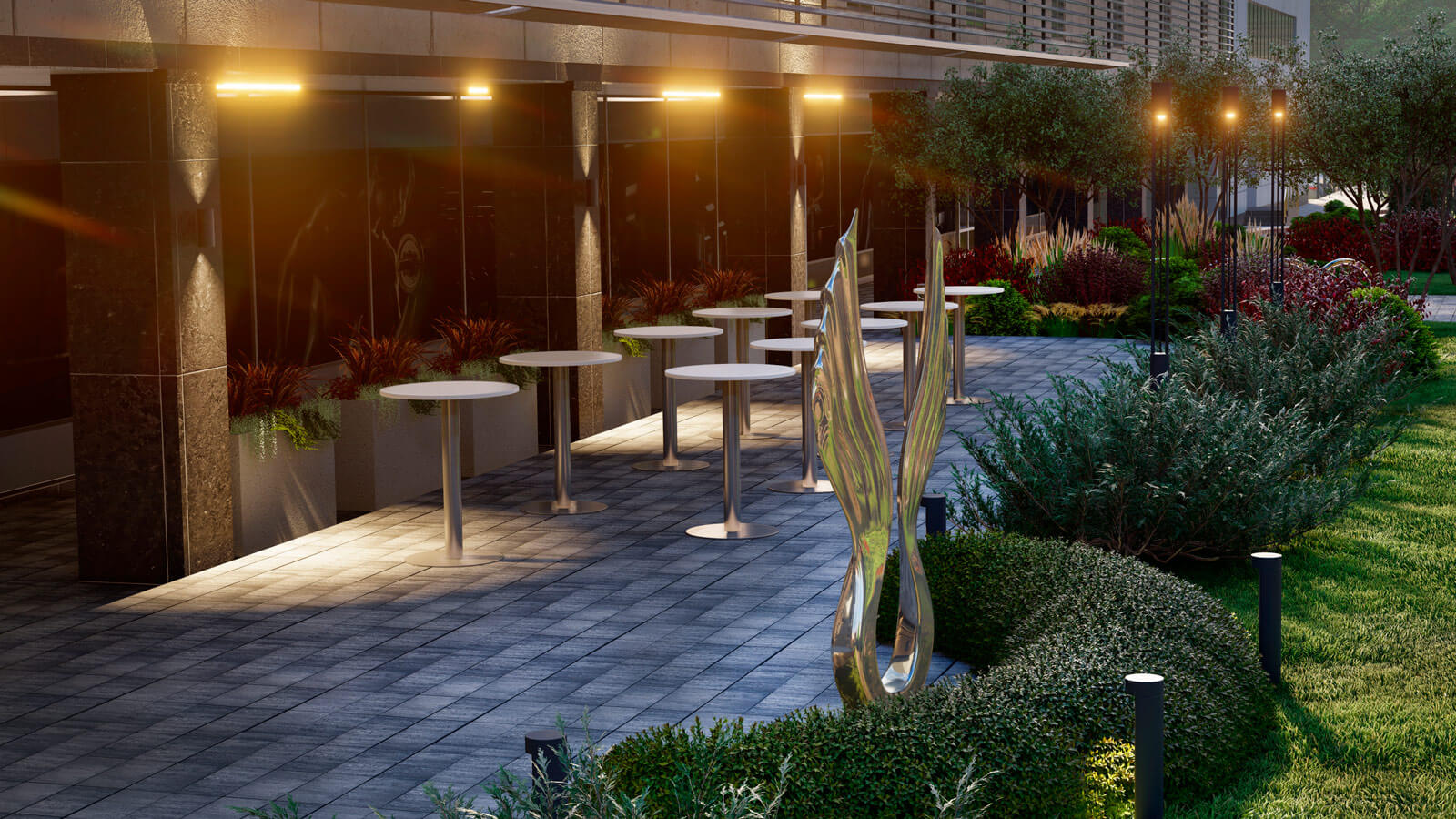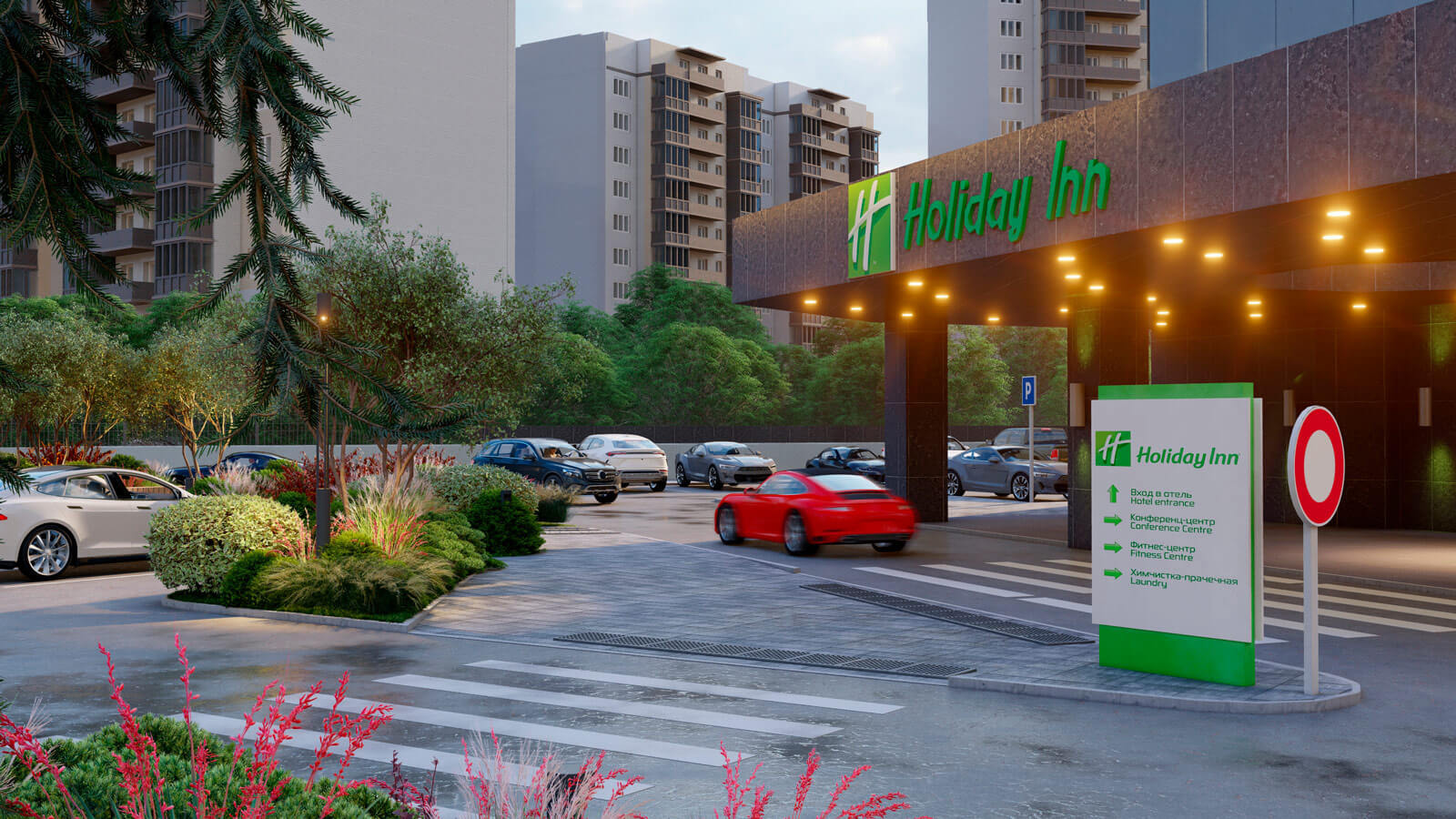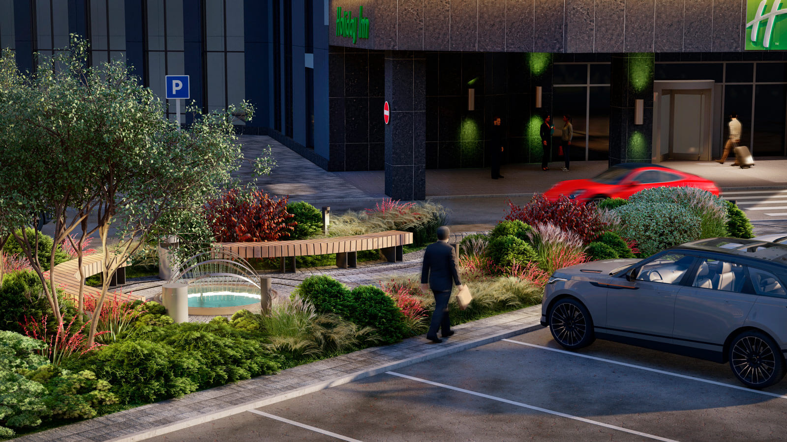 Фонтаны и скульптуры всегда были главными точками притяжения в парке «Сокольники», поэтому в центр композиции был интегрирован фонтан «Водный портал». А сухой фонтан возле флагштоков создаст дополнительную интерактивную зону для посетителей. Таким образом, проект Falcon является кардинальным переосмыслением благоустройства территории гостиницы «Holiday Inn»!