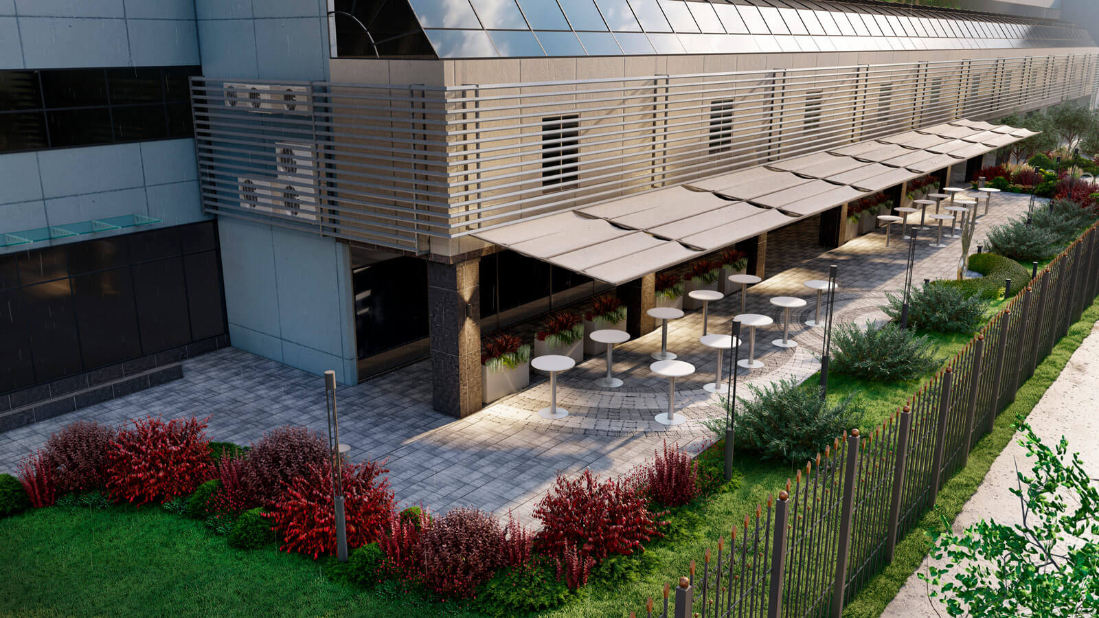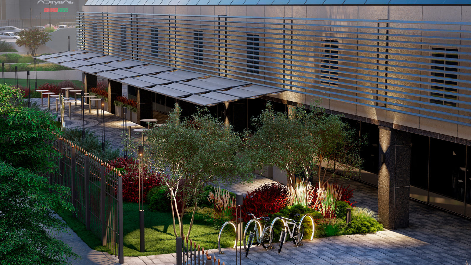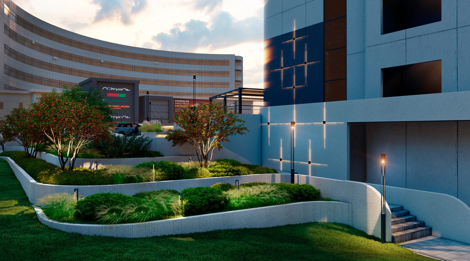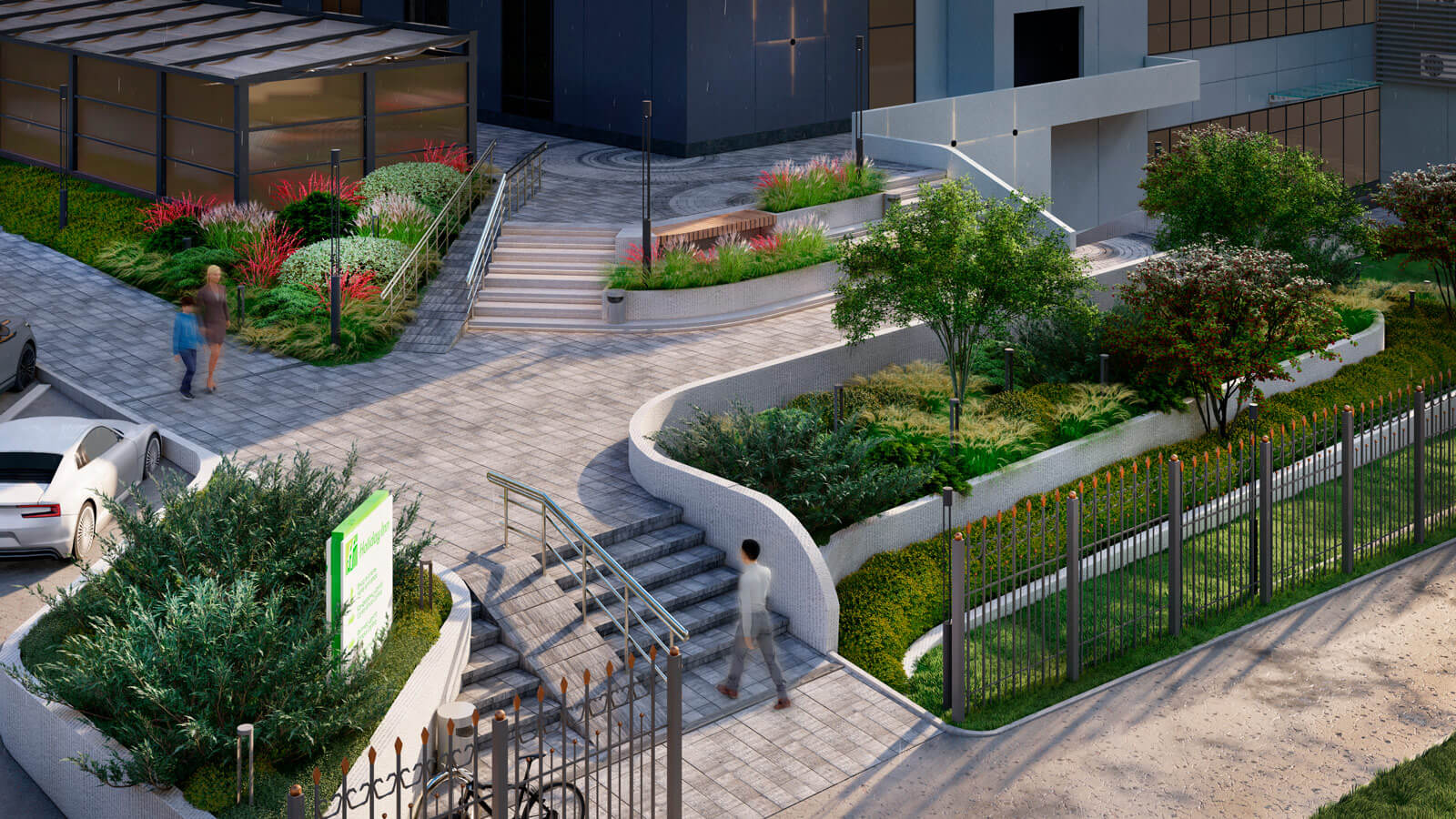 Фонтаны и скульптуры всегда были главными точками притяжения в парке «Сокольники», поэтому в центр композиции был интегрирован фонтан «Водный портал». А сухой фонтан возле флагштоков создаст дополнительную интерактивную зону для посетителей. Таким образом, проект Falcon является кардинальным переосмыслением благоустройства территории гостиницы «Holiday Inn»!
