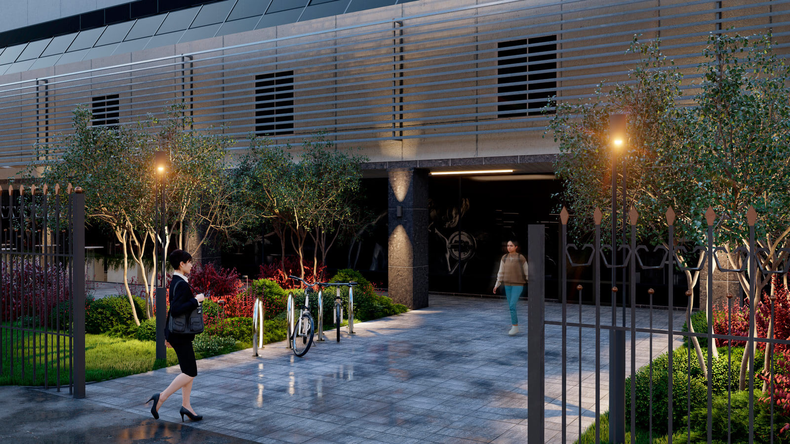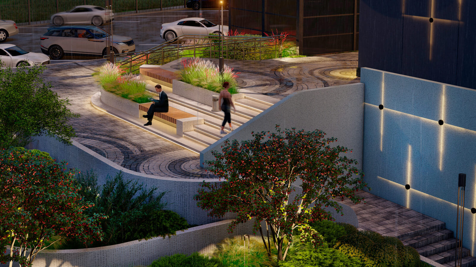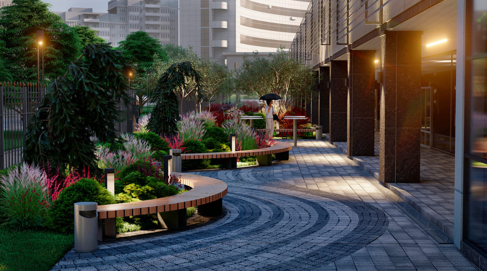 Яркой отсылкой к благоустройству возле метро «Сокольники» является мощение клинкерной брусчаткой, которым выполнено покрытие дорожно-тропиночной сети. В мощении используется два цветовых оттенка клинкера, выложенных радиальными узорами, что повторяет узнаваемый стиль кладки старинных Московских улиц. Пейзажную планировку дополняют радиусные скамьи по контурам дорог, дублирующие их изгибы. Такая планировка будет особенно выигрышно смотреться из окон верхних этажей гостиницы!