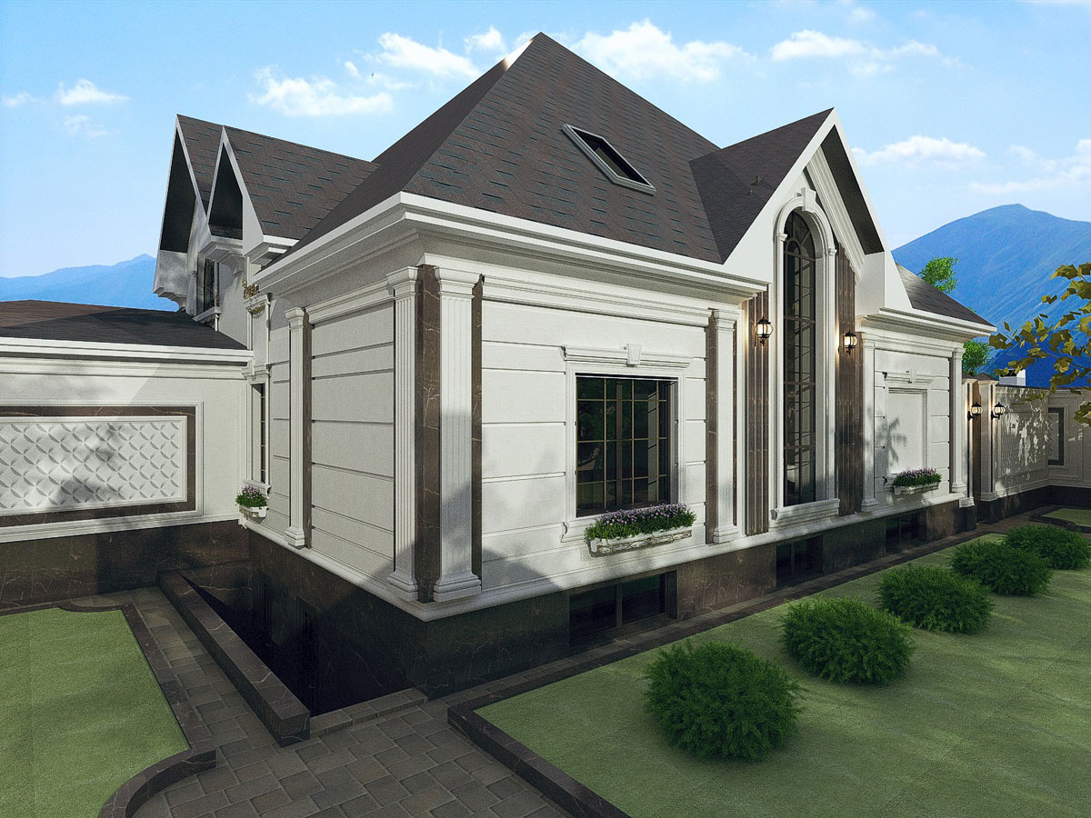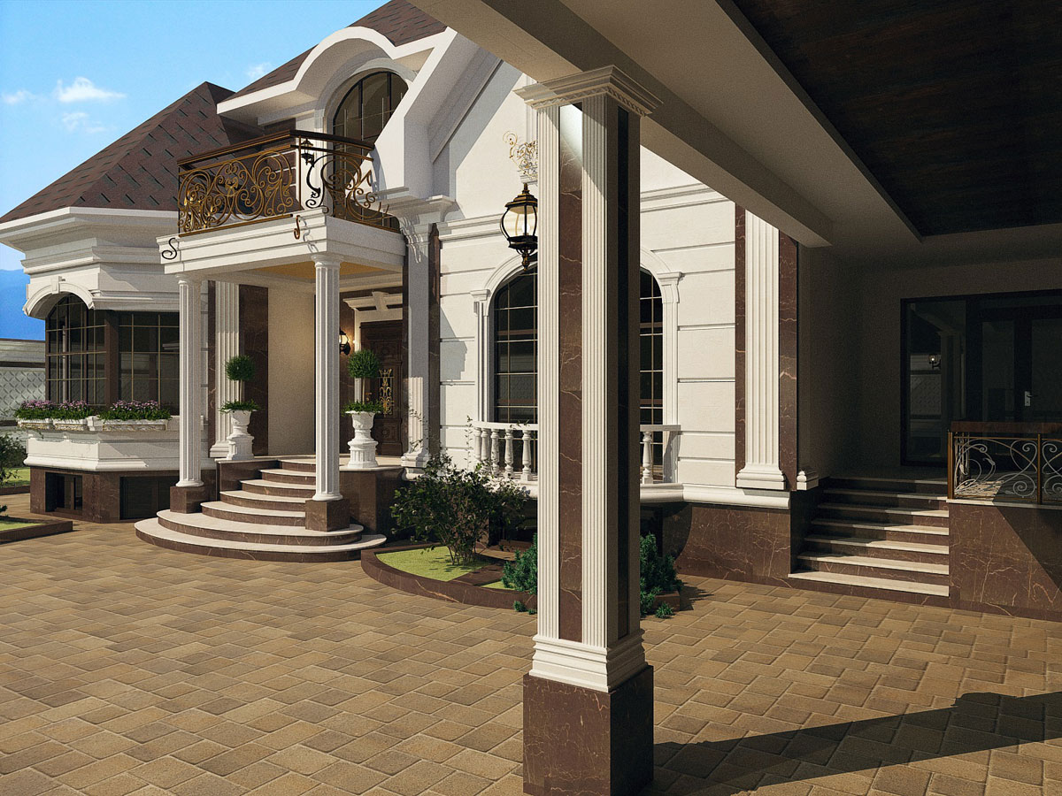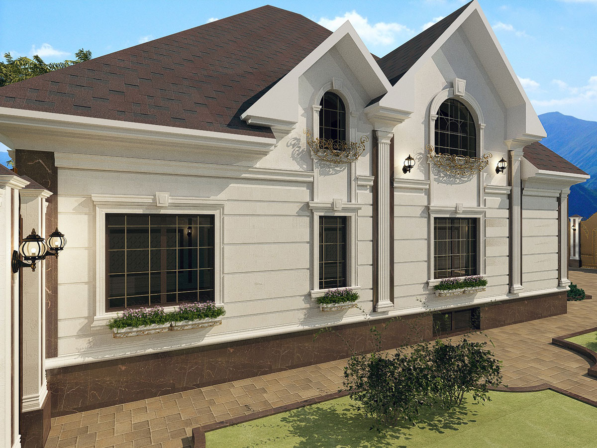 Дизайн-студия работала над всем объектом в комплексе. В одном стиле разрабатывались и экстерьер, и интерьер. Заказчики являются поклонниками классического стиля, поэтому основным материалом для отделки фасада было решено использовать дагестанский известняк. Из этого камня изготавливались как русты, так и декоративные элементы: карнизы, колонны, пилястры. Дагестанский известняк имеет приятный светлый оттенок, и для того чтобы его подчернуть, в отделку фасада добавили гранит темно-коричневого цвета. Темные цоколь и вставки на фасаде придают домовладению торжественность и оригинальность.