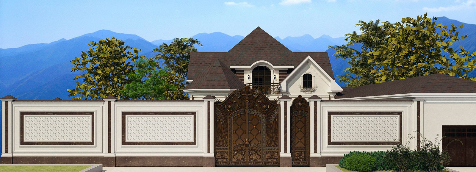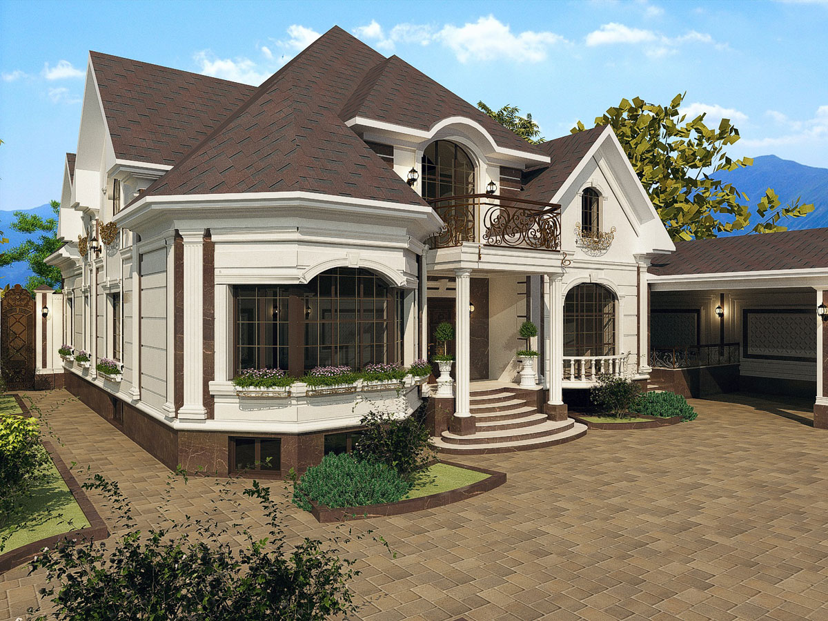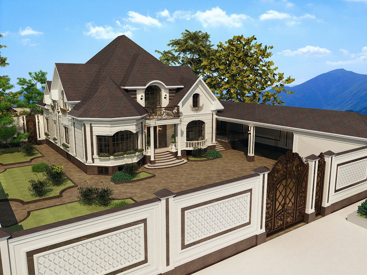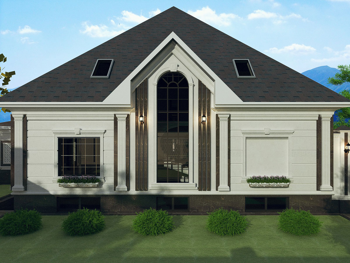 Дизайн-студия работала над всем объектом в комплексе. В одном стиле разрабатывались и экстерьер, и интерьер. Заказчики являются поклонниками классического стиля, поэтому основным материалом для отделки фасада было решено использовать дагестанский известняк. Из этого камня изготавливались как русты, так и декоративные элементы: карнизы, колонны, пилястры. Дагестанский известняк имеет приятный светлый оттенок, и для того чтобы его подчернуть, в отделку фасада добавили гранит темно-коричневого цвета. Темные цоколь и вставки на фасаде придают домовладению торжественность и оригинальность.