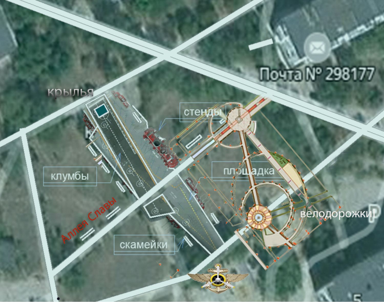 В основу реконструкции центральной части сквера легла композиция в виде палубы авианосца. Тема авианесущих кораблей была одной из тем института. Идея трамплина, с помощью которого осуществлялись взлеты и посадки самолетов, легла в основу продолжение центральной части в виде спортивной площадки для прыжков на скейтах и спортивных велосипедов.