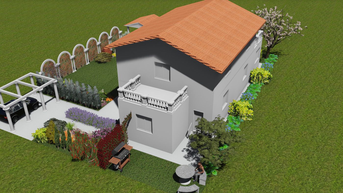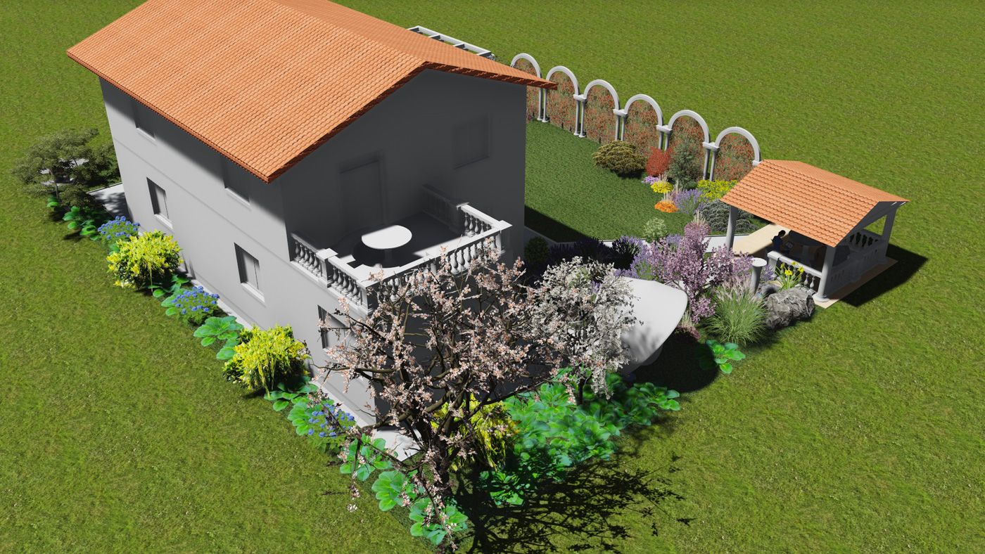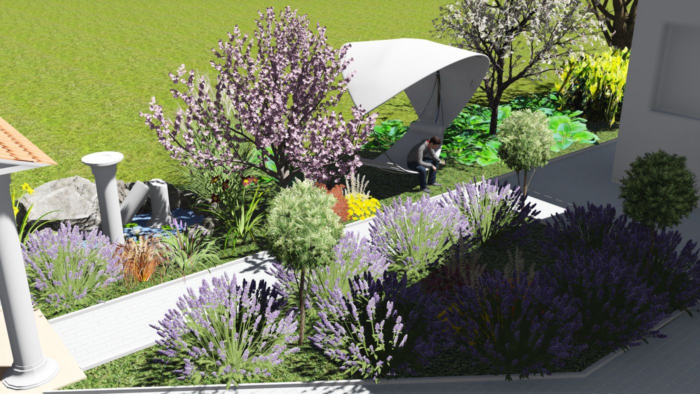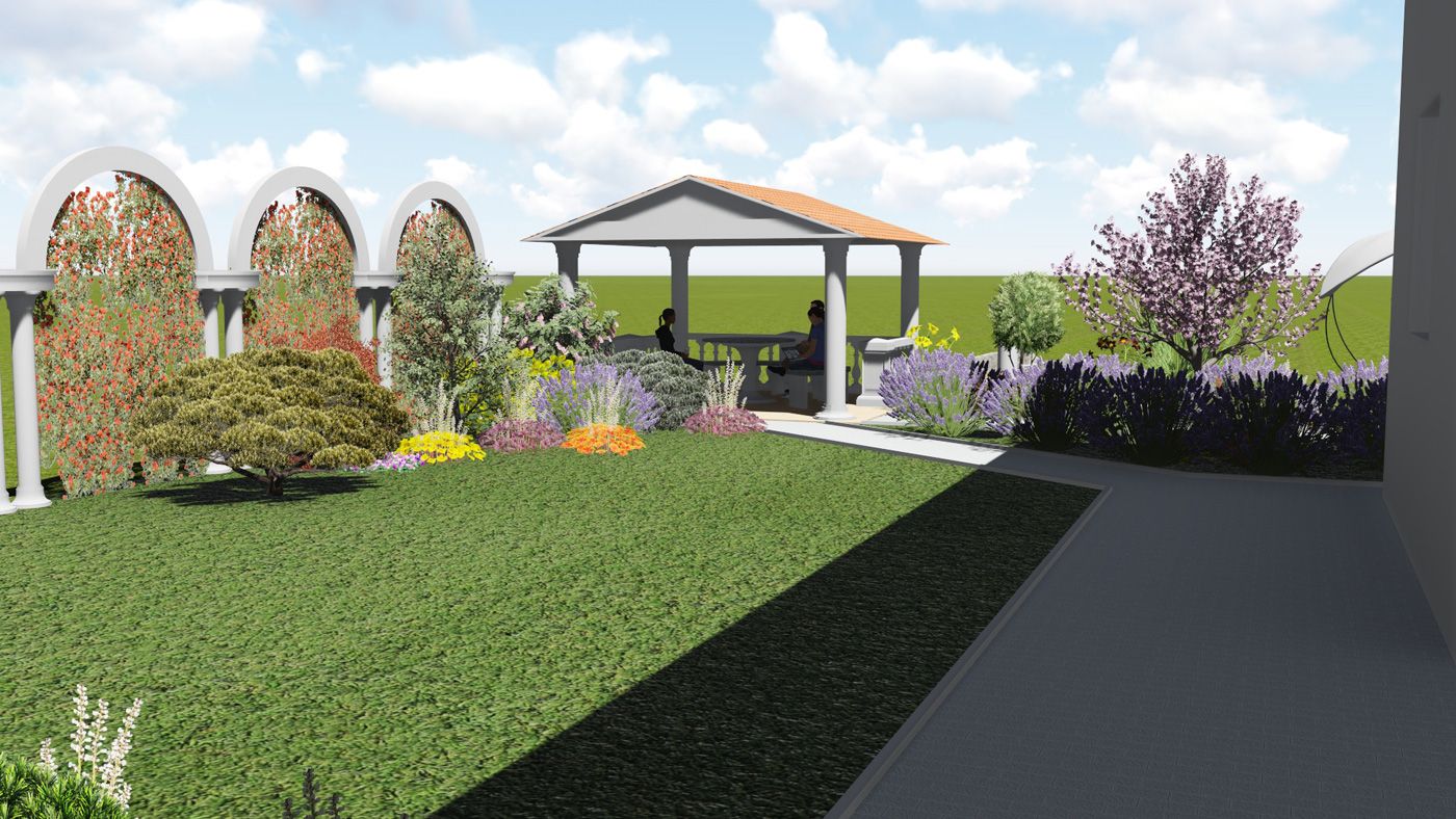 Около беседки, выполненной в античном стиле, находится пруд и аромаклумба с пряными растениями: тимьяном, розмарином, лавандой.