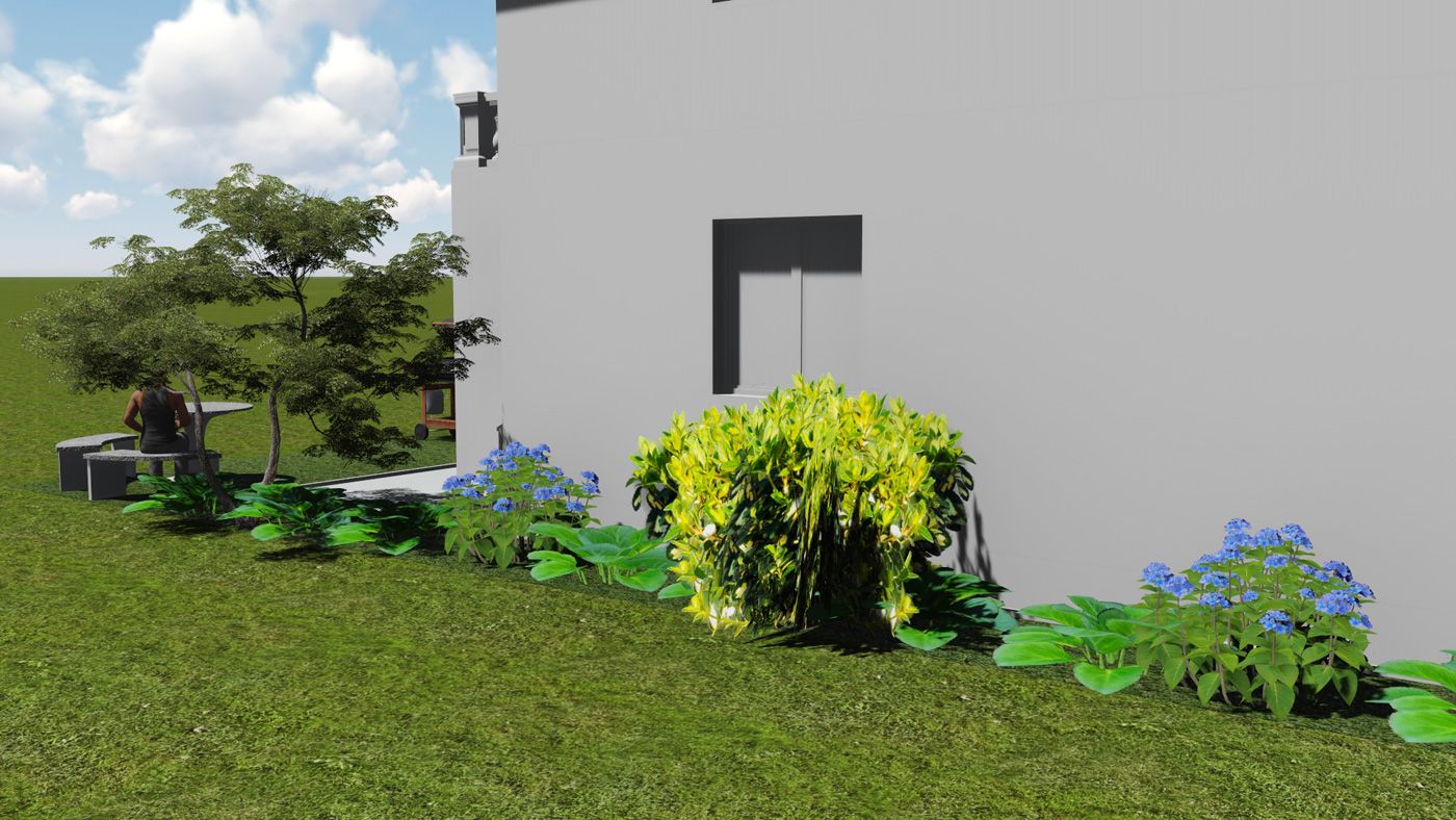 Теневая часть сада озеленена при помощи аукубы японской «Вариегата», хосты Зибольда «Элеганс», хосты подорожниковой «Хани Белз» и хосты гибридной «Биг Мама».