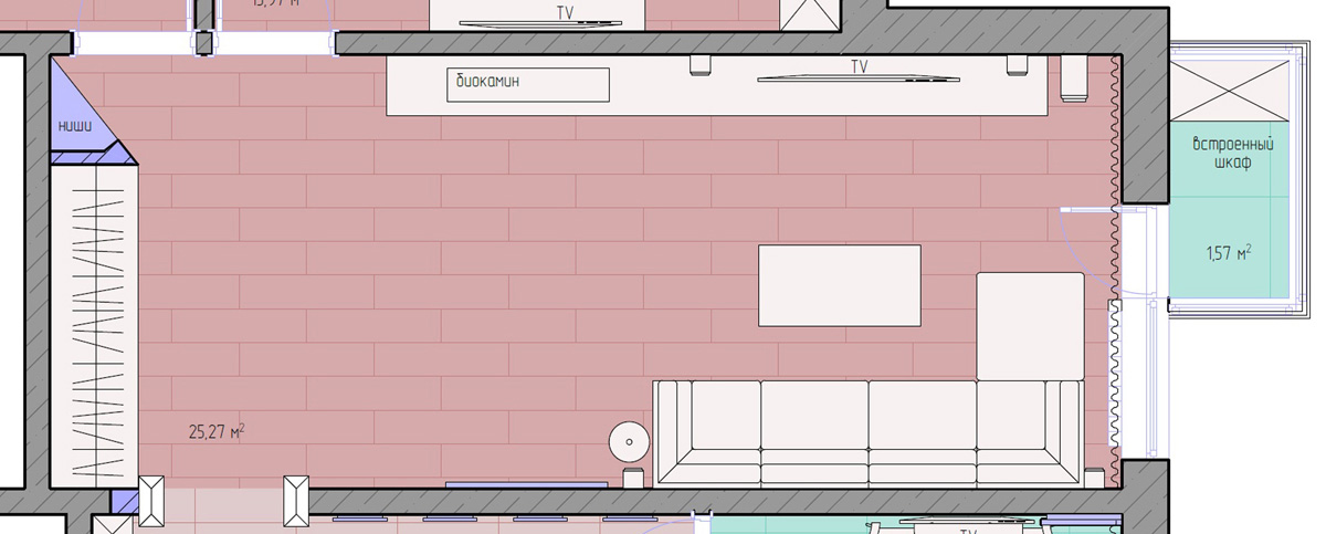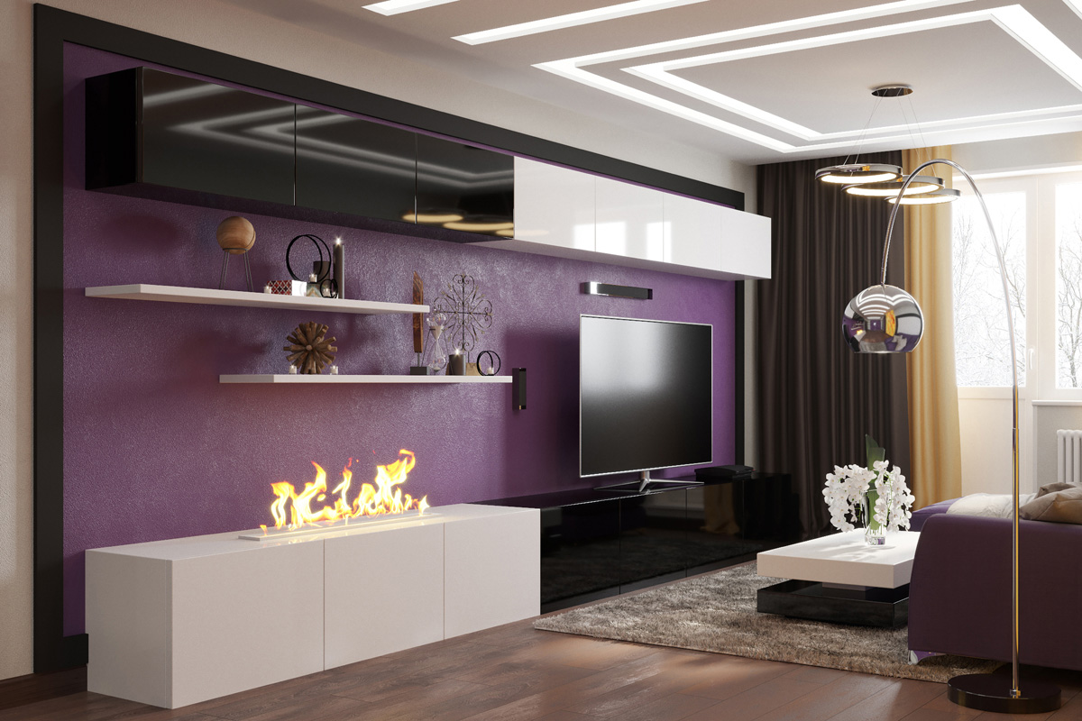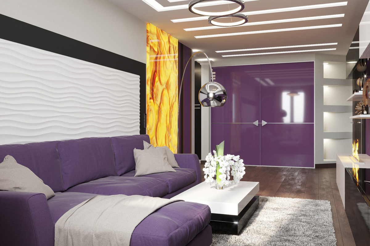 Интерьер задуман в богатом диапазоне бежево-коричневых оттенков с яркими акцентами фиолетового цвета.