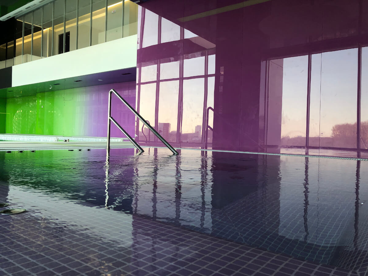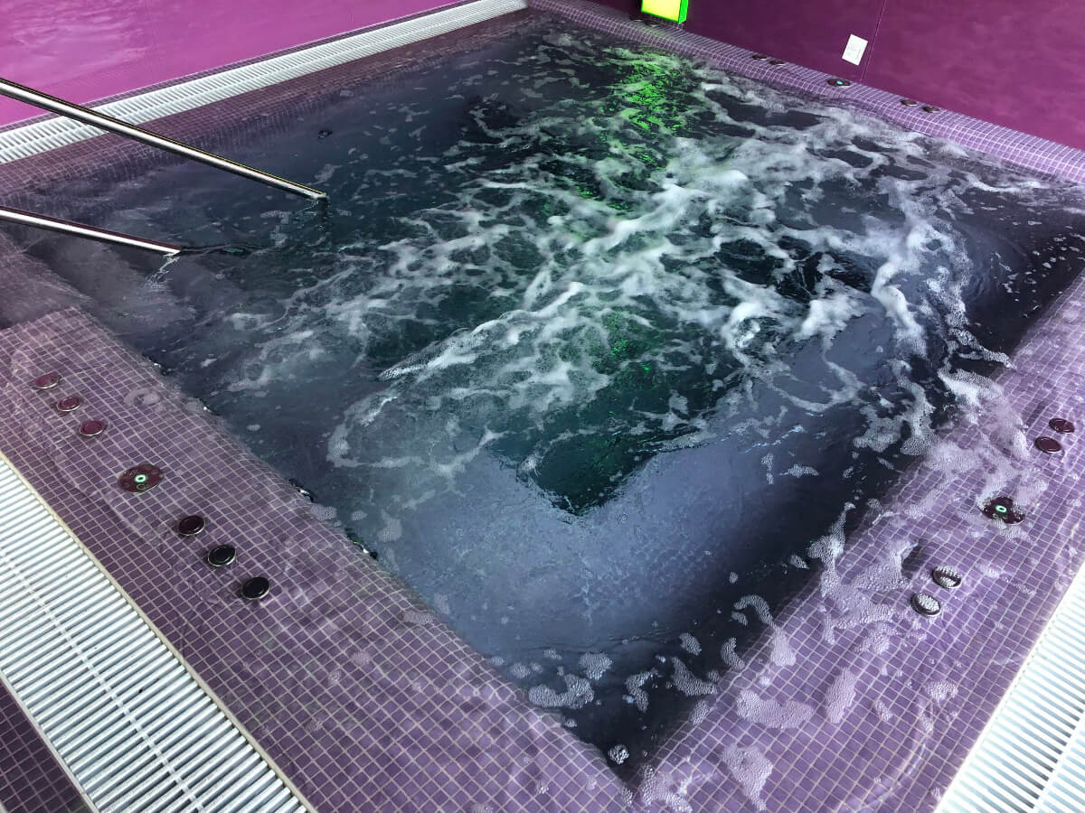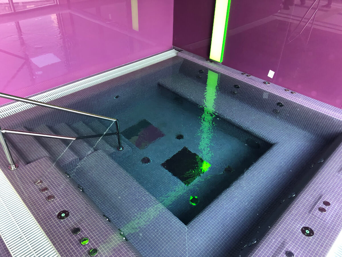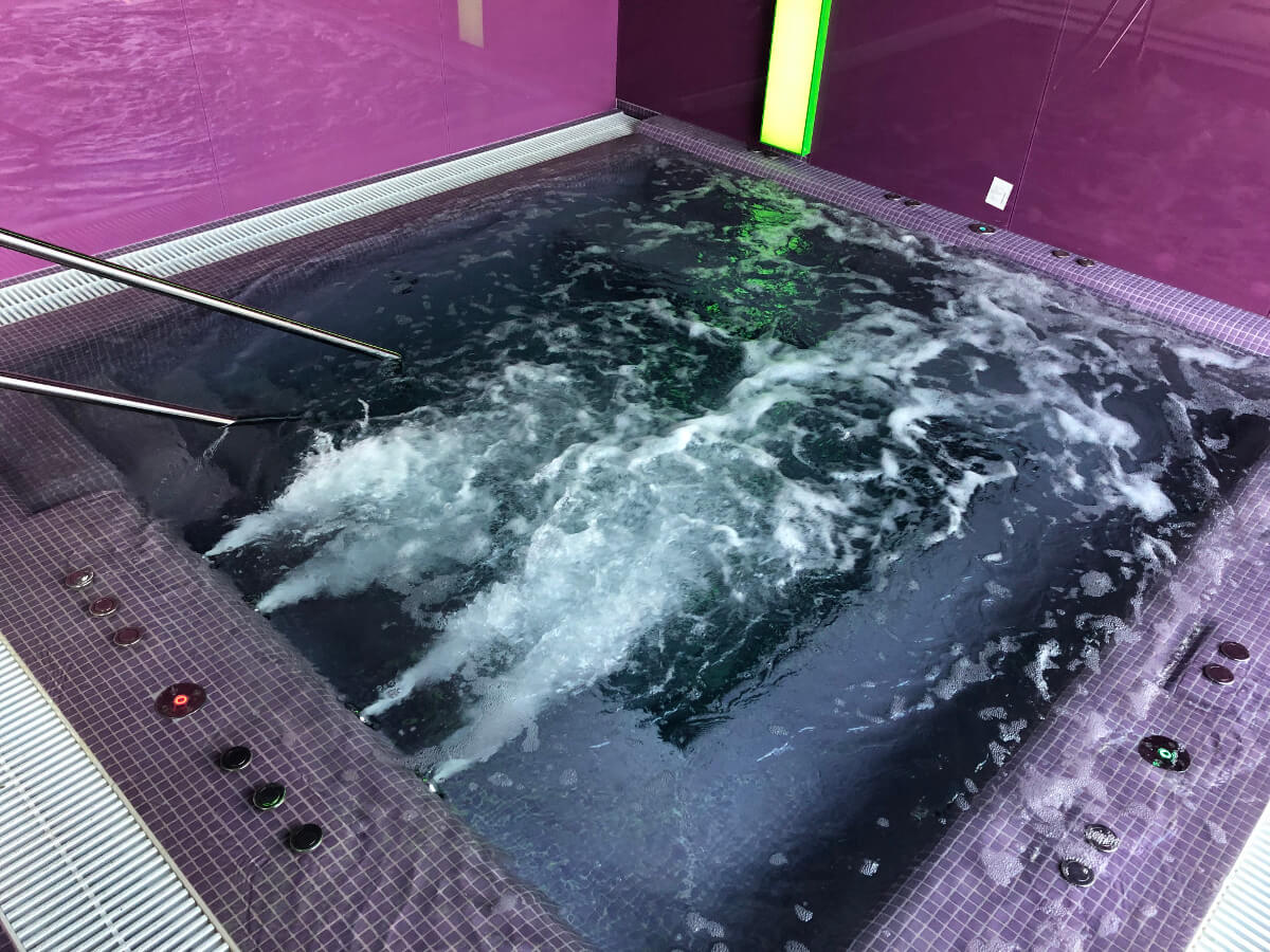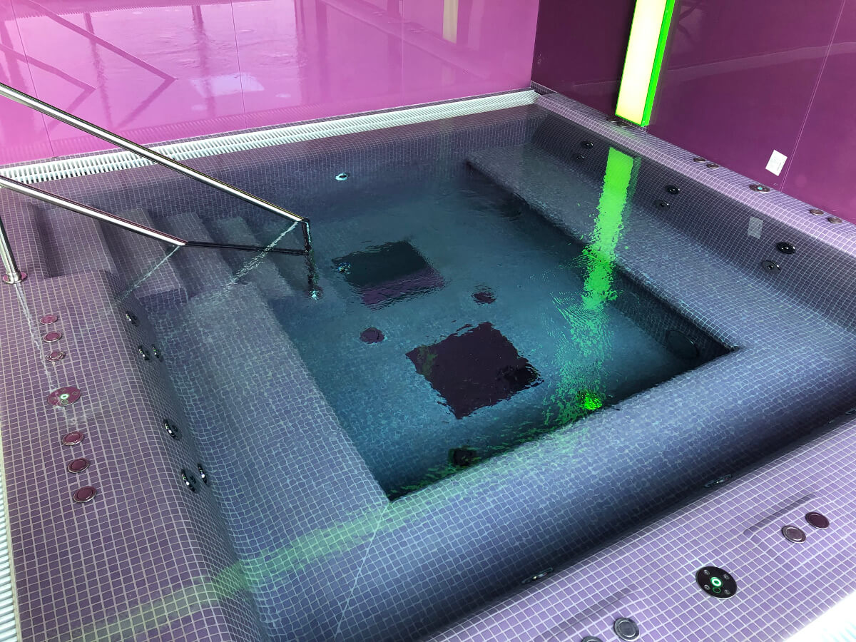 Гидромассажный бассейн 3,35 х 3,1 х 1,05 м, переливной. Сидения в чаше гидромассажного бассейна выполнены по индивидуальным лекалам, были разработаны инженерами компании с учетом анатомических особенностей человека.