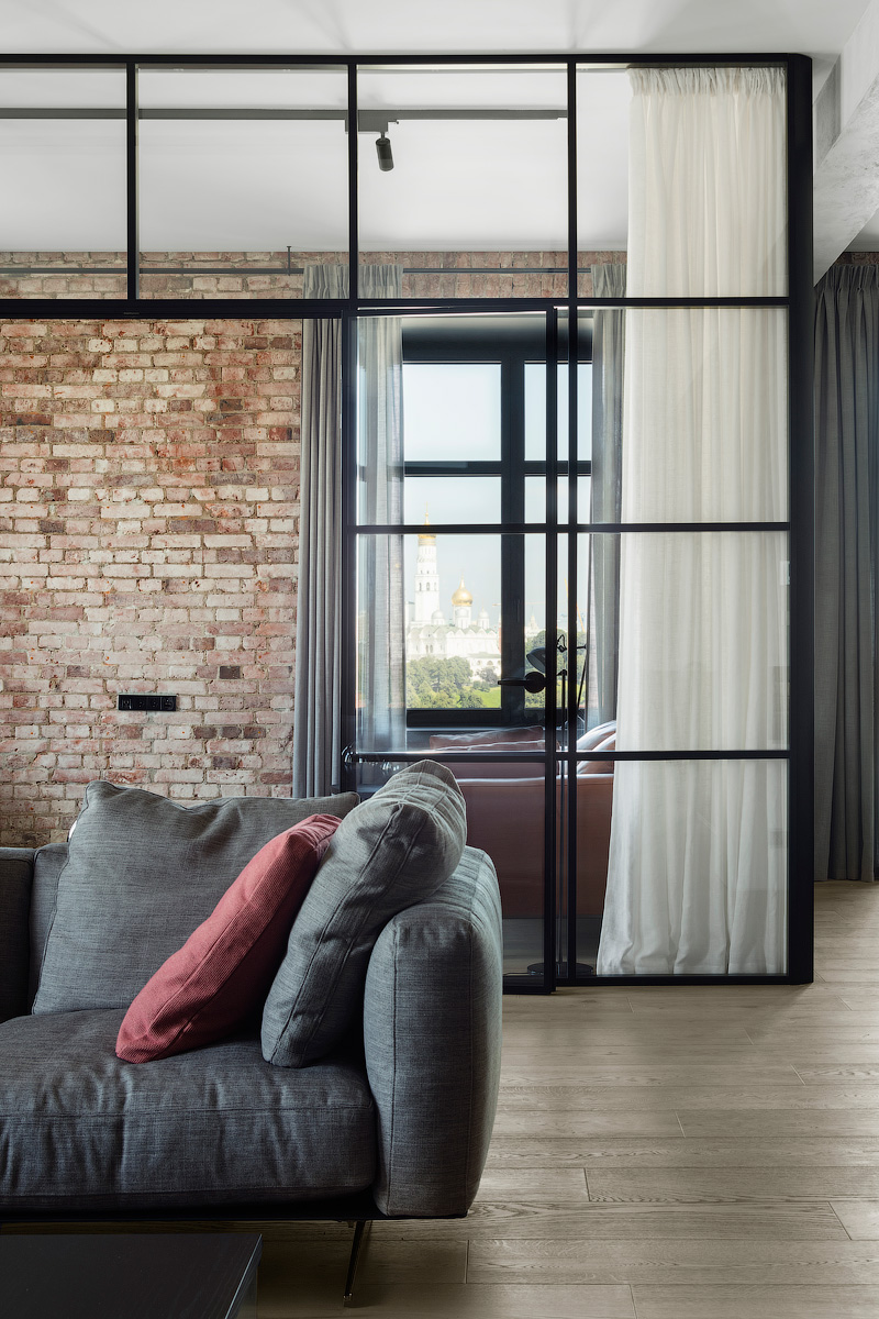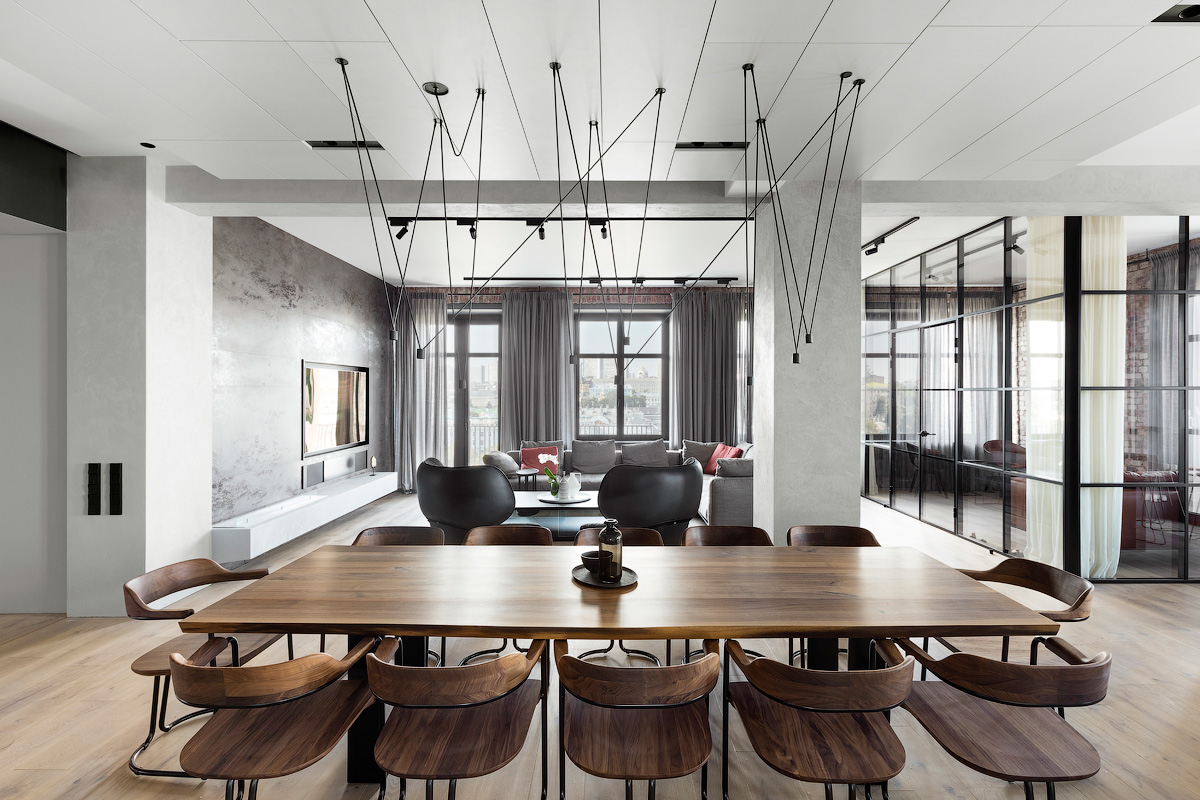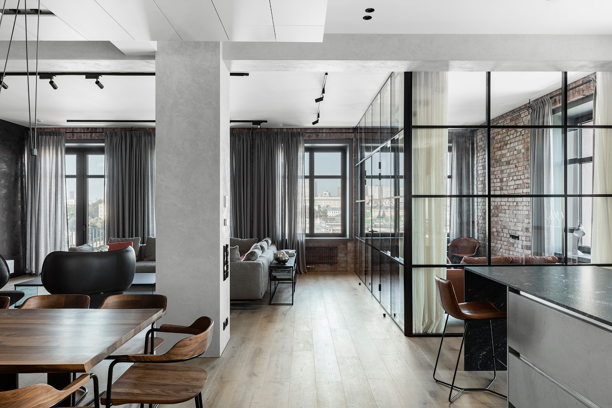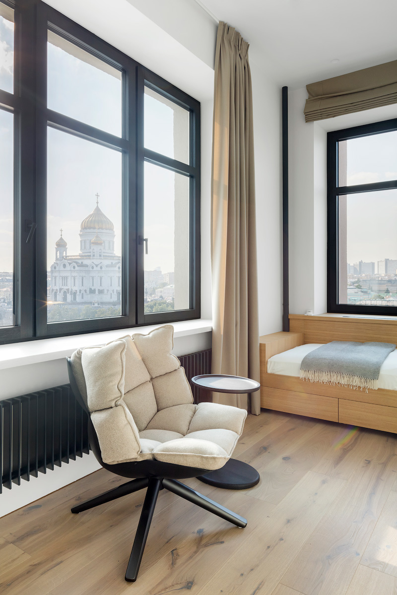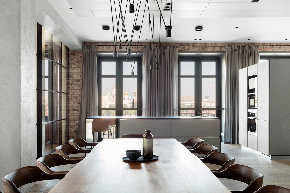 Квартира расположена в самом центре Москвы в Доме на набережной. Это жилой комплекс на Берсеньевской набережной Москвы-реки 1931 года постройки. Из квартиры открывается панорамный вид на исторический центр города: на Храм Христа Спасителя, набережную Москвы-реки, Кремль. Интерьерное решение пространства – это микс минимализма с элементами лофта. Квартира площадью 224 м² вмещает в себя гостиную-кухню-столовую, кабинет, 5 спален, 3 с/у и постирочную.