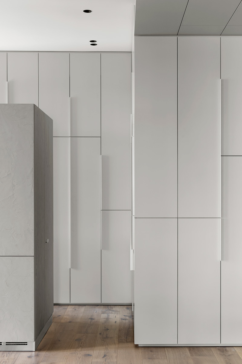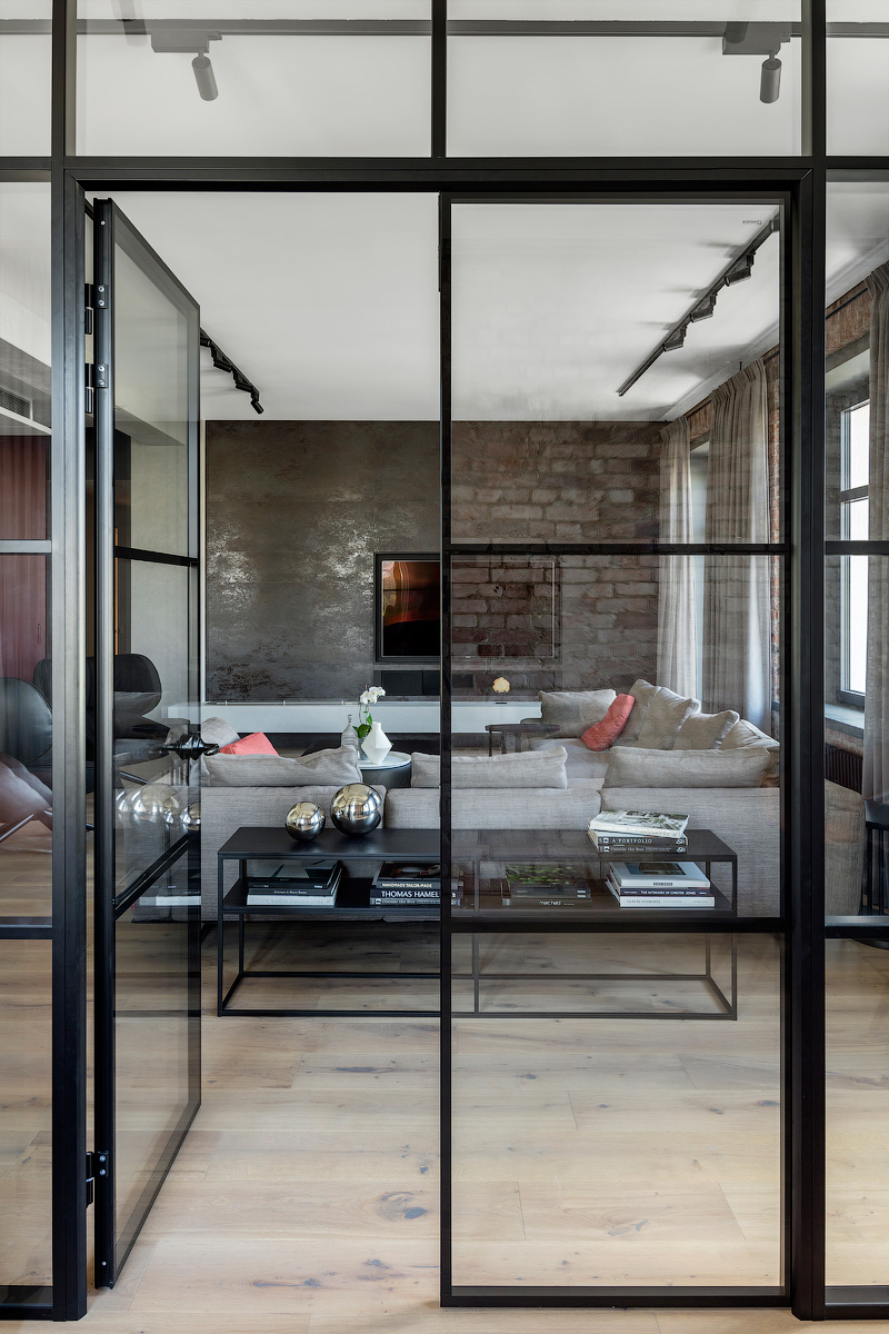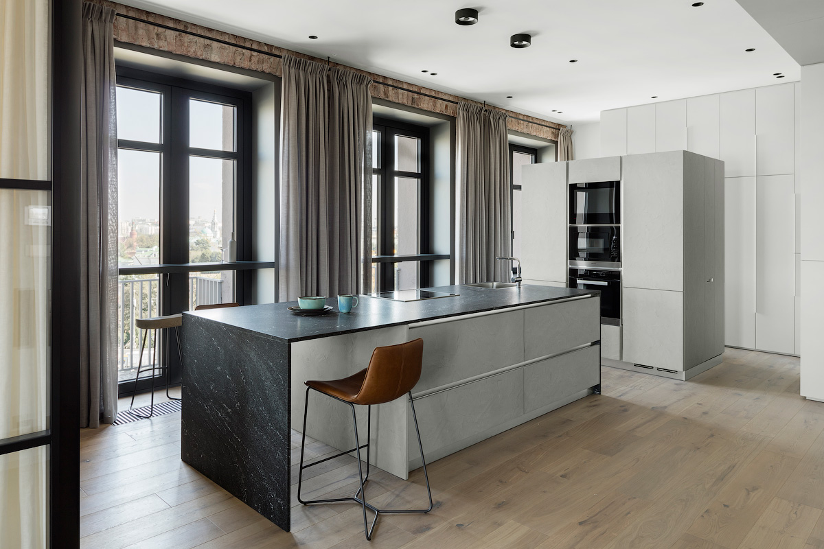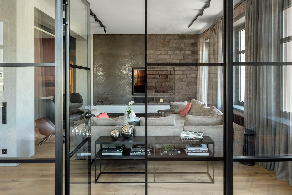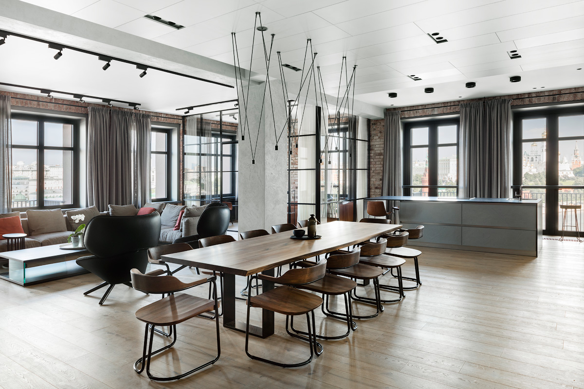 Квартира расположена в самом центре Москвы в Доме на набережной. Это жилой комплекс на Берсеньевской набережной Москвы-реки 1931 года постройки. Из квартиры открывается панорамный вид на исторический центр города: на Храм Христа Спасителя, набережную Москвы-реки, Кремль. Интерьерное решение пространства – это микс минимализма с элементами лофта. Квартира площадью 224 м² вмещает в себя гостиную-кухню-столовую, кабинет, 5 спален, 3 с/у и постирочную.