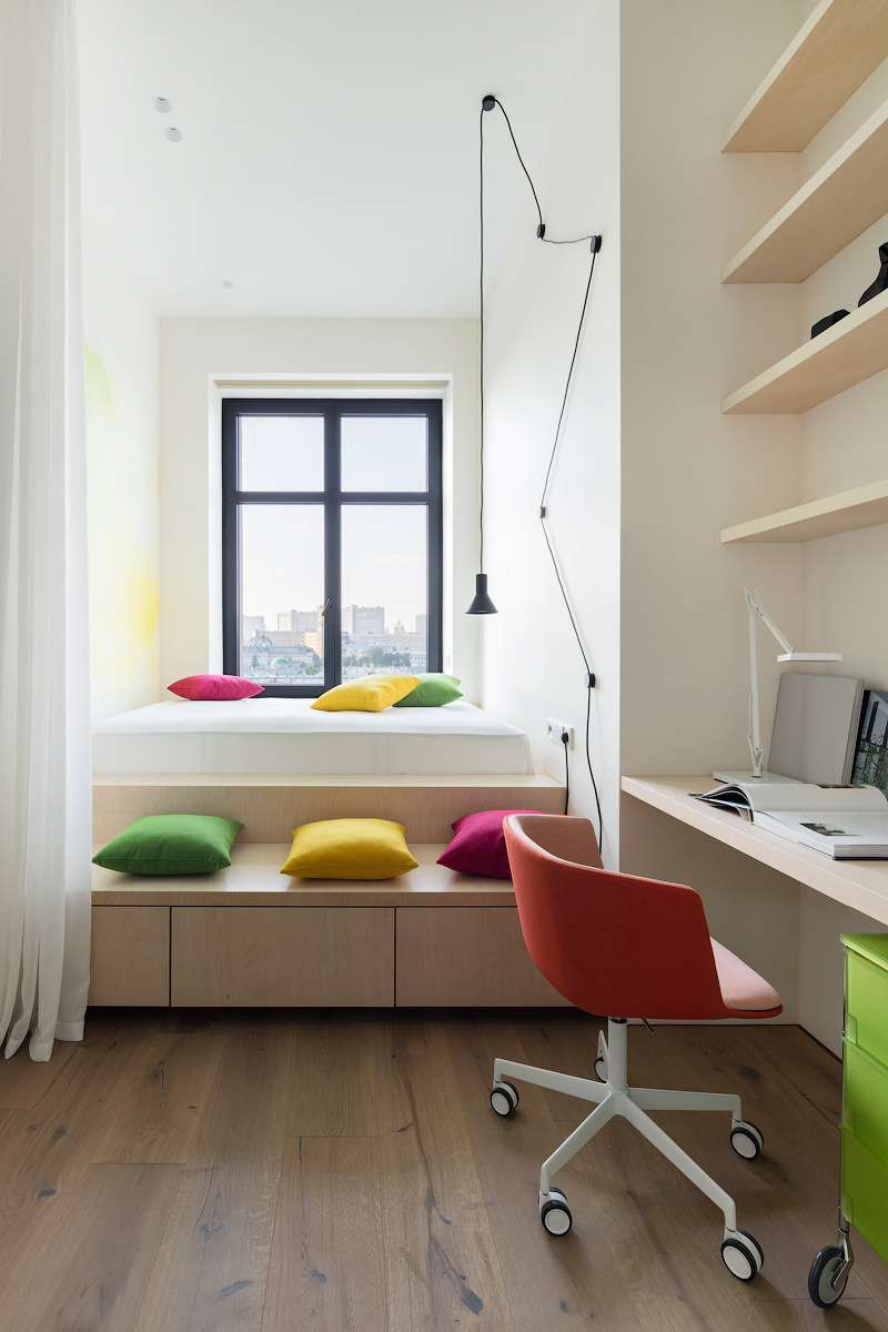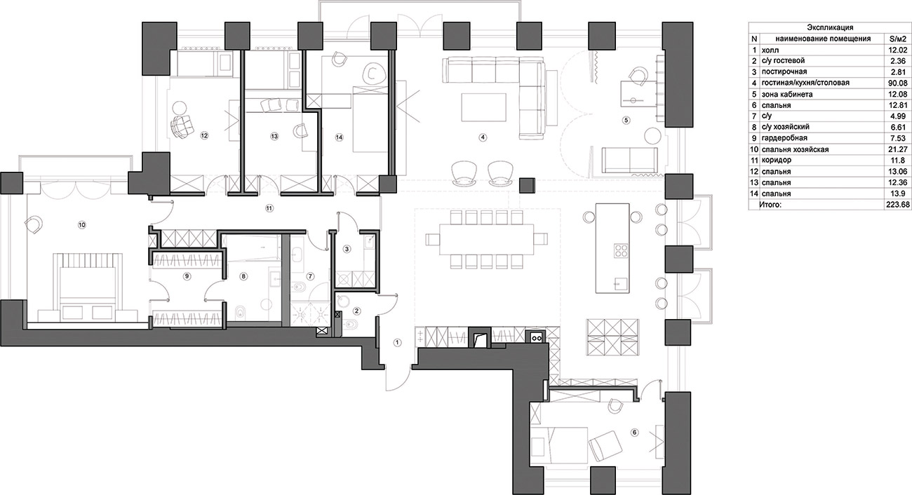 Совместно с заказчиком было принято решение большую часть пространства отдать под гостиную-кухню-столовую и разместить ее так, чтобы сохранить максимальный угол обзора на город. При этом удалось запланировать индивидуальные компактные, но функциональные детские и просторную хозяйскую зону с гардеробной и санузлом.