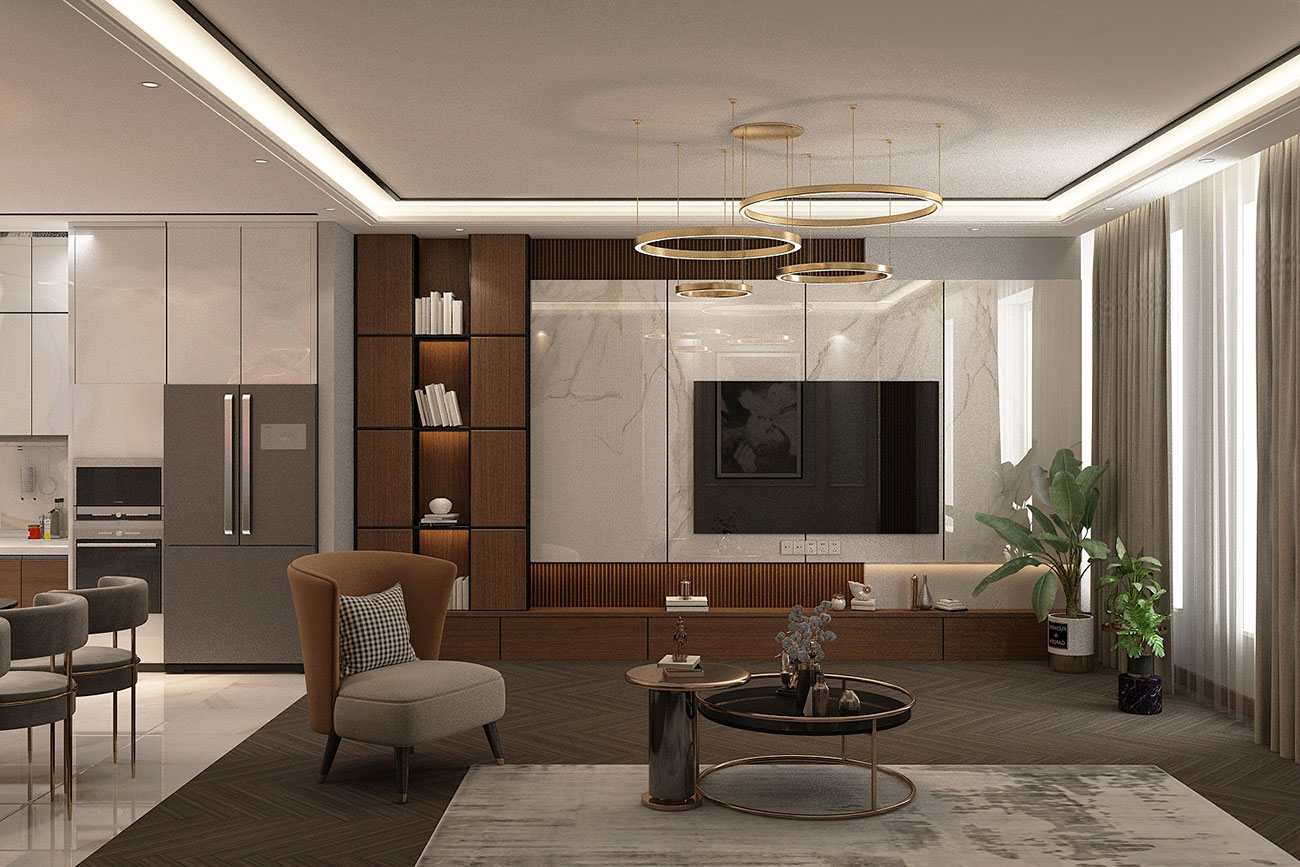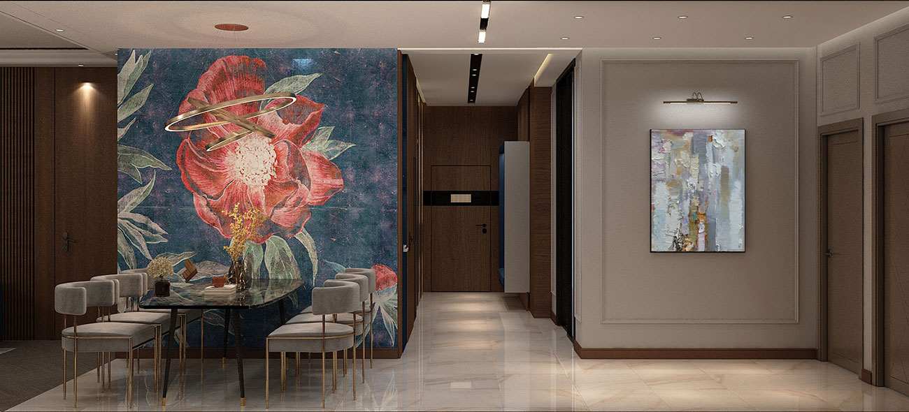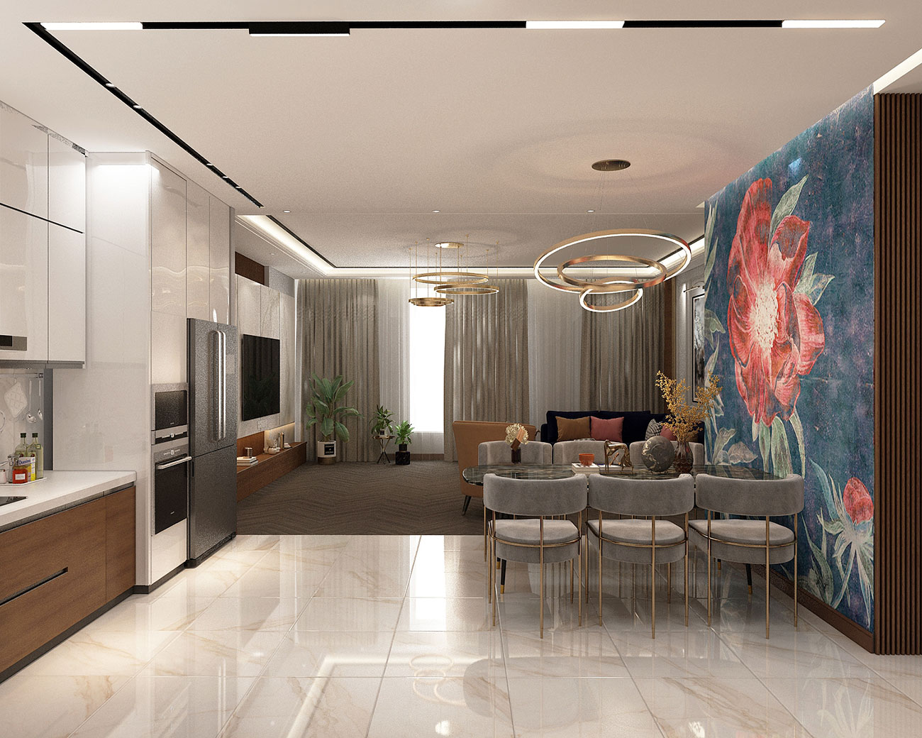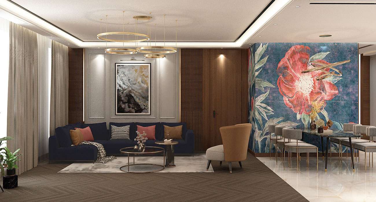 Стилистика проекта совмещает элементы стилей ар-деко и современного. Большинство мебели разработано под дизайн-проект и выполняется по индивидуальному заказу. В отделке используются шпонированные стеновые панели со вставками из латуни, гипсовые панели с тропическими мотивами и гипсовые молдинги, окрашенные в один цвет со стенами. Фотофреска с красным пионом в зоне столовой является акцентом всего интерьера. Синий цвет возникает в акцентах по всей общей зоне. Латунные вставки на панелях поддерживаются светильниками в цвете латунь.