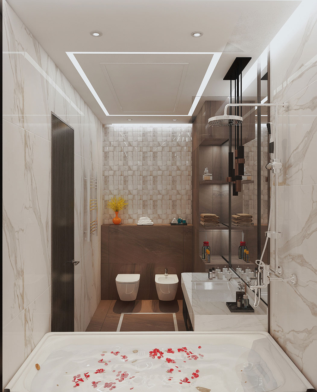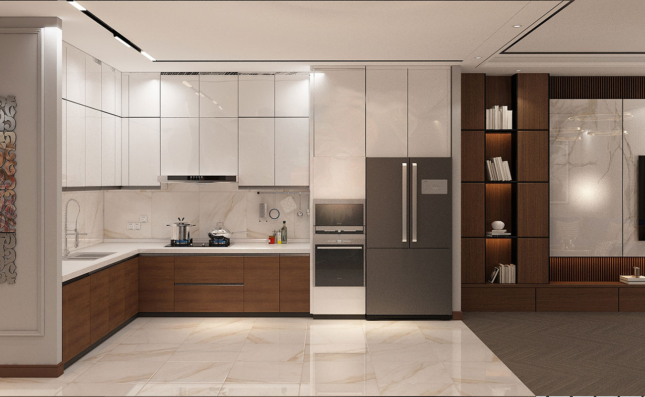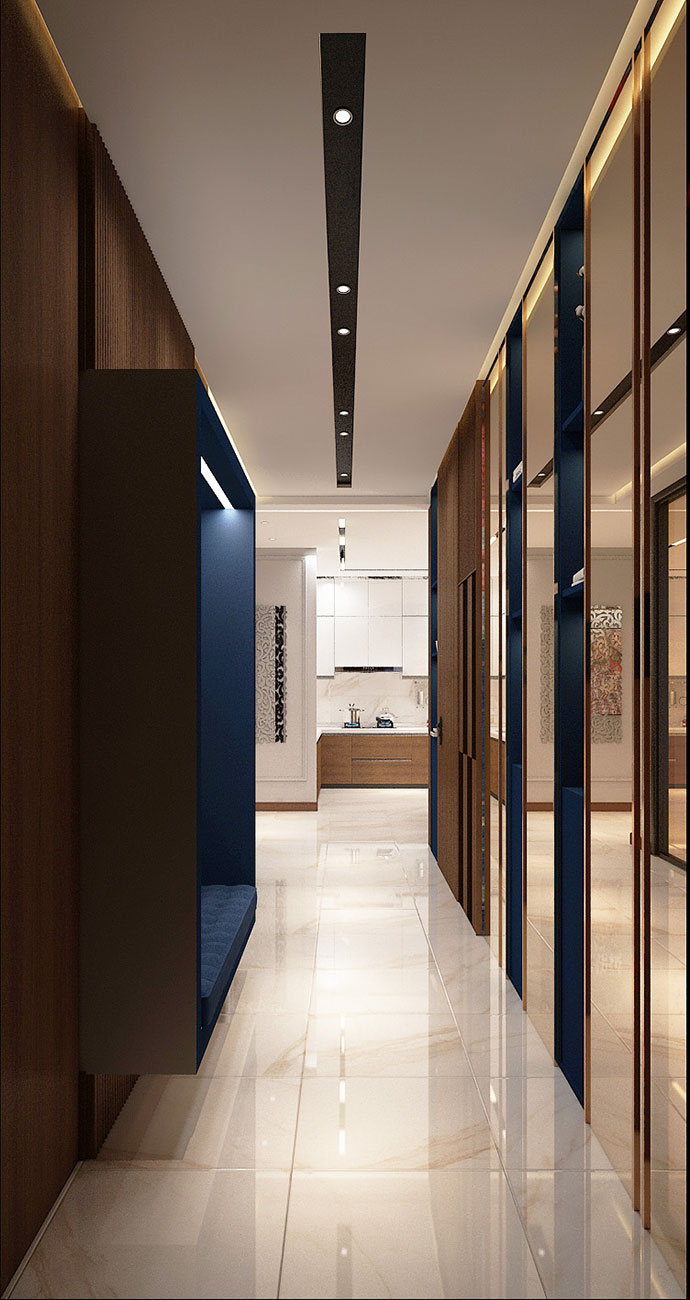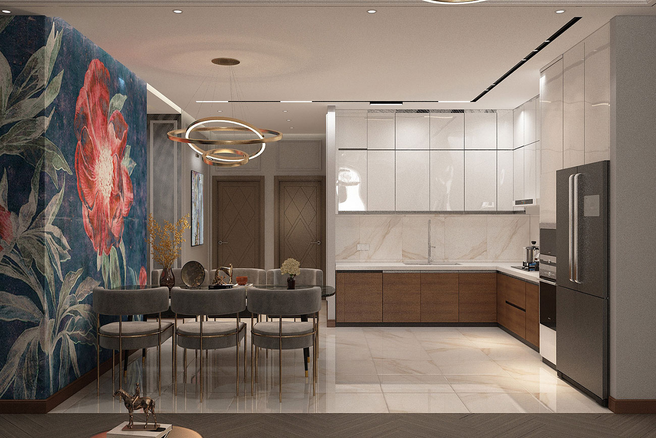 Стилистика проекта совмещает элементы стилей ар-деко и современного. Большинство мебели разработано под дизайн-проект и выполняется по индивидуальному заказу. В отделке используются шпонированные стеновые панели со вставками из латуни, гипсовые панели с тропическими мотивами и гипсовые молдинги, окрашенные в один цвет со стенами. Фотофреска с красным пионом в зоне столовой является акцентом всего интерьера. Синий цвет возникает в акцентах по всей общей зоне. Латунные вставки на панелях поддерживаются светильниками в цвете латунь.