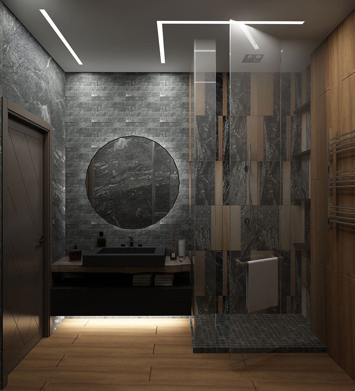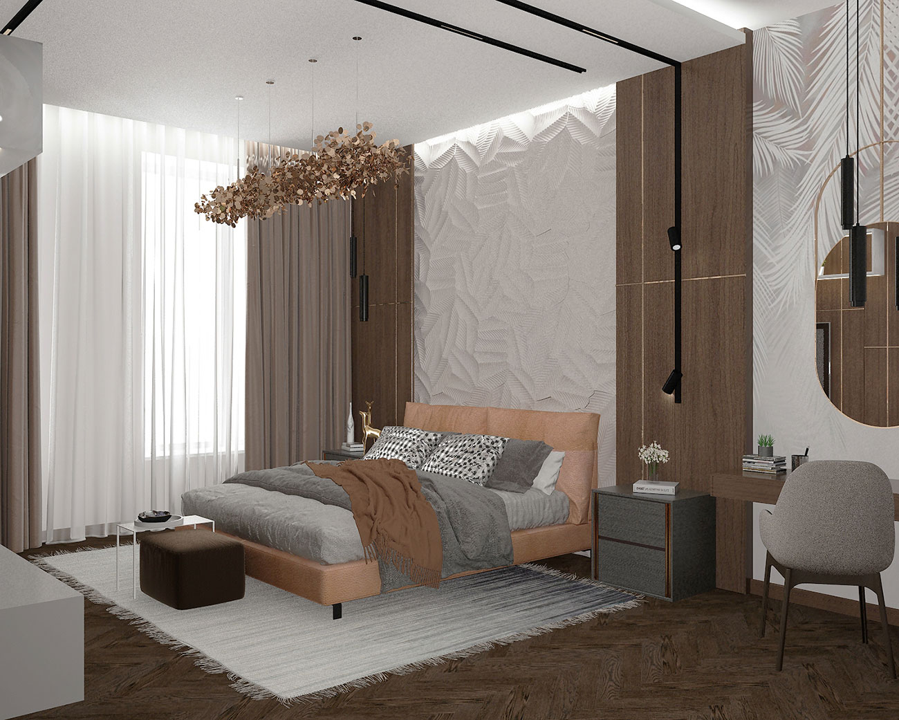 Все пожелания заказчиков были отражены в планировочном решении. Центром композиции квартиры является большое общее пространство: кухня, столовая и гостиная, которое отделяет спальню родителей от спален детей. В гостиной и большой угловой диван для всей семьи, и обеденная группа. В прихожей расположен шкаф-купе и отдельная гардеробная для верхней одежды. В детских комнатах предусмотрены письменные столы, кроватки и шкафы для вещей. В главной спальне предусмотрен личный санузел и гардеробная зона.