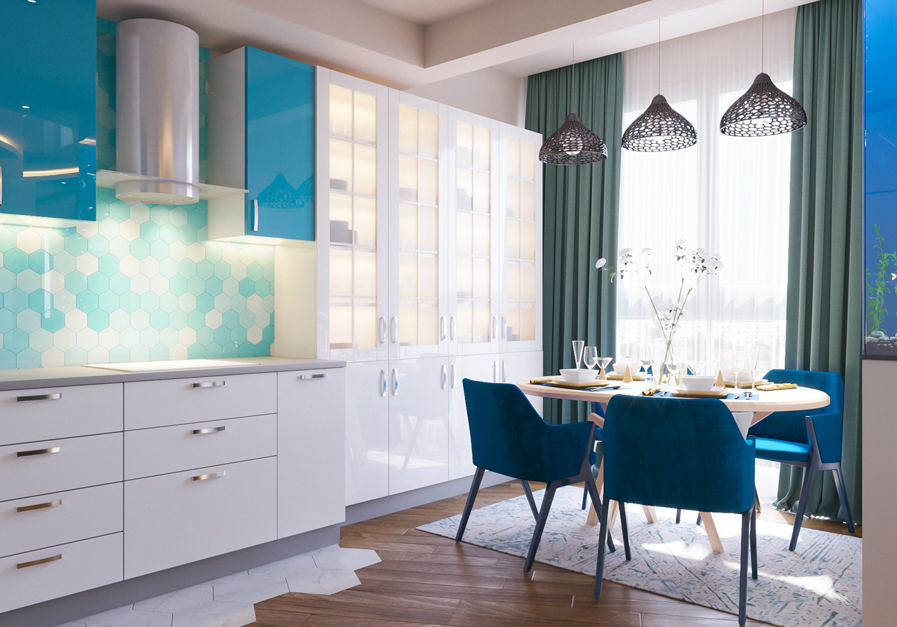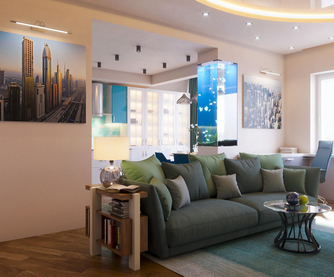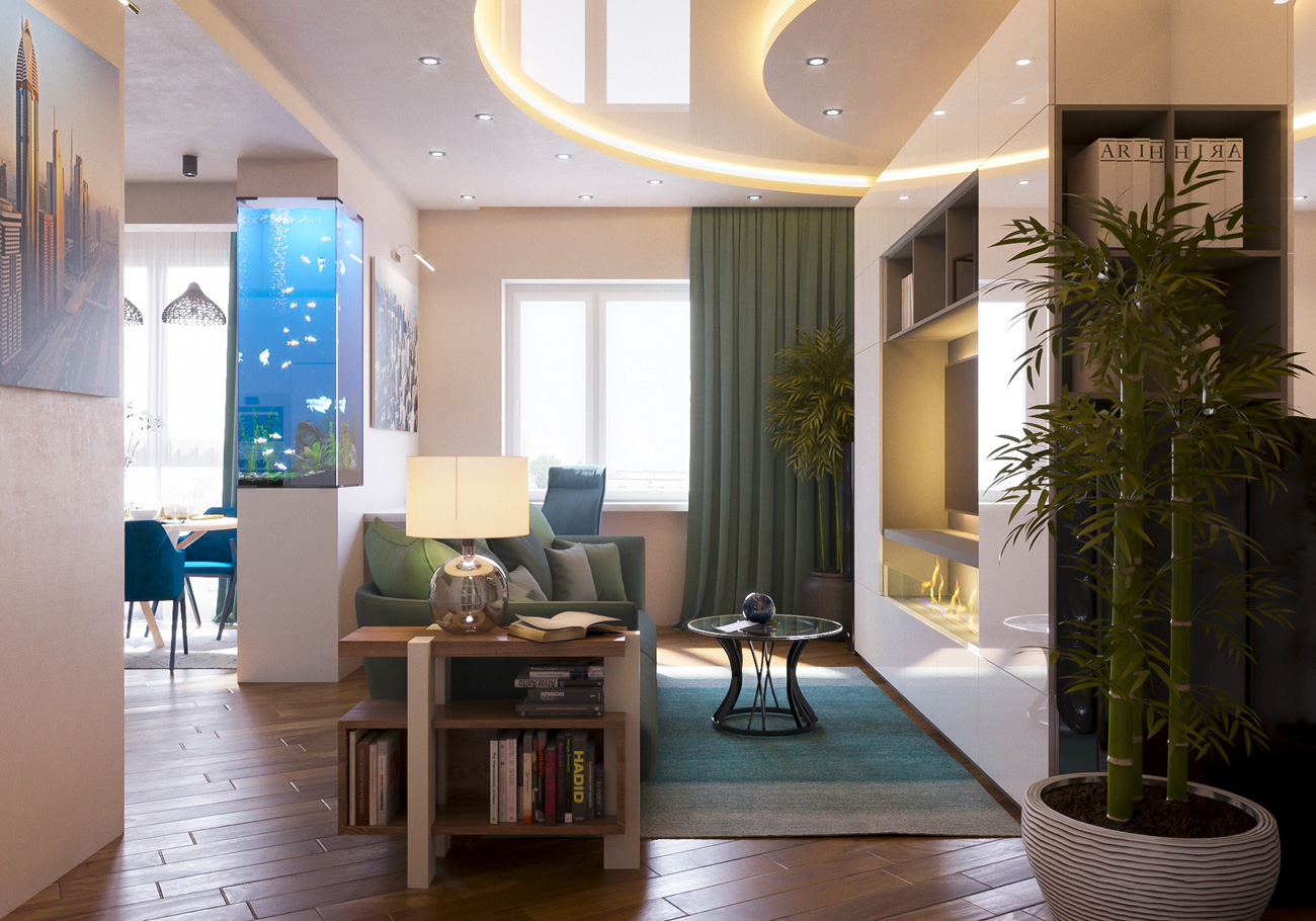 Важной доминантой обстановки является вертикальный аквариум, благодаря которому интерьер обретает легкость.