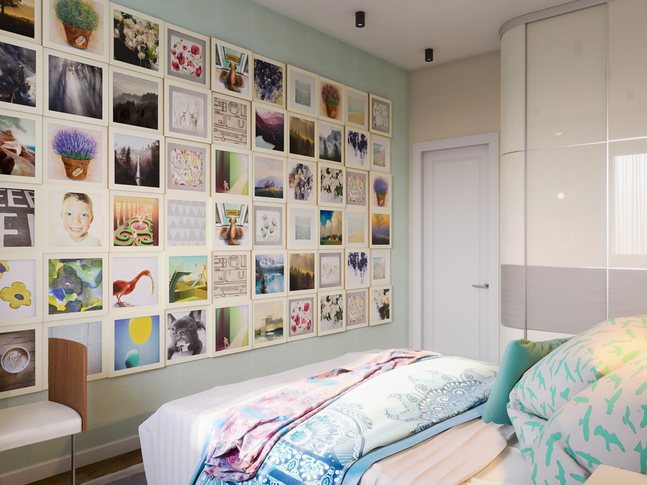 Спальня хозяев получилась очень уютной, одним из важных пожеланий владельцев было размещение семейных фотографий на стене.
