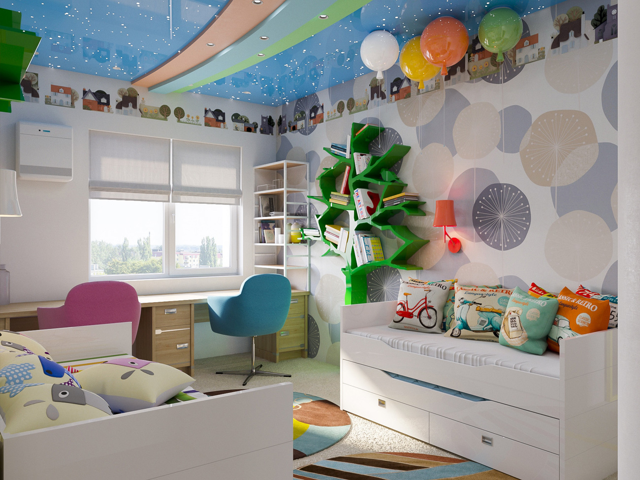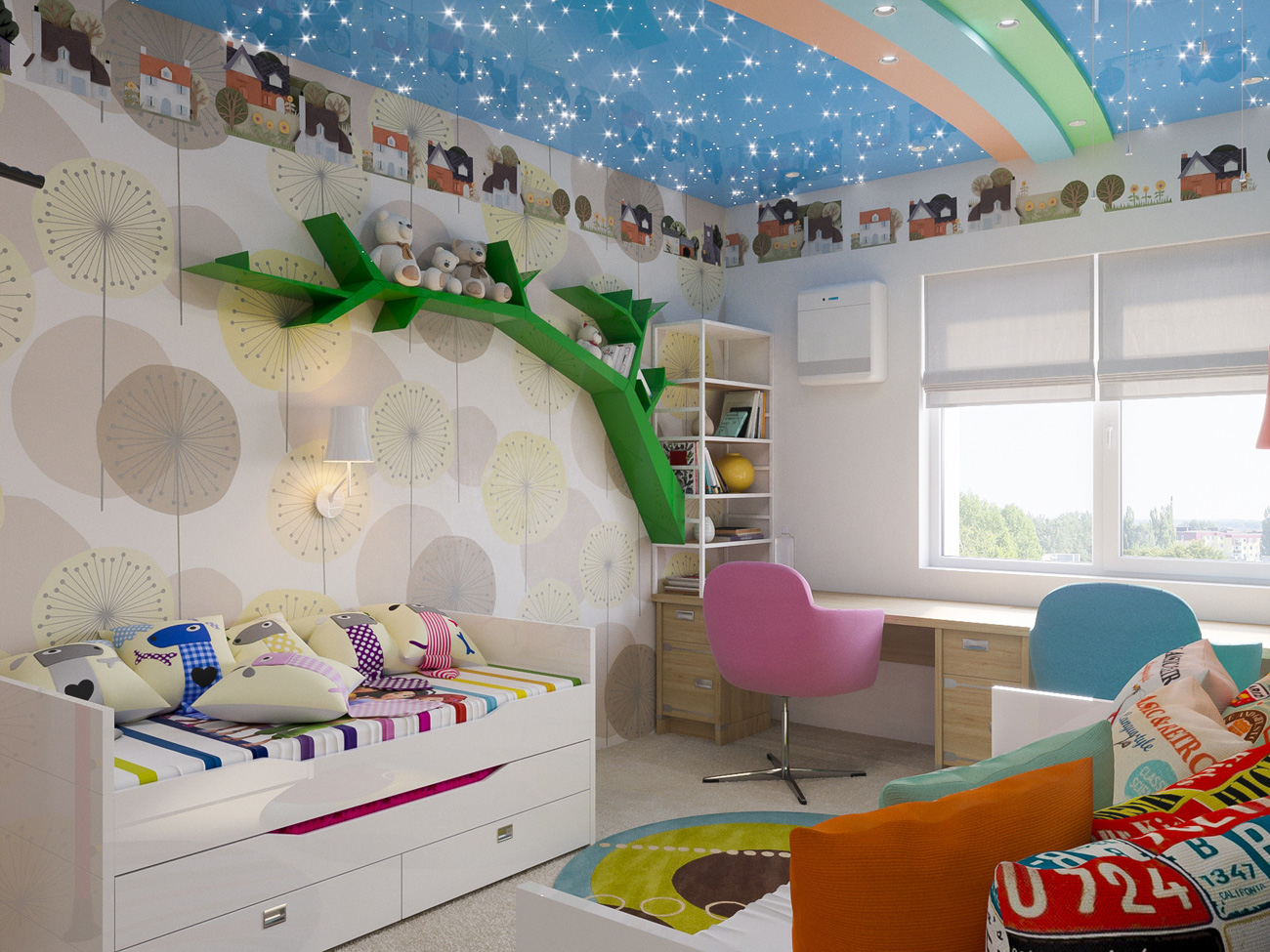 Интерьер детской выполнен в светлых тонах, выбранных юными обитателями квартиры. В этой комнате предусмотрено практически все для полноценного развития ребенка.