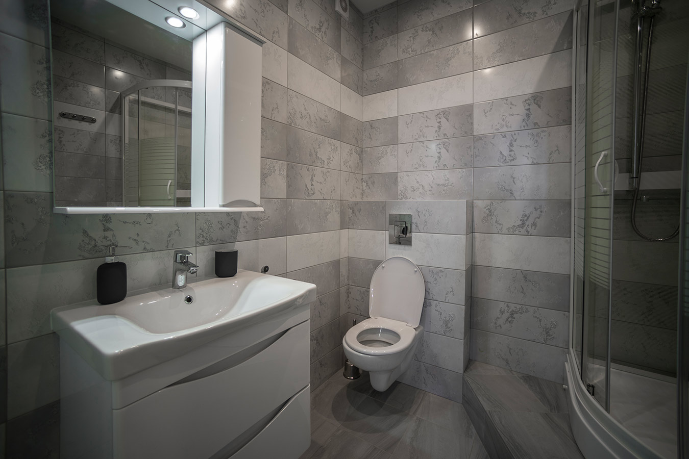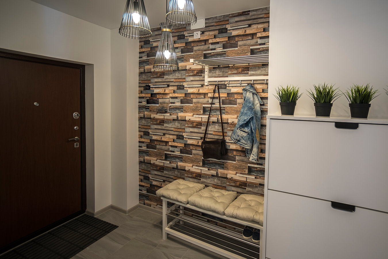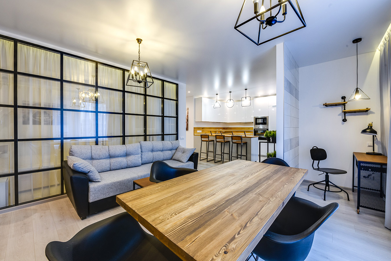 Интерьер получился современным и лаконичным. Палитра оформления включает в себя холодные оттенки белого и серого, но за счет добавления деревянных фактур, а также зеленого цвета в виде акцентов удалось смягчить созданный образ. Черные графичные элементы отсылают к лофту и являются лейтмотивом данного проекта.