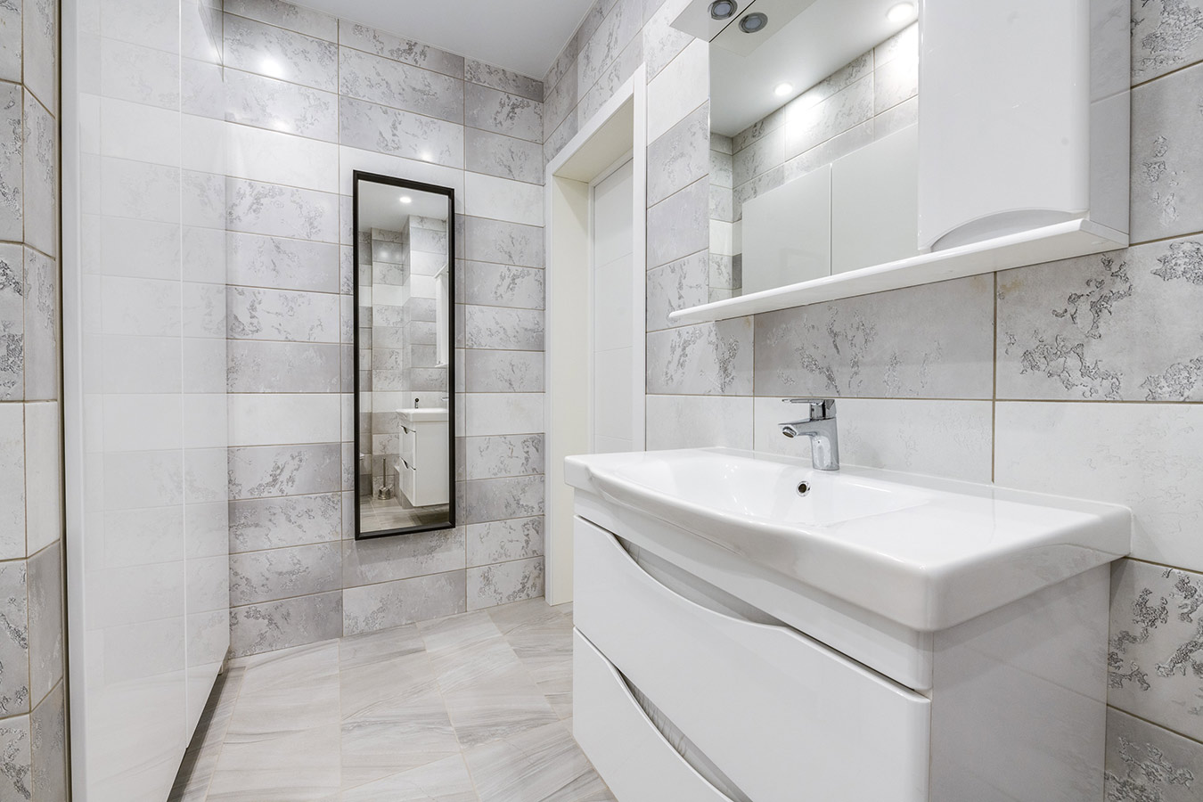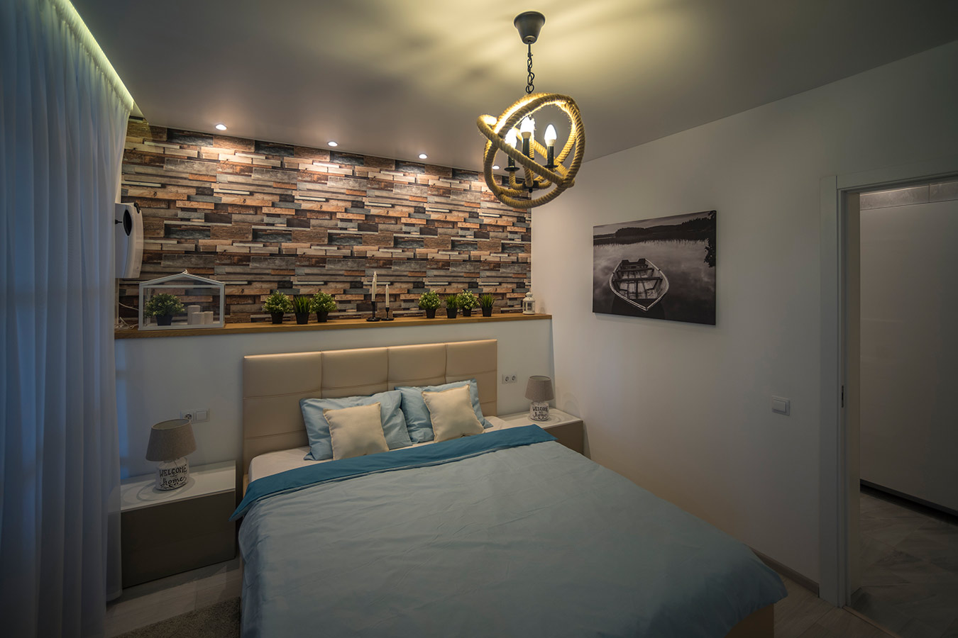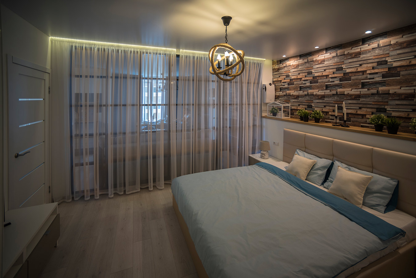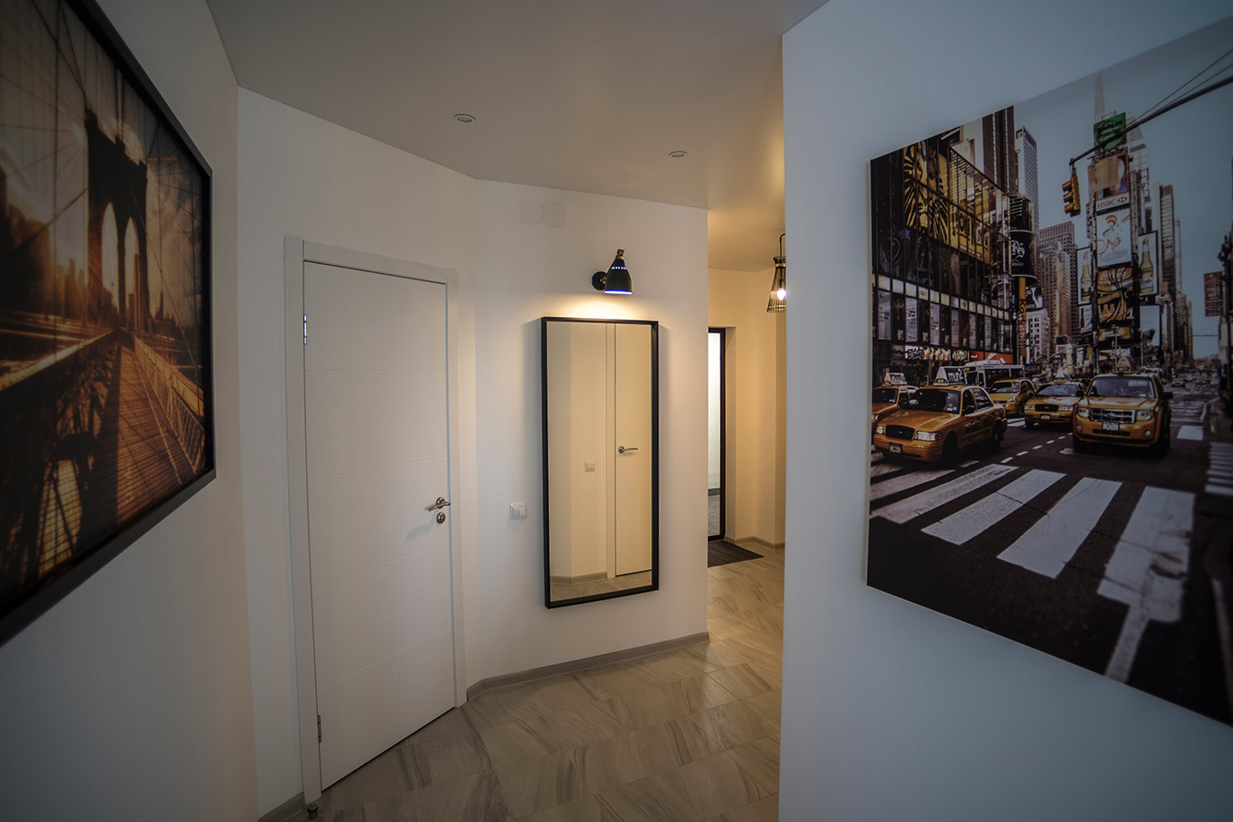 Благодаря грамотной перепланировке удалось рационально организовать пространство и обустроить в квартире следующие помещения: просторную гостиную, объединенную с кухней, спальню с собственной ванной комнатой, небольшой кабинет, отдельную гардеробную и гостевой санузел.