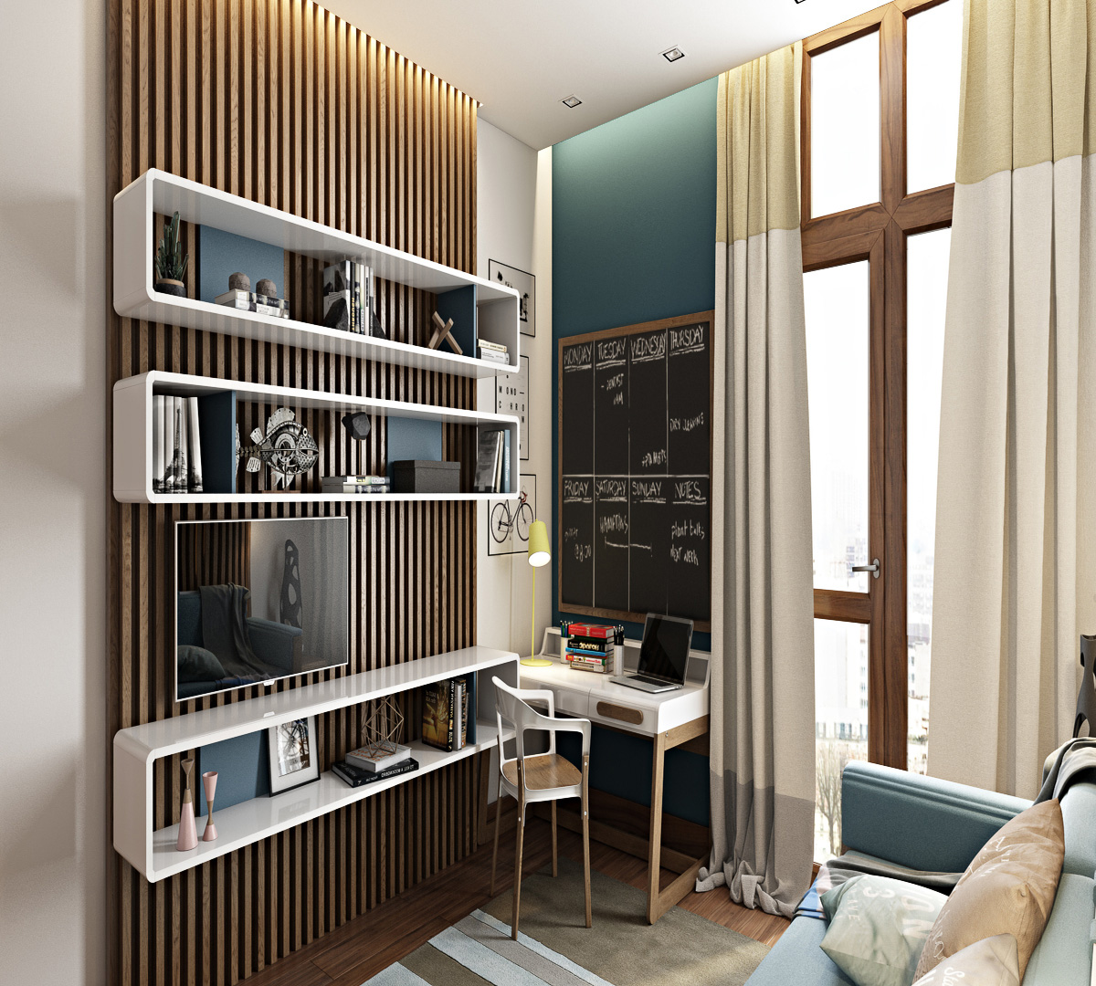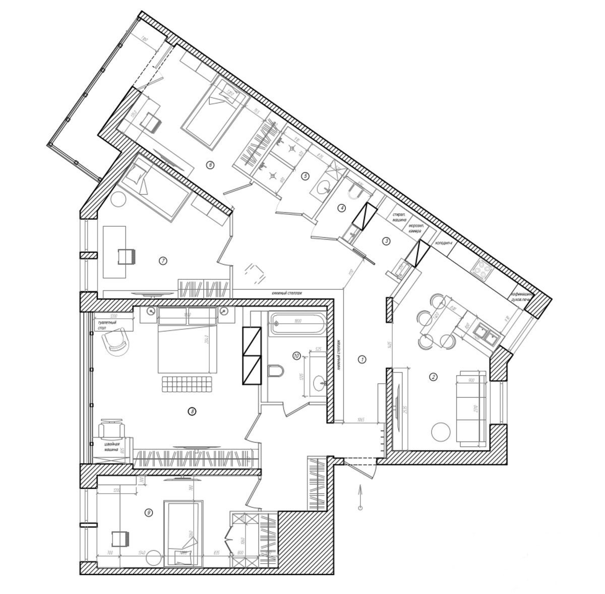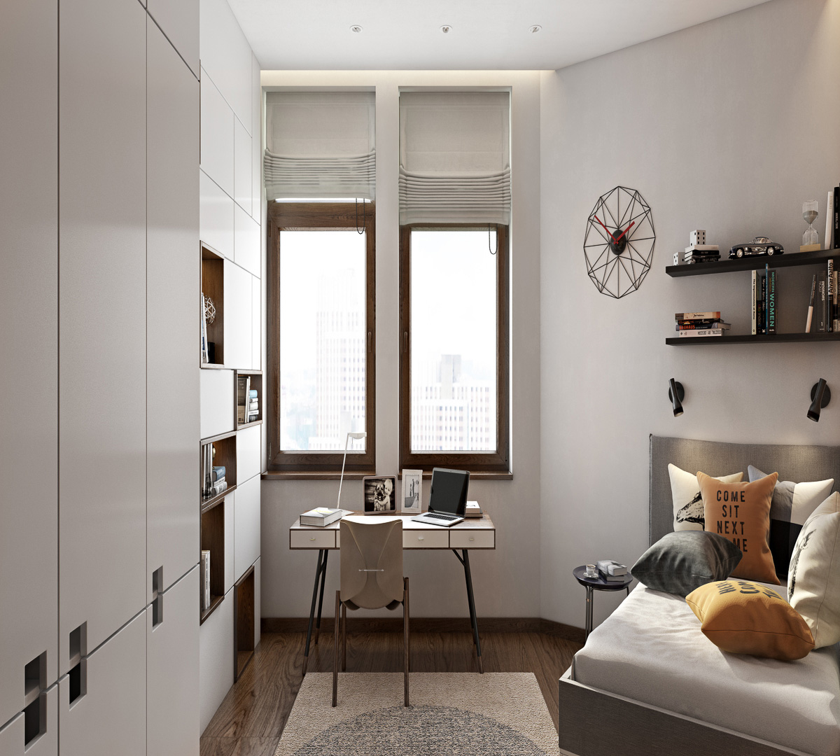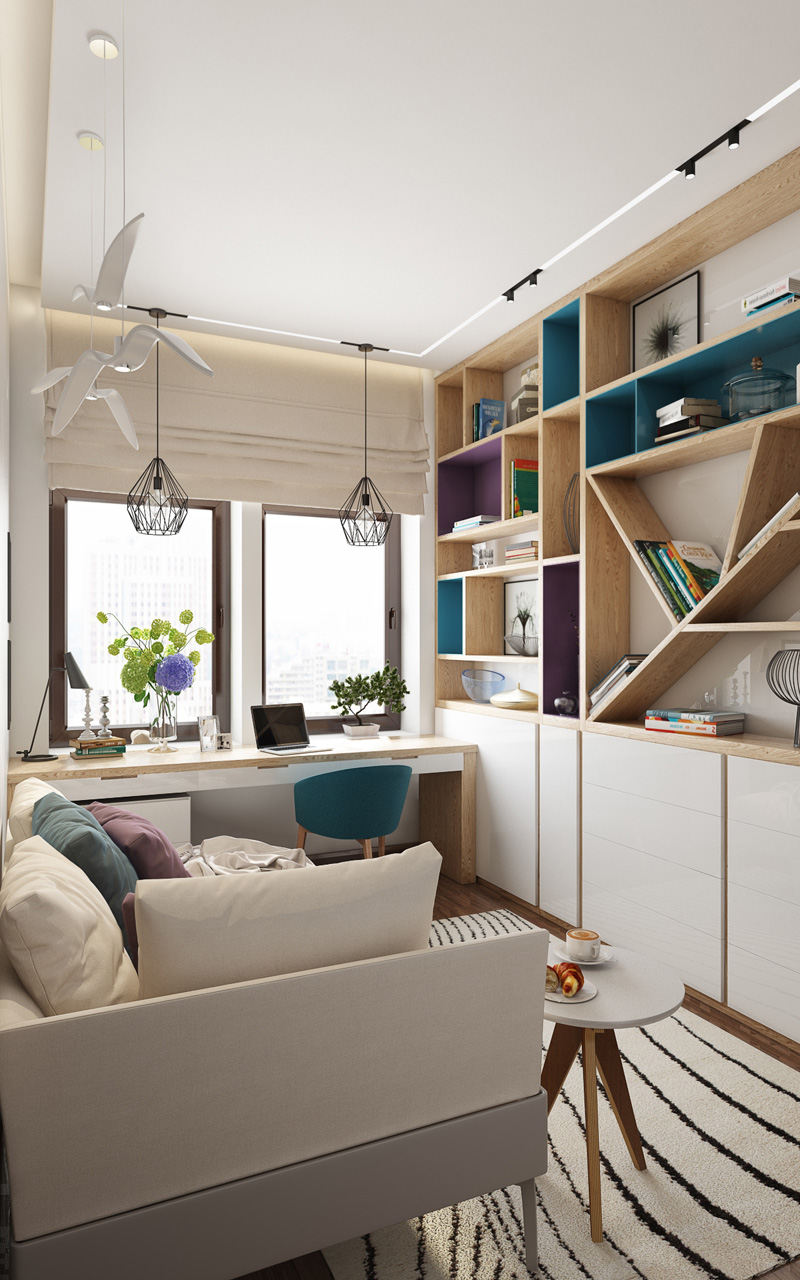 Прямые линии, однотонные, местами нежные цвета присутствуют в отделке и текстиле.