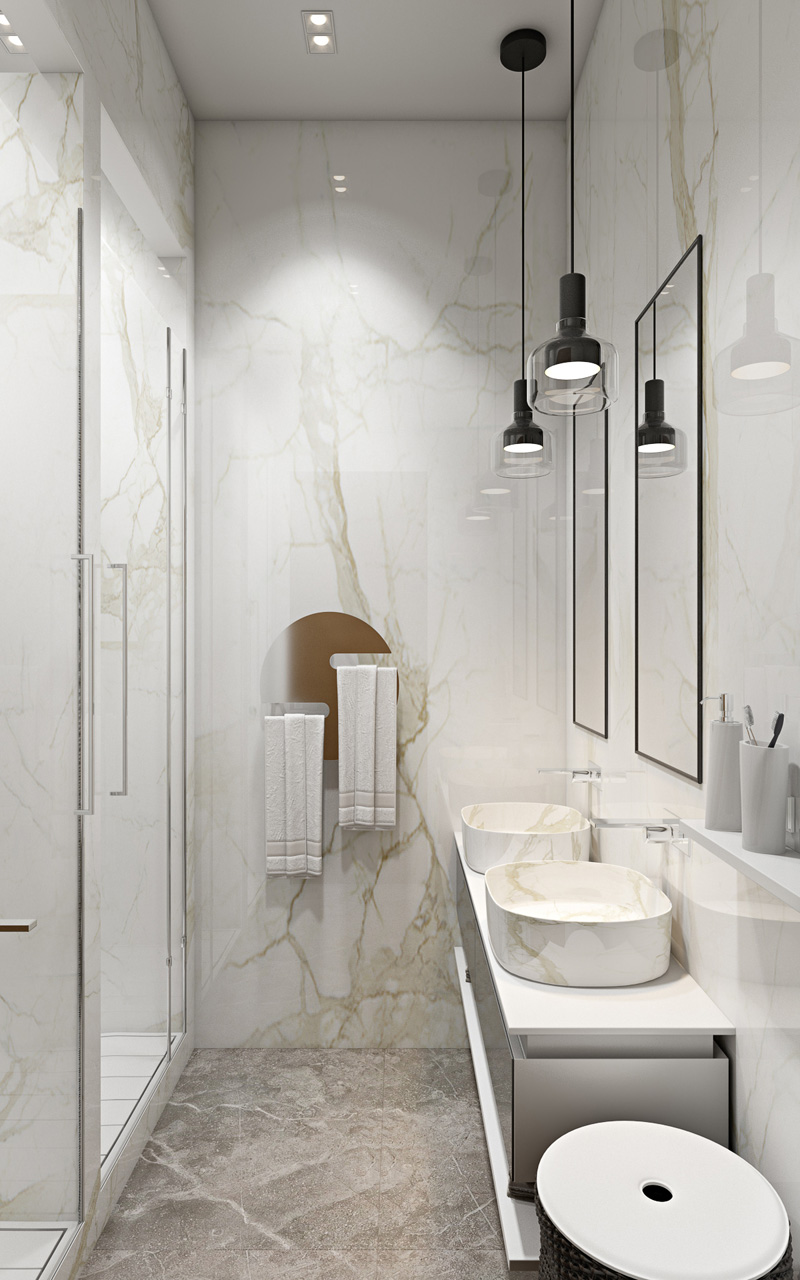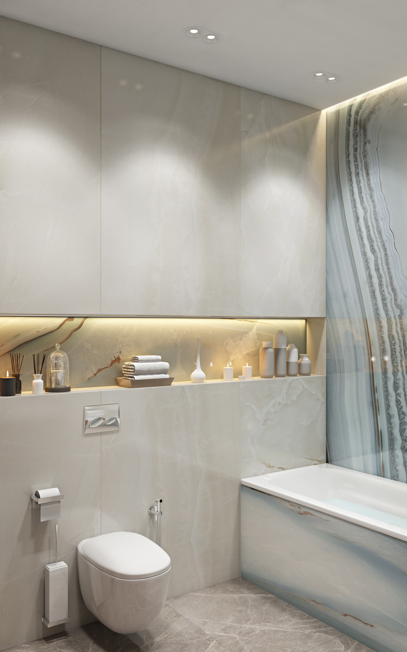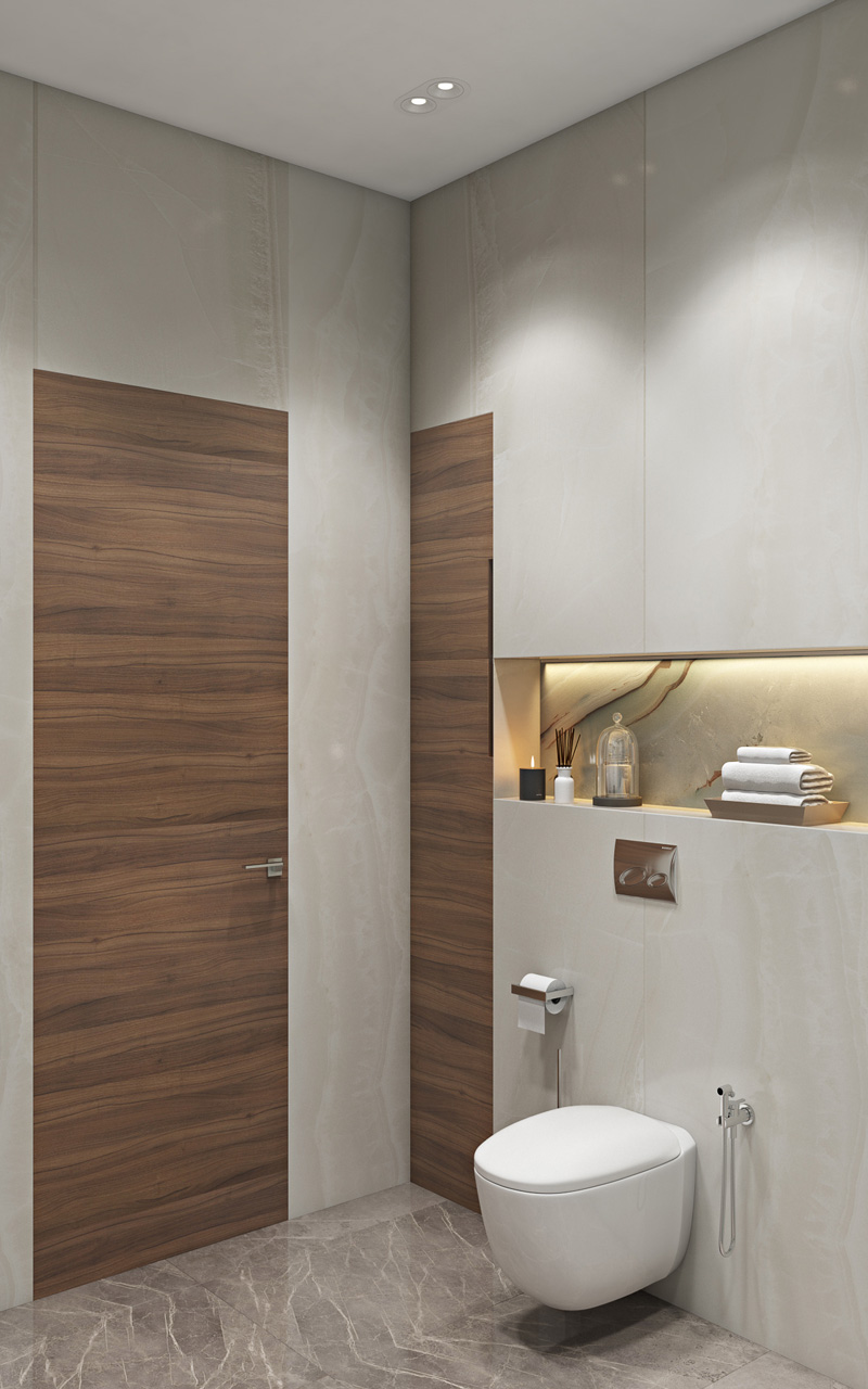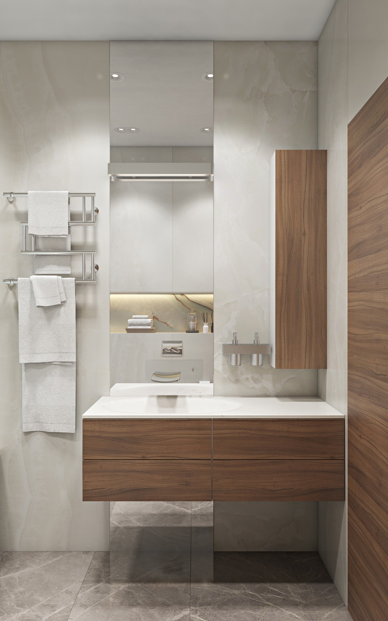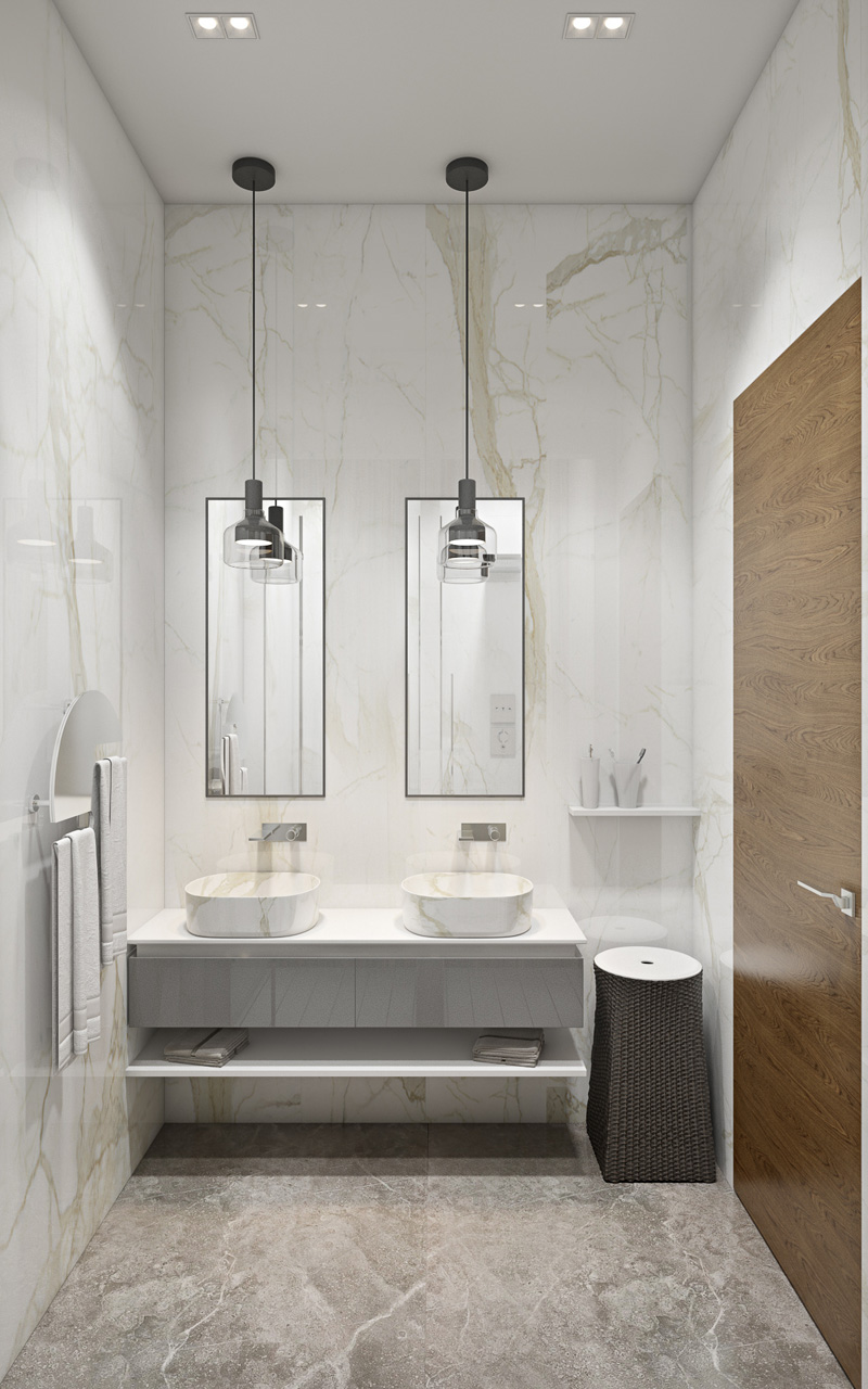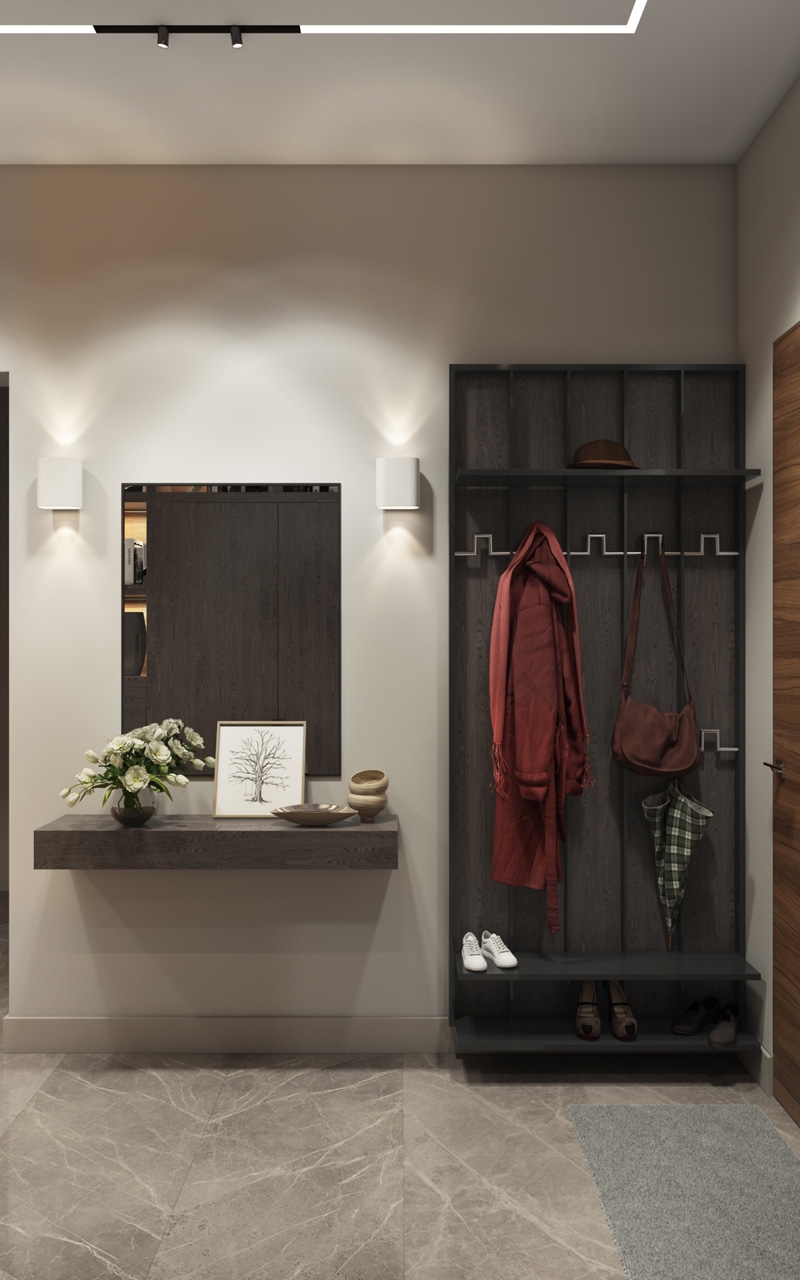 Дизайн пропитан глубоким спокойствием. В цветовом решении доминируют натуральные благородные цвета и материалы, оттенки серого, коричневого, голубого.