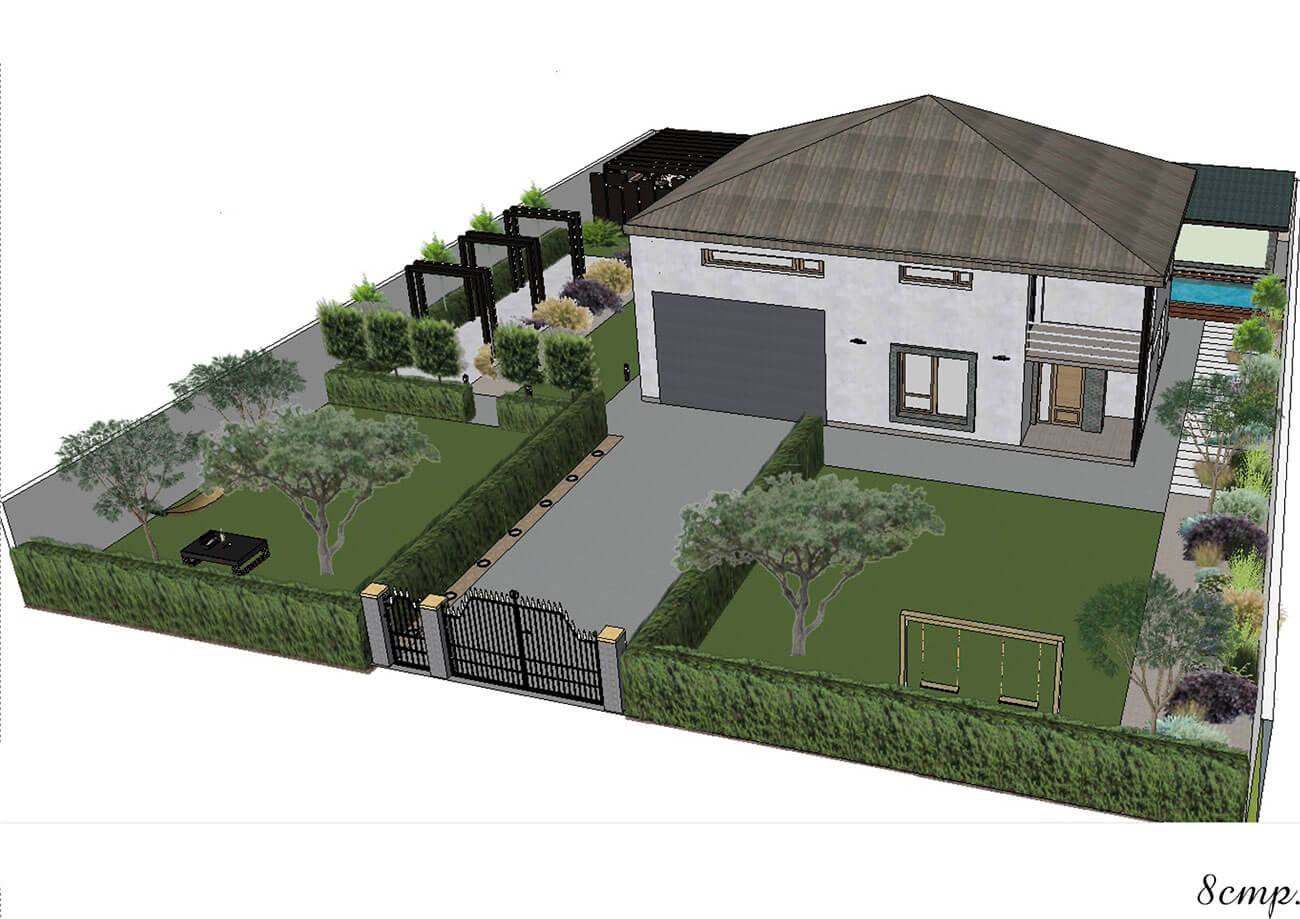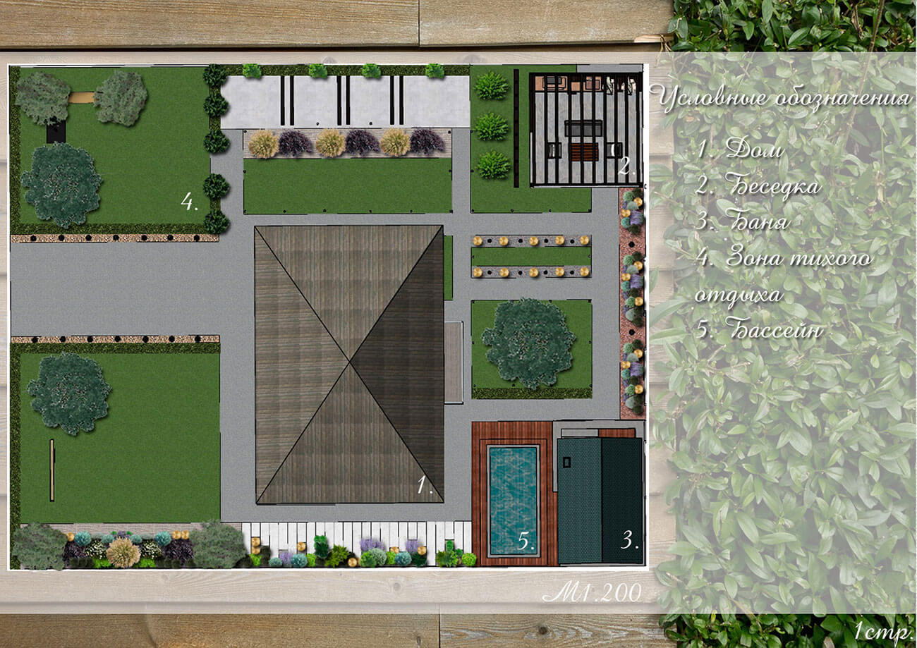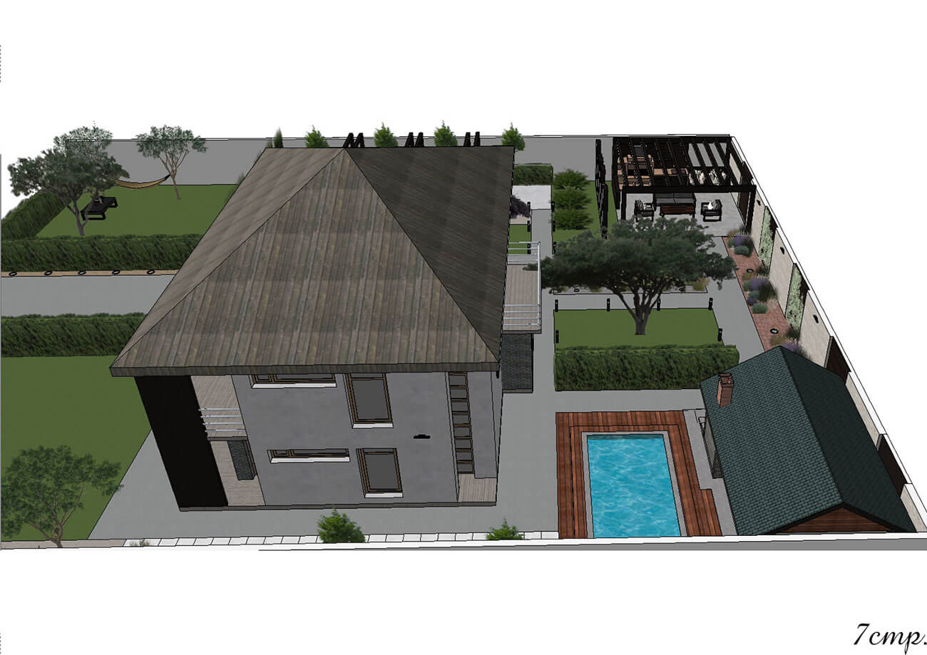 Данный участок имеет форму квадрата, образованную существующими строениями. Общая площадь составляет 9 соток. Архитектурно-планировочное решение выполнено в стиле модерн. В данном проекте выделяют несколько функциональных зон: зона тихого отдыха, беседка-барбекю, хозяйственная зона с бассейном.