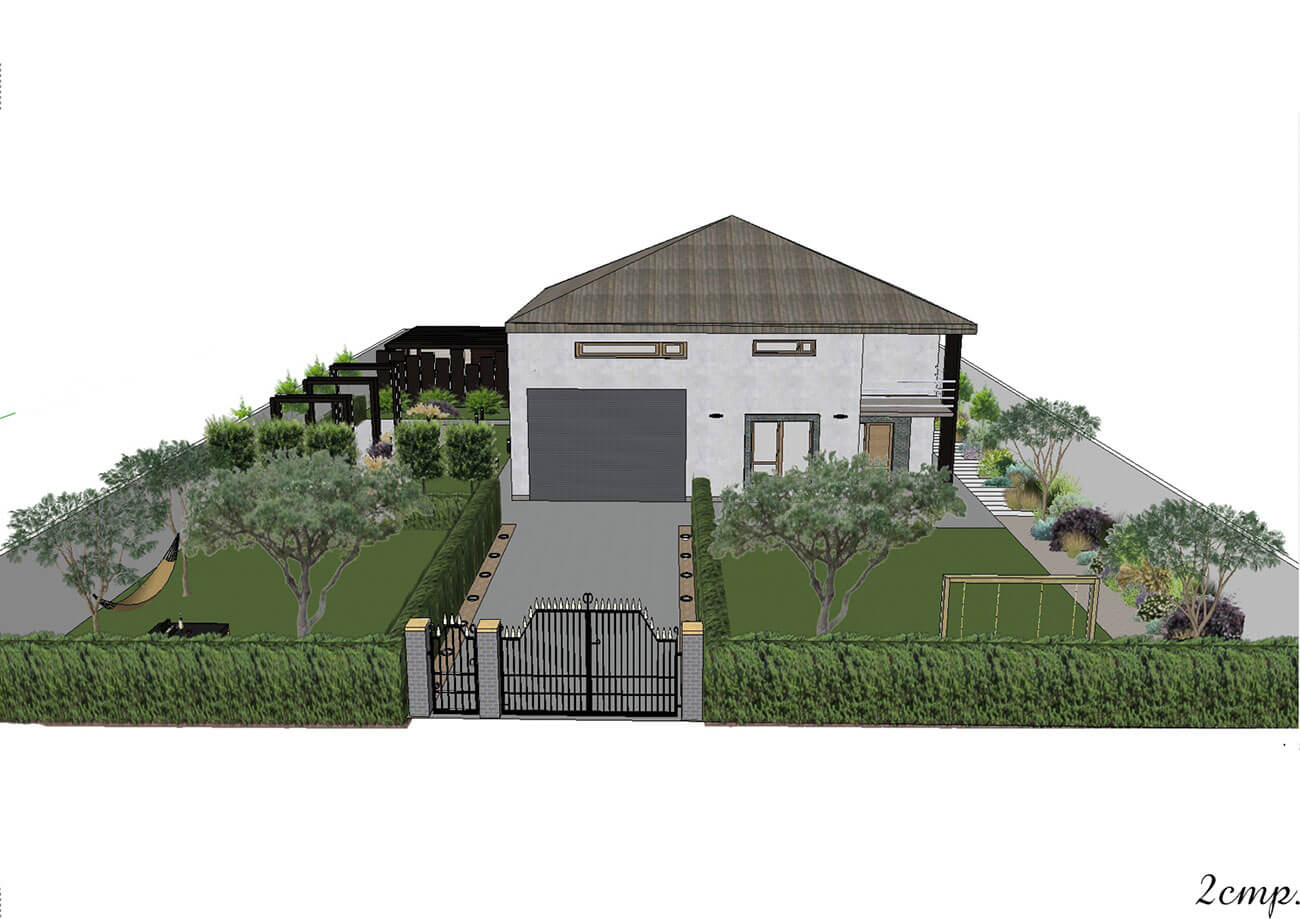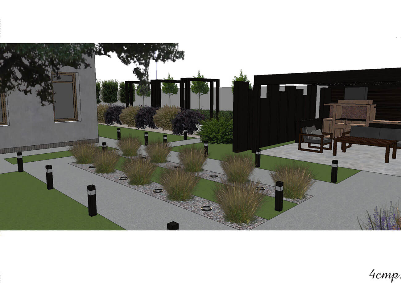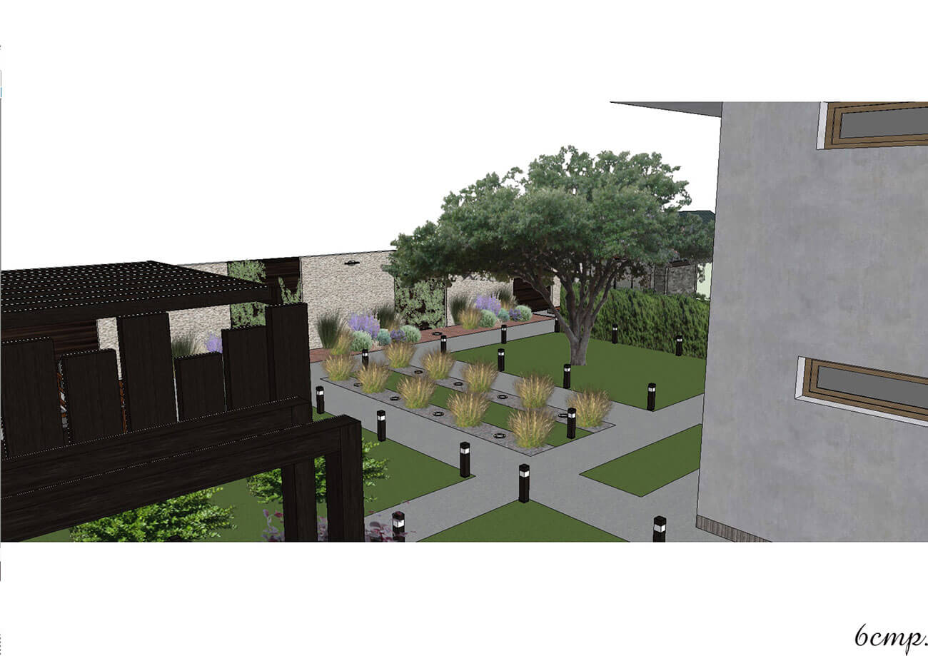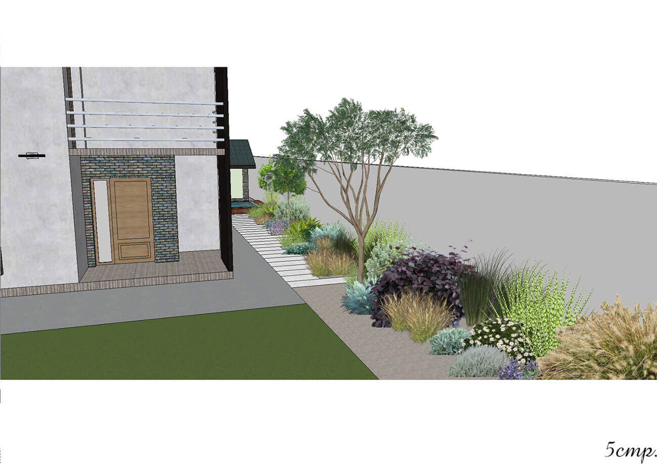 Между беседкой и хозяйственной зоной вдоль деревянного забора, декорированного габионами и обвитого лианами, проходит цветник. В его составе многолетние травянистые и злаковые культуры. От хозяйственной зоны мы можем попасть на лужайку, пройдя по дорожке, которая состоит из гранитных плит различной длины. Между плитами и забором располагается цветник, он тянется вдоль всего забора до живой изгороди. Цветник состоит из многолетних травянистых и злаковых культур, папоротников, а также включает в себя лиственные деревья. Живая изгородь отделяет лужайку от въезда, она может служить зоной активного отдыха, на ней находятся двухместные качели. Освещение участка несет как утилитарную, так и декоративную функцию. Освещаются зона въезда, вся дорожно-тропиночная сеть, цветники.