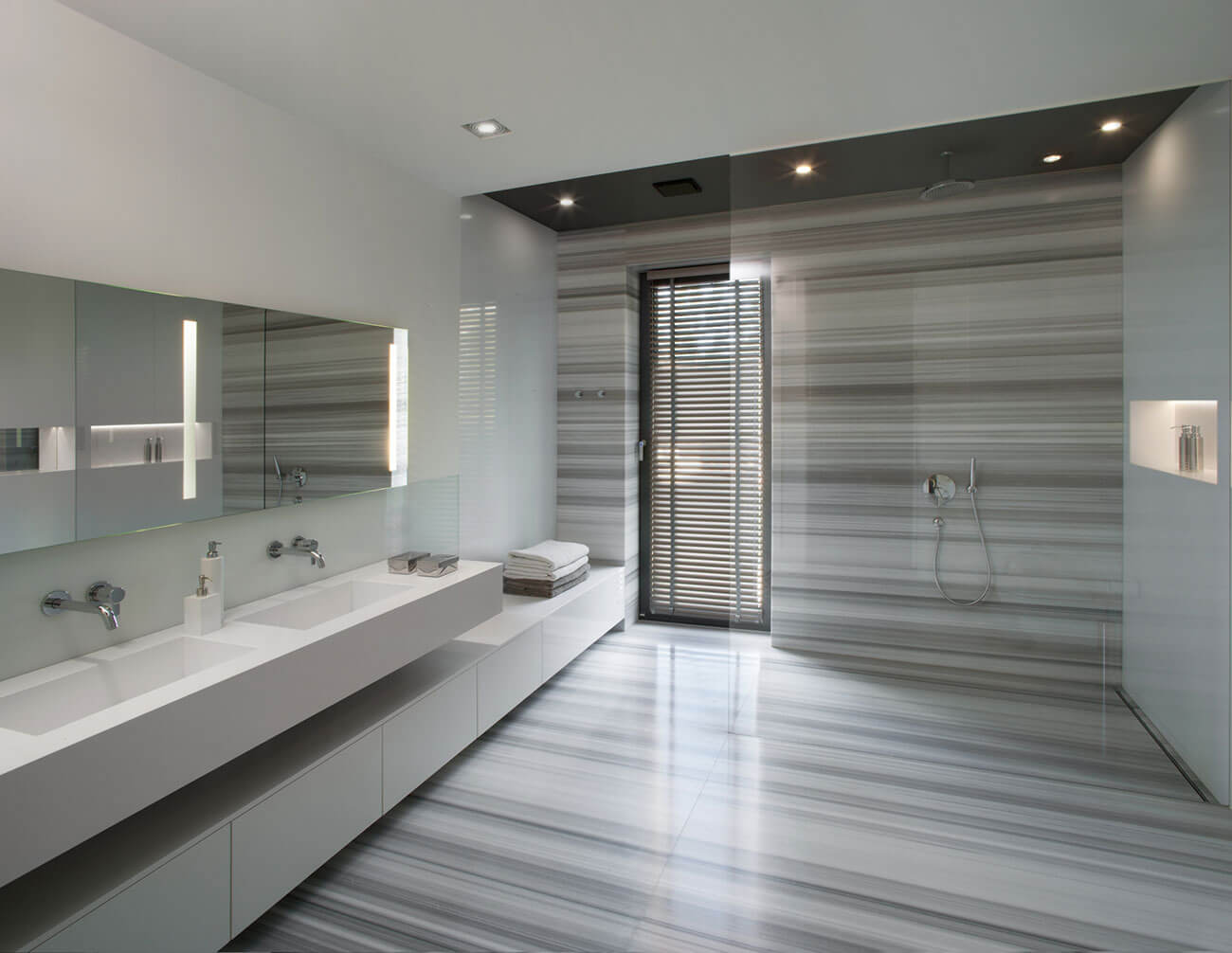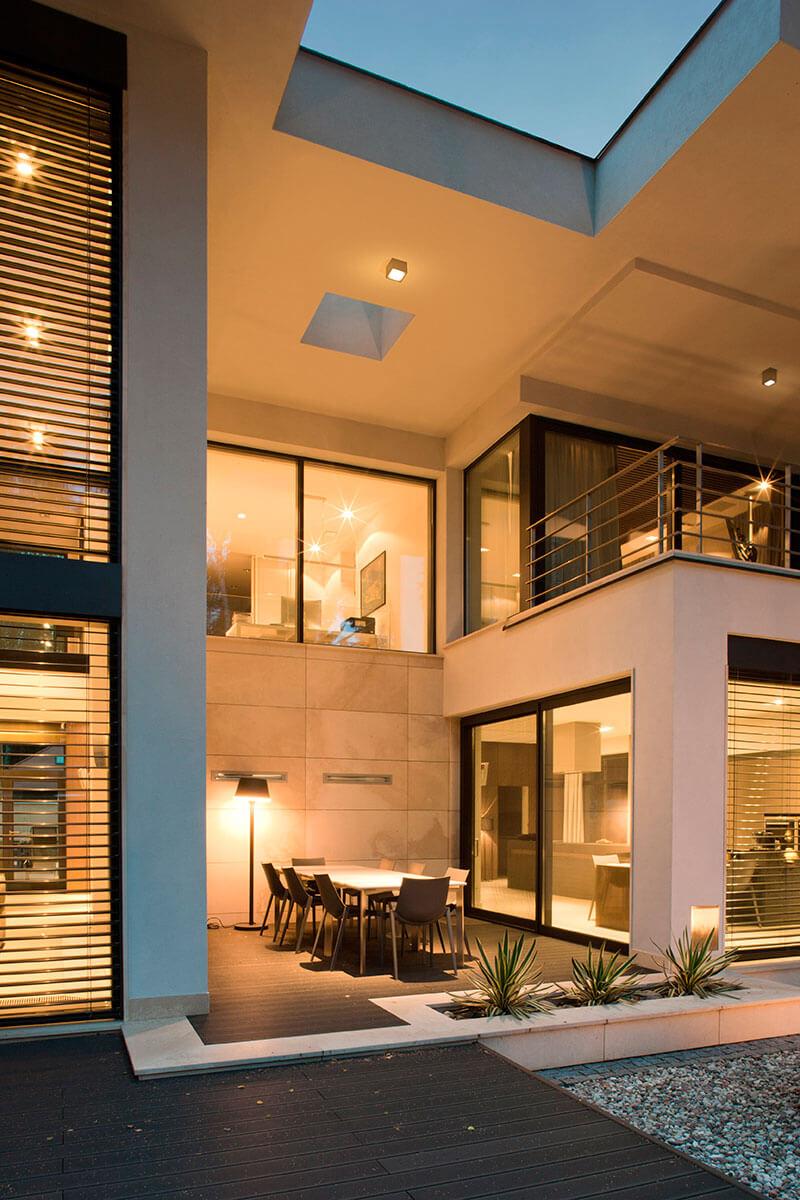 Отделка фасада здания выполнена с использованием композитных панелей и травертина, что подчеркивает современный дизайн дома.