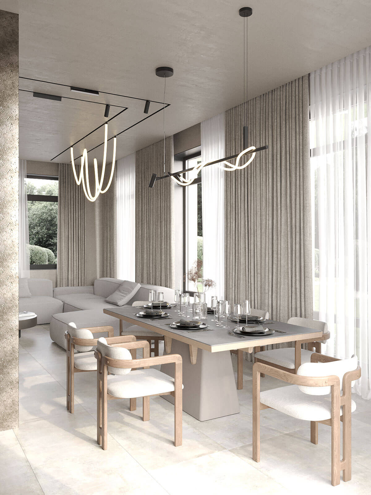 На первом этаже расположена просторная кухня-гостиная, где травертин на стенах добавляет теплоту и текстуру, а фактурный керамогранит на полу придает современный и стильный вид. Открытая планировка объединяет кухню и столовую, где использование различных видов металлов в декоре и мебели создает интересные акценты и подчеркивает уникальность интерьера. Многообразие сценариев освещения, включая встроенные светильники и настенные бра, позволяет варьировать атмосферу в зависимости от времени суток и настроения.