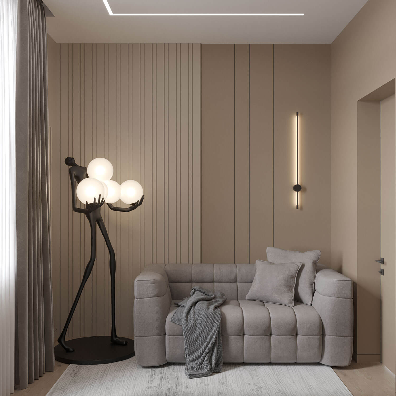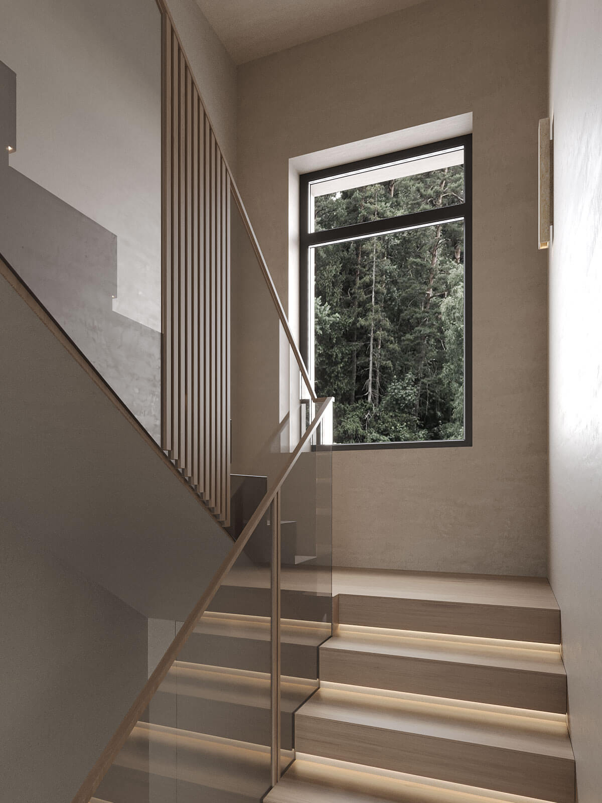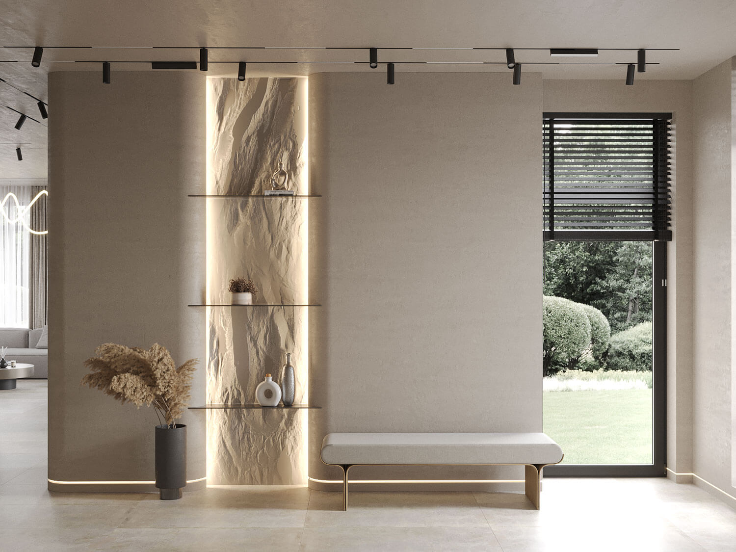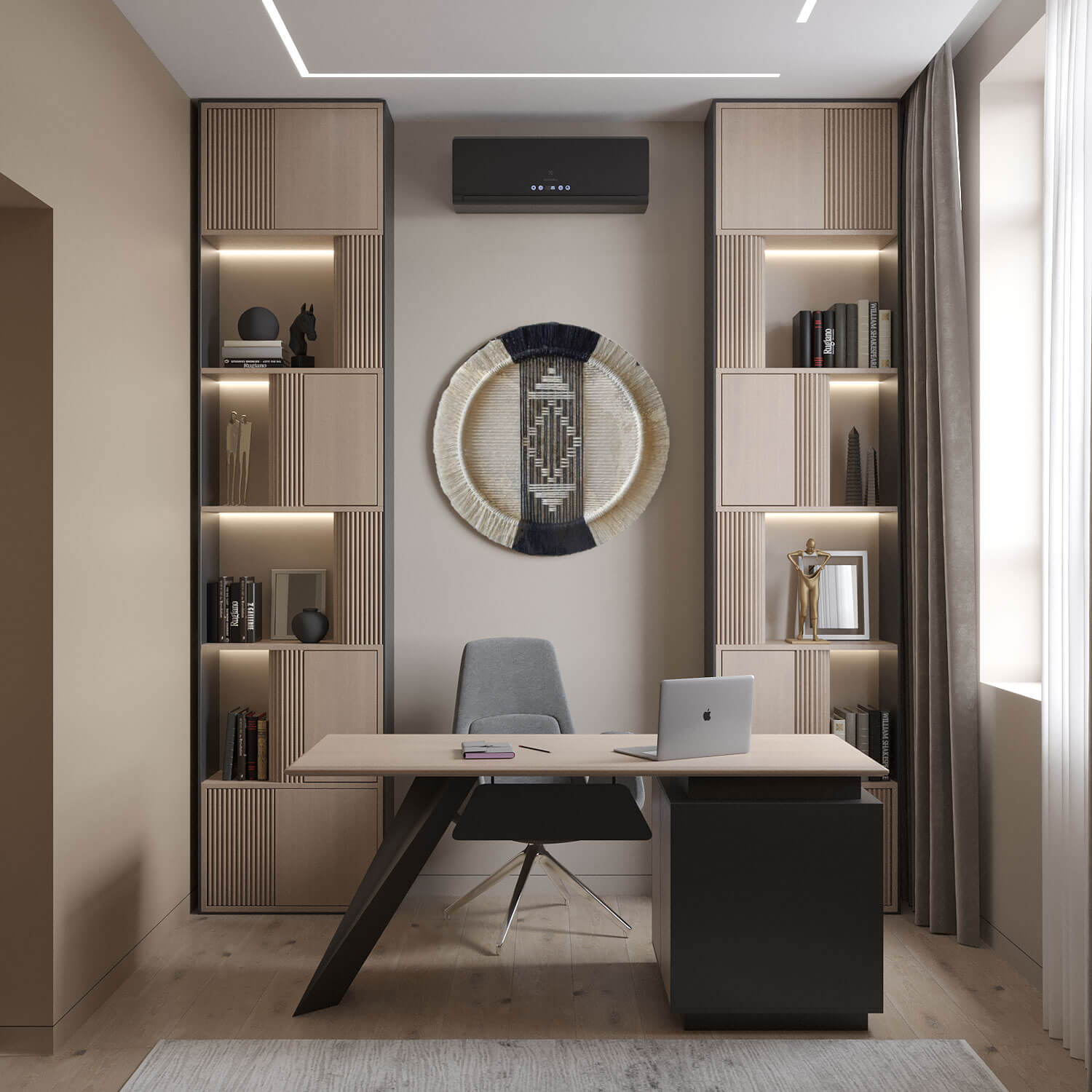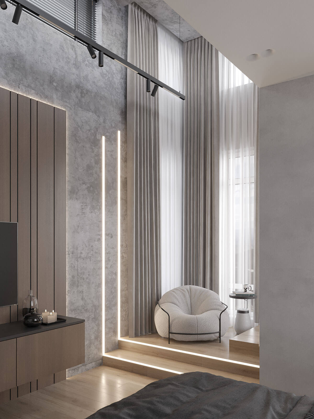 Третий этаж отведен под кабинет и библиотеку. Здесь царит атмосфера уединения и спокойствия, что идеально подходит для работы и отдыха. Уютные ниши, оформленные фактурными стенами и мягким освещением, приглашают провести время с книгой или сосредоточиться на творческих задачах. Элементы зонирования, такие как реечные конструкции, добавляют динамичности и помогают создать ощущение легкости и пространства.
