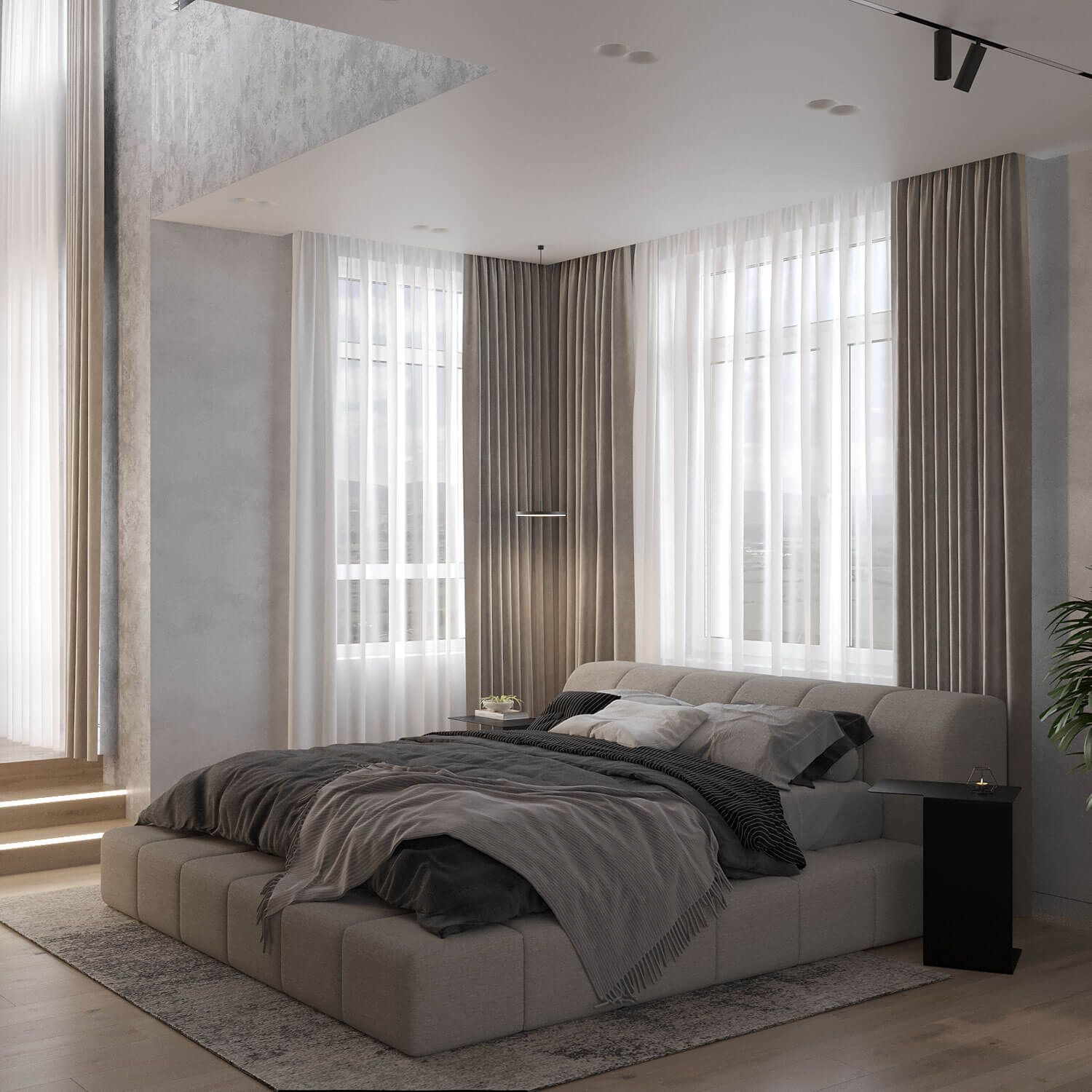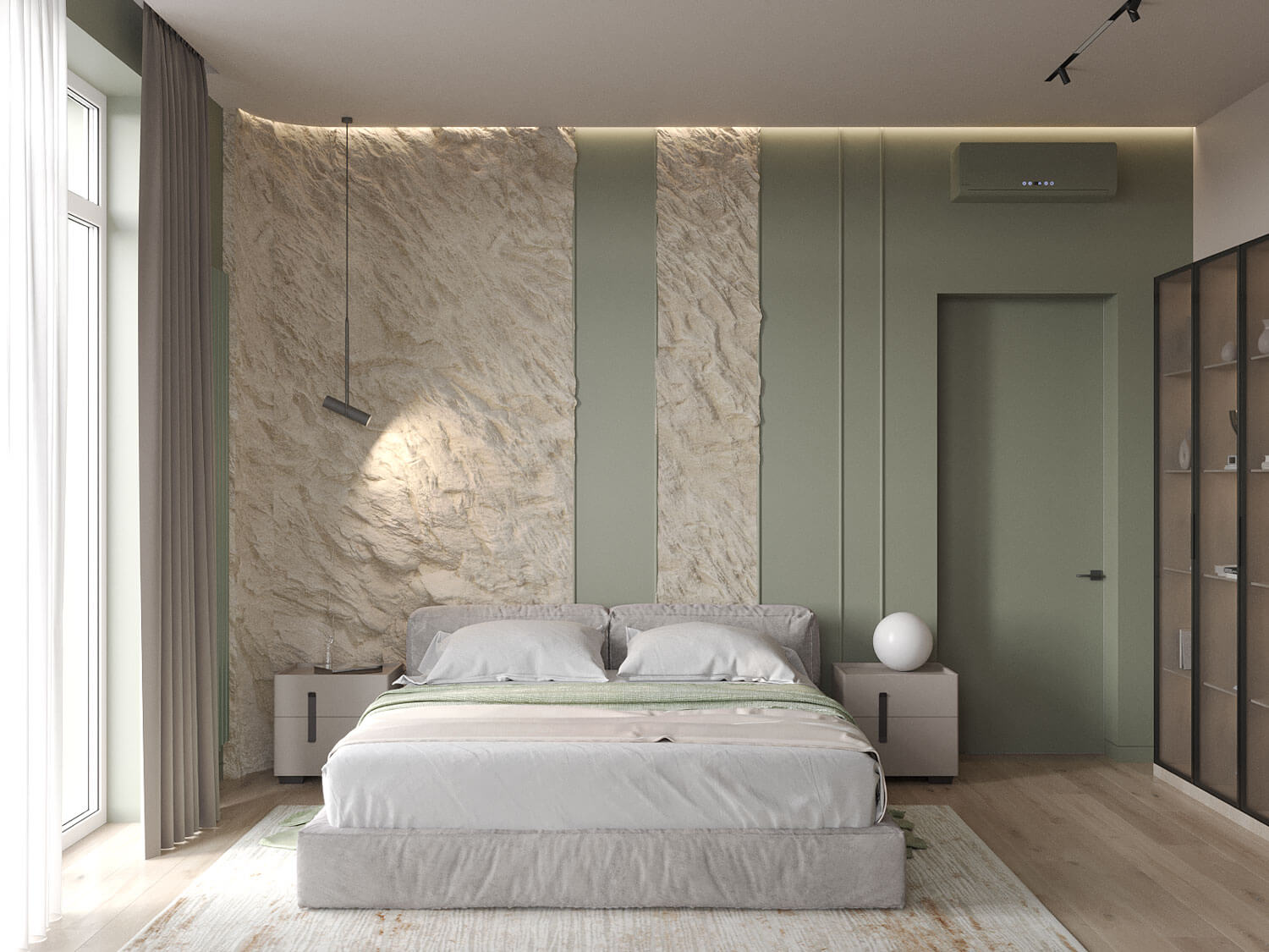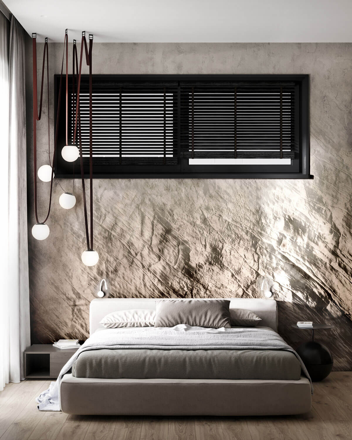 На втором этаже располагаются уютные спальни, оформленные в спокойных тонах с акцентами из шпона или скалы. Здесь также используются элементы джапанди, такие как простые линии и натуральные материалы, что создает гармоничное пространство для отдыха. Стеклянные перегородки и большие окна обеспечивают максимальное количество света и открывают вид на окружающую природу.