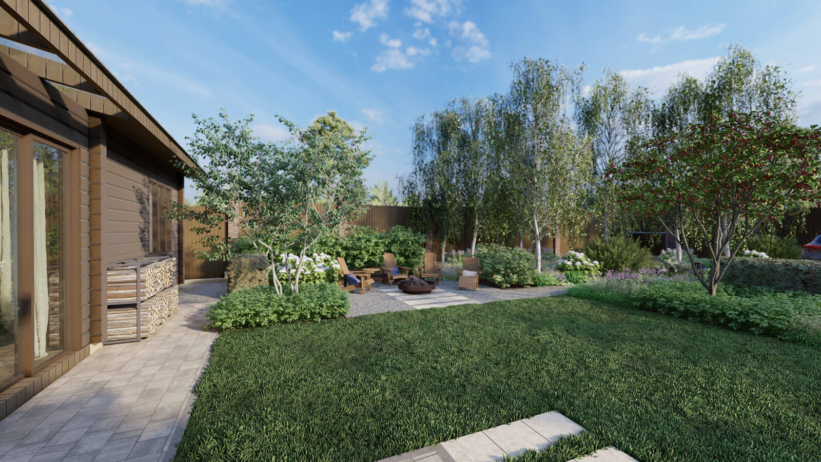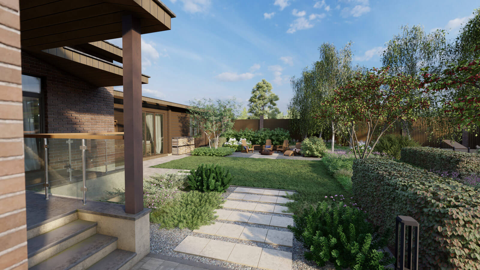 Задачи: сделать «стильный» сад, обеспечить уютное пространство и красивый вид с террасы.