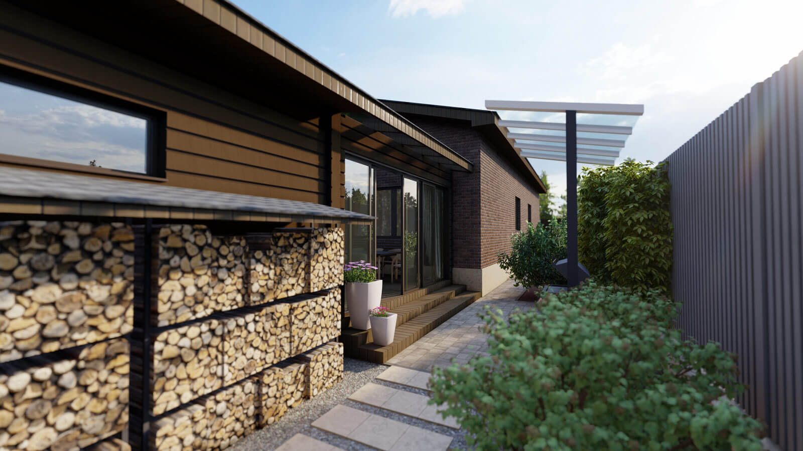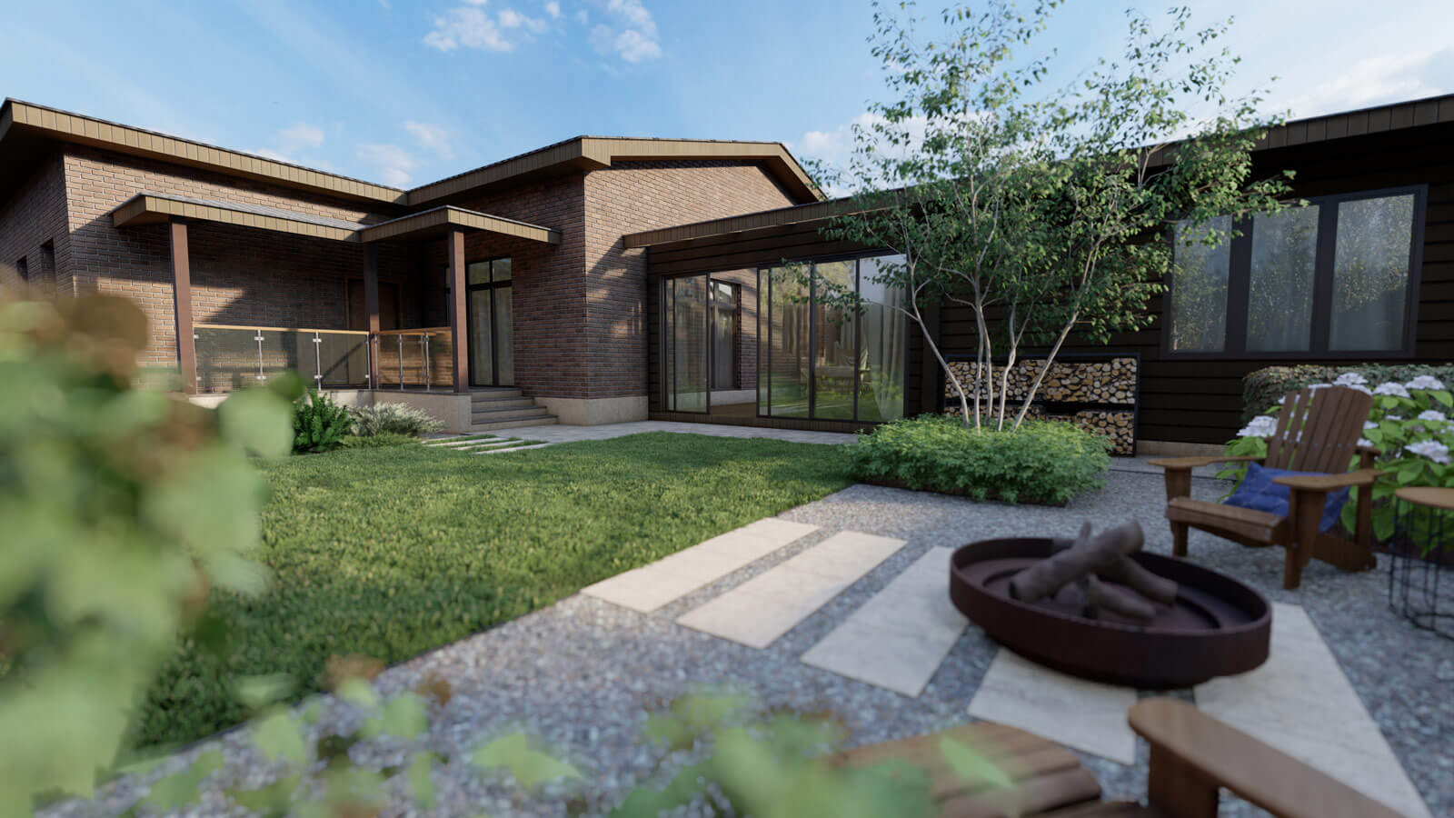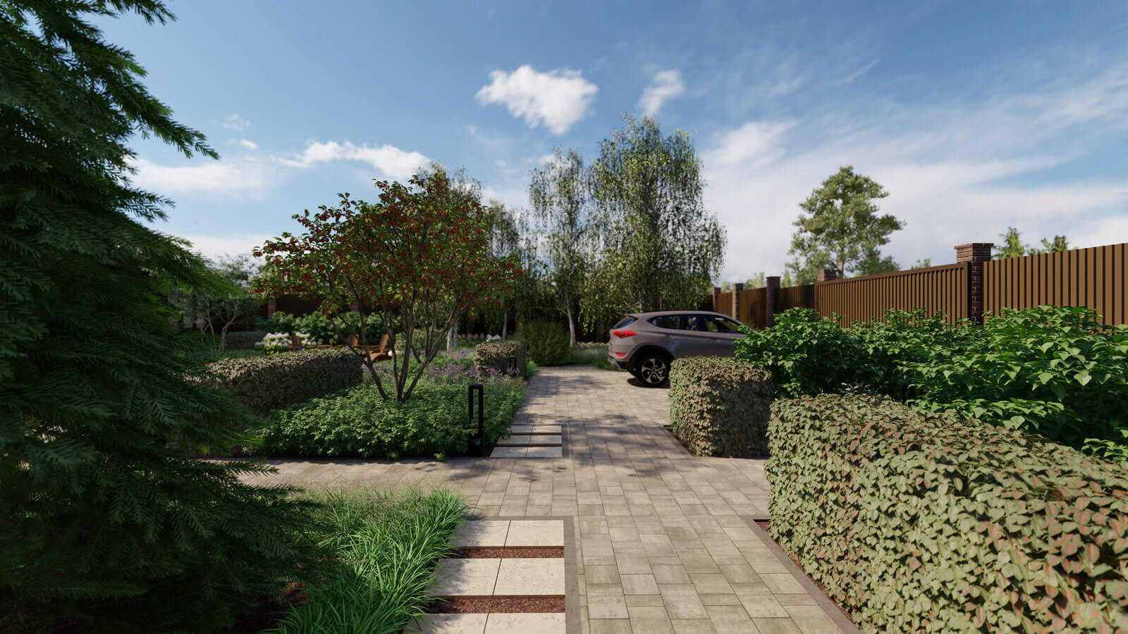 Решение: создание элегантного ландшафта, в основе которого лежат четкие геометрические линии и лаконичные формы, а также чёткое зонирование пространства.