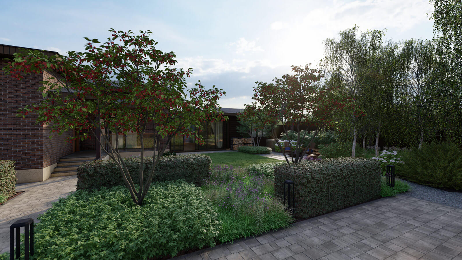 Ограниченная цветовая гамма, построенная на нюансах, усиливает ощущение изысканности. Доминирующими становятся нейтральные тона — серый, бежевый, приглушенная зелень. Их дополняют акценты благородного бордового цвета живой изгороди.