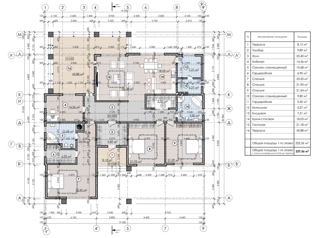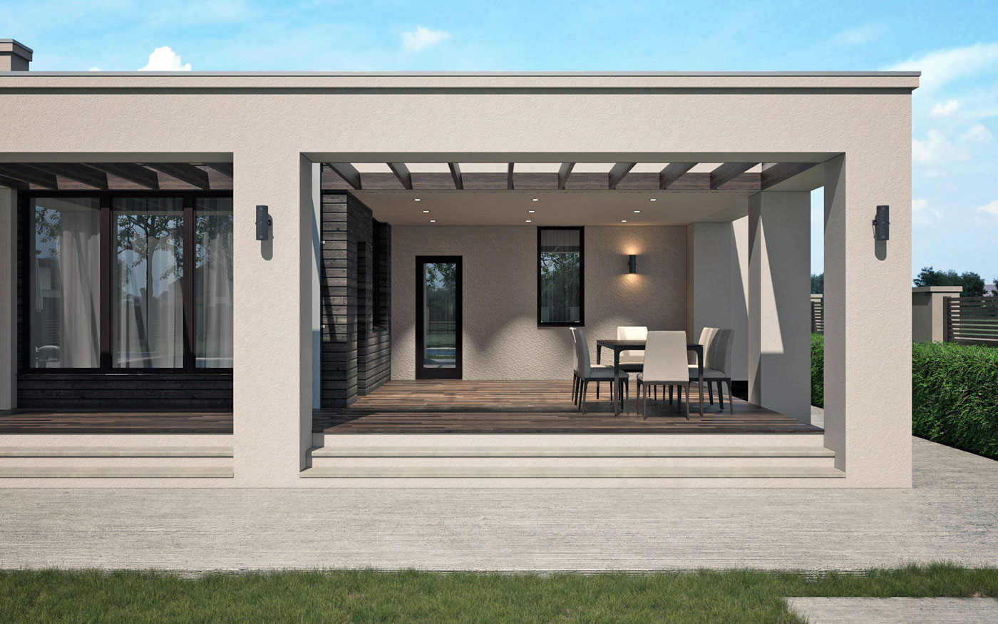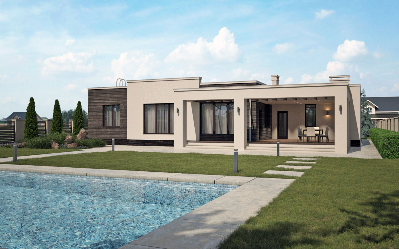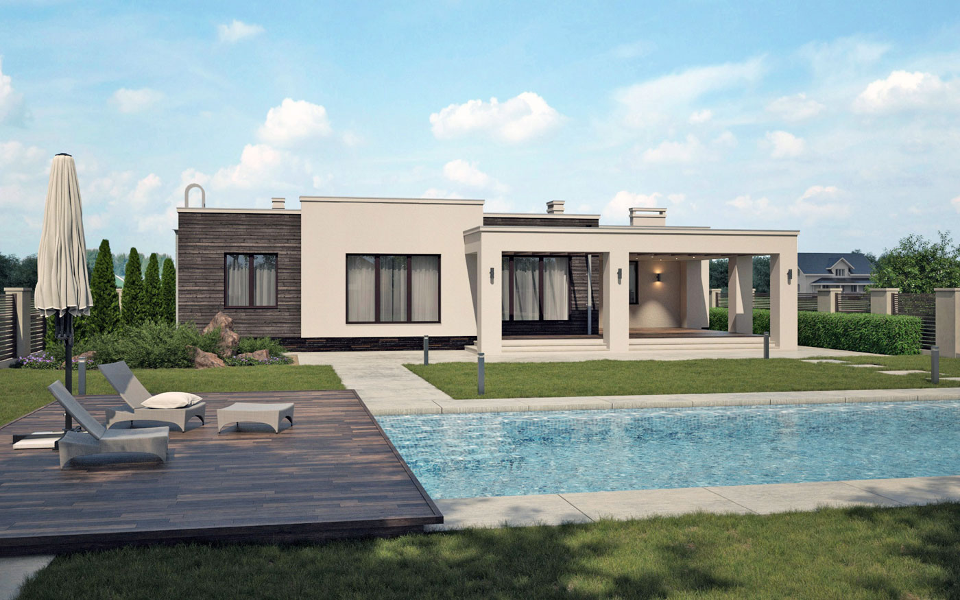 Так, вместо гаража появилась просторная мастер-спальня с гардеробной, кабинетом и санузлом. Кухню-столовую объединили с гостиной, получив общее пространство, перекрытое десятиметровыми балками. «Изюминкой» нового проекта стала терраса-патио с видом на бассейн, где можно устраивать как многолюдные вечеринки, так и барбекю в узком семейном кругу.