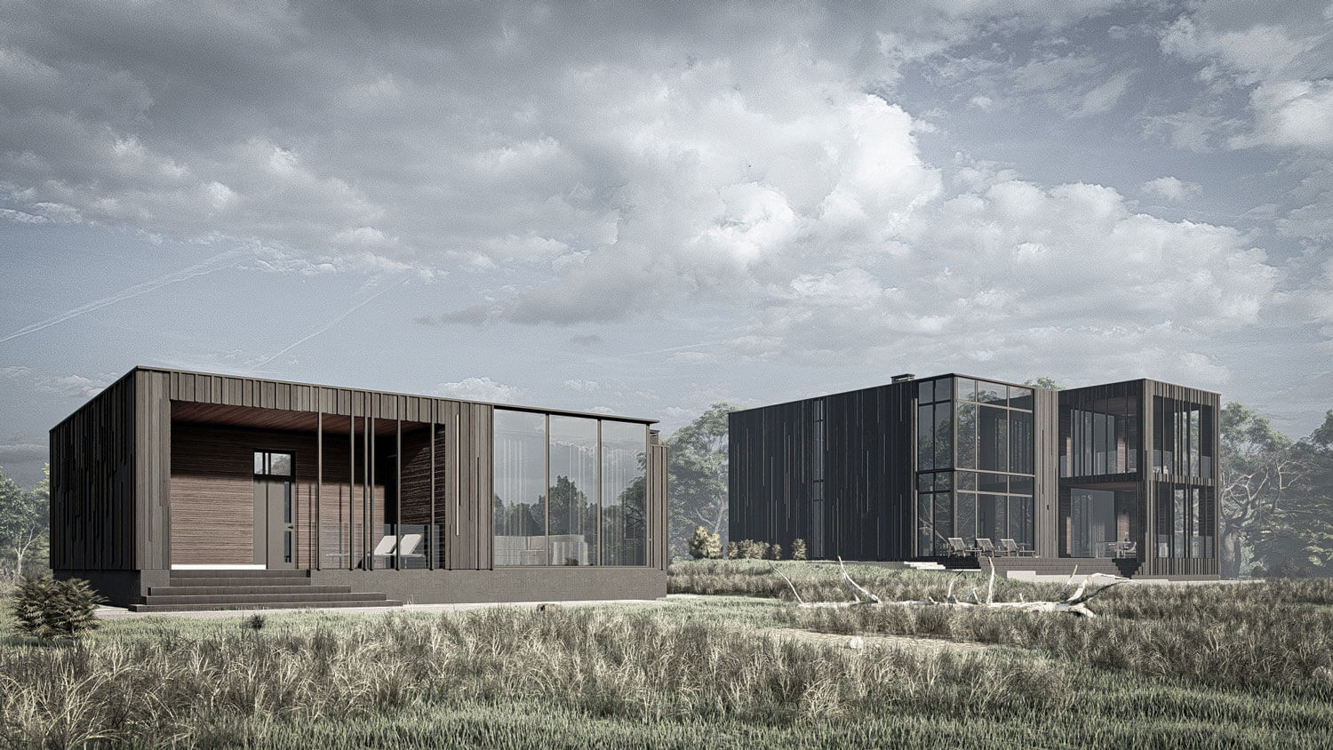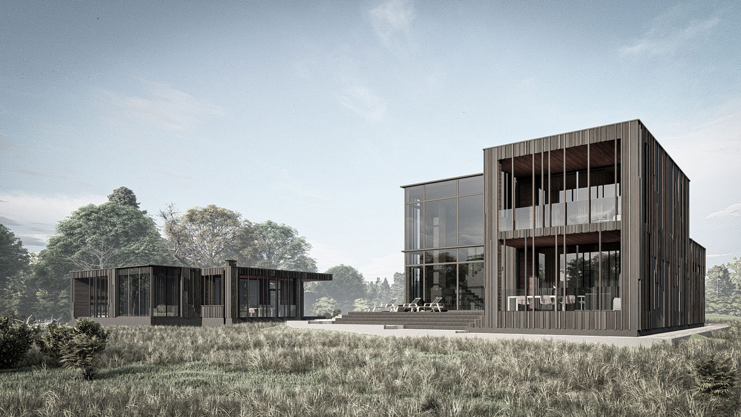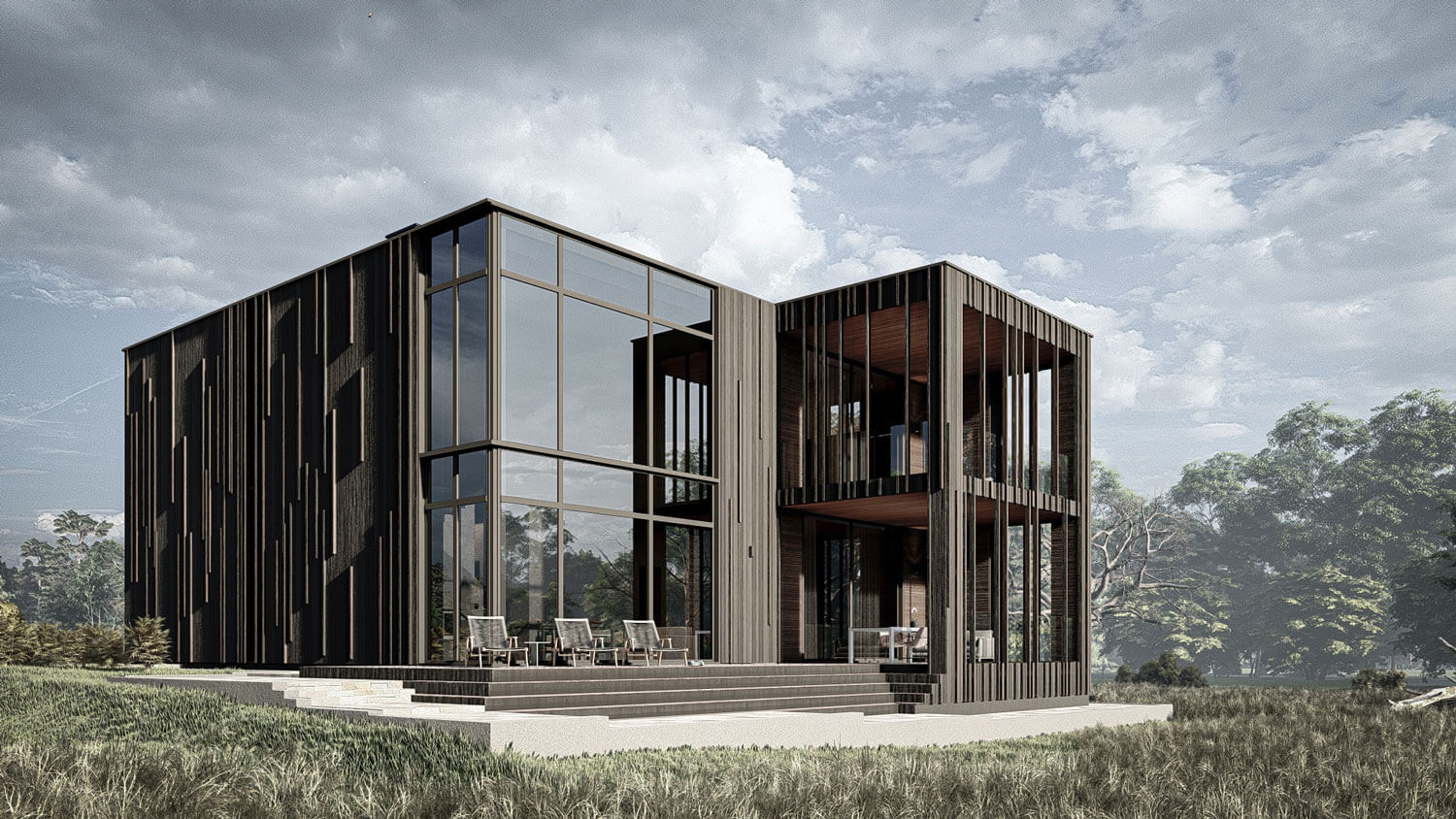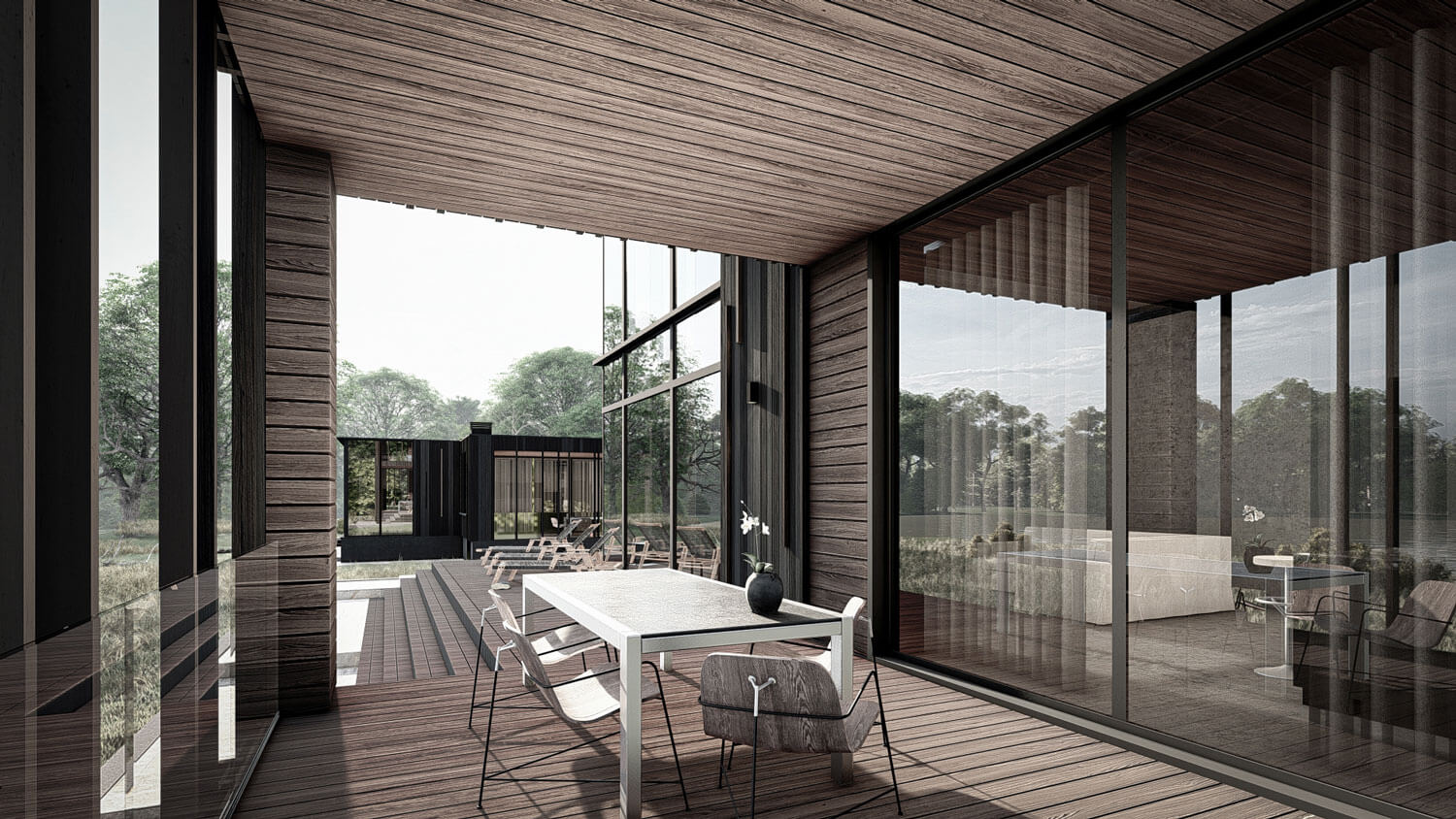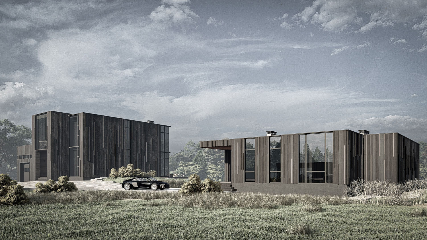 Основная идея проекта — это брутальные объемы, в темной и естественной, внешней отделке, которые разбавляются большим количеством остекления и впускают в себя водную гладь и небосвод. С террас и балконов дома и банного комплекса отлично просматривается озеро и лесные массивы за ним, ради которых задумывался этот проект.