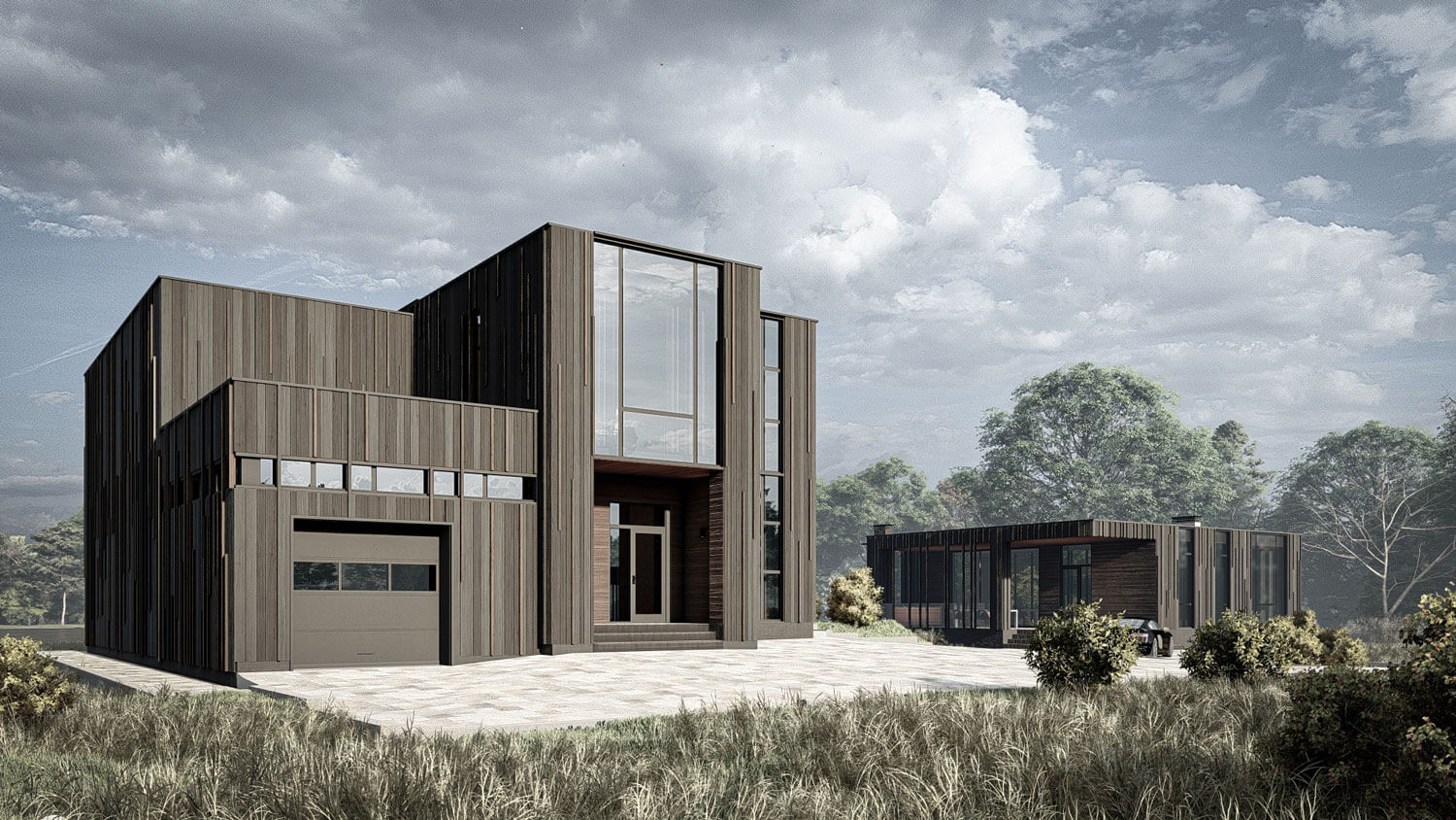 Жилой дом, расположенный на северном участке, имеет свой навес на 1 а/м и 2 входа, основной и вспомогательный с зоны навеса. Через основной вход можно попасть по центру дома, в южной его части, справа от навеса. Дом необычной формы с множеством объемов выходящих на северную и южную стороны.