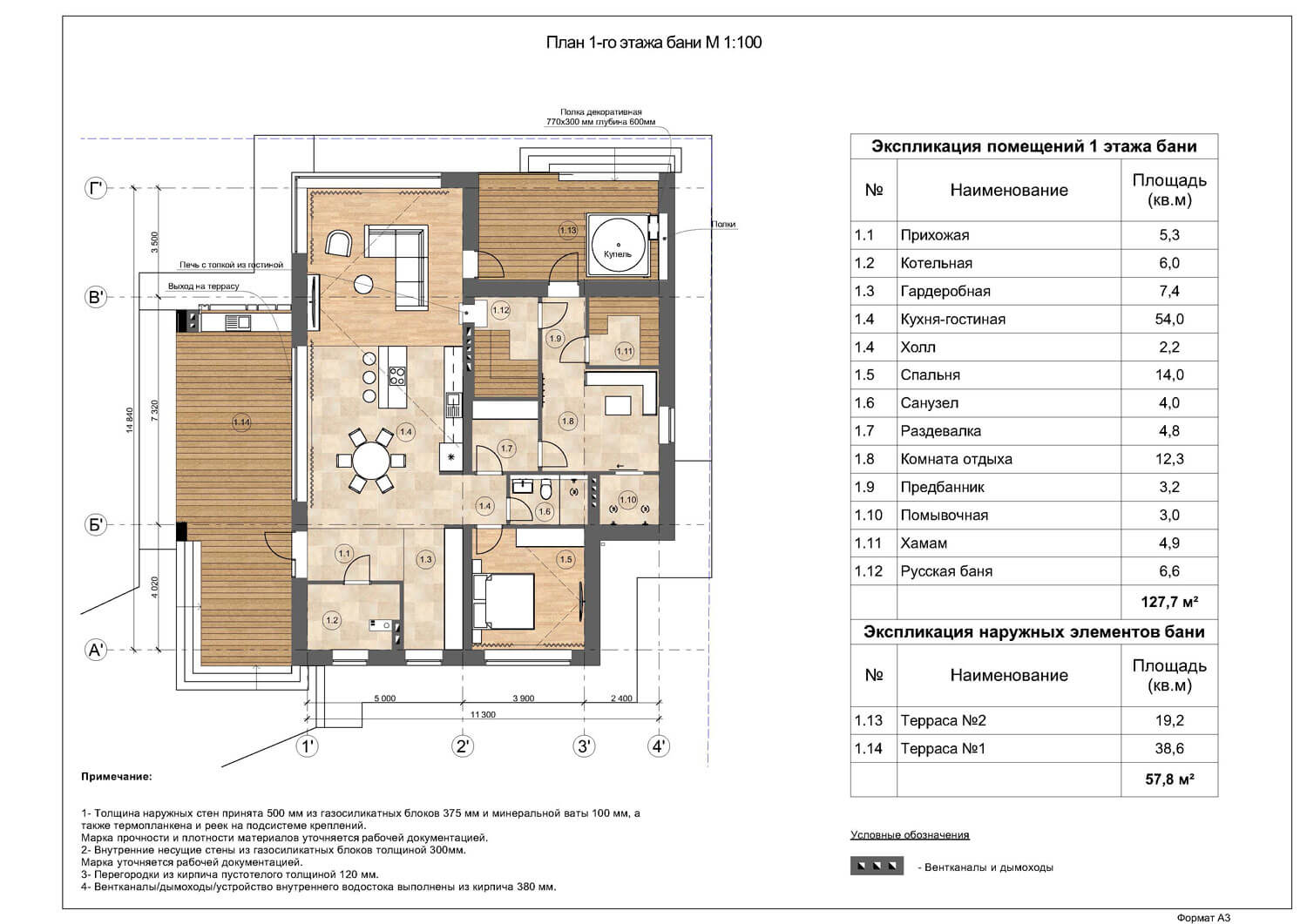 Общая площадь банного комплекса (без учета террасы и крыльца) — 127,7 м²