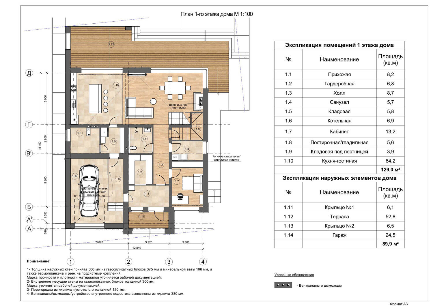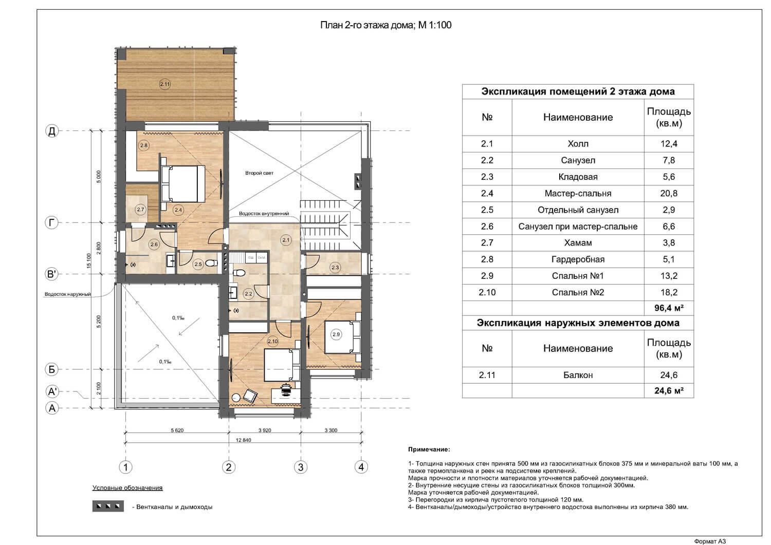 4. Вентканалы/дымоходы/устройство внутреннего водостока выполнены из кирпича 380 мм.