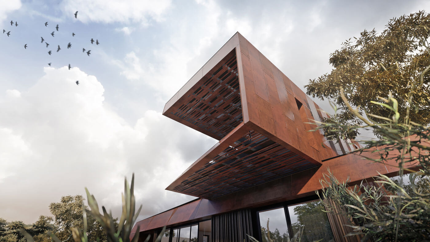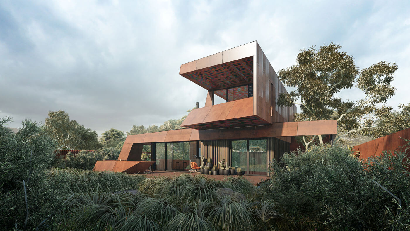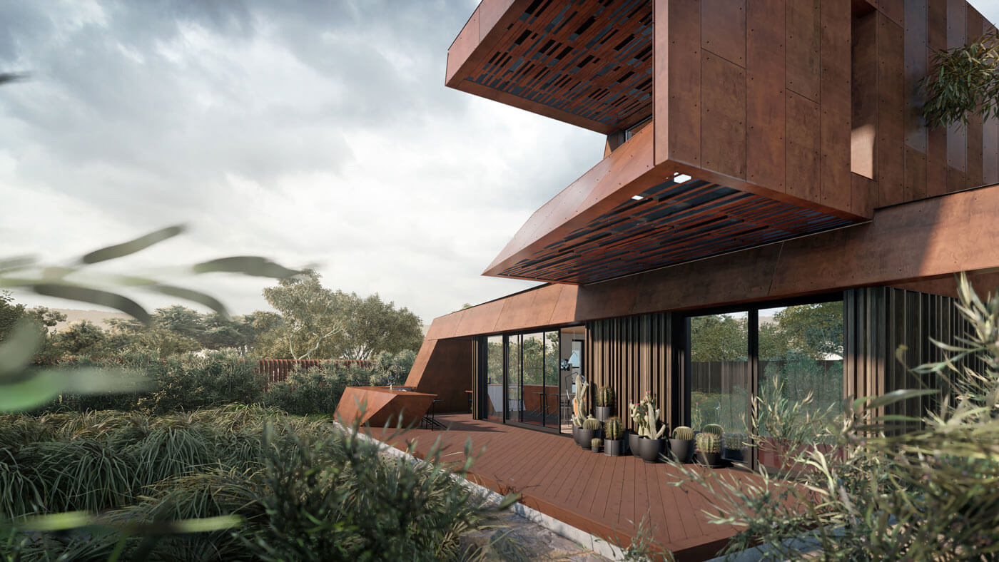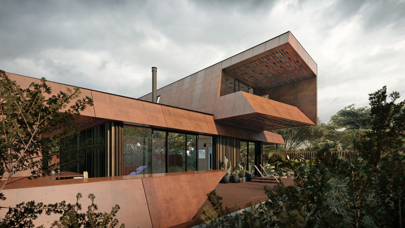 Наружная отделка дома была выбрана исходя из скорости монтажа, её долговечности, а также эстетической цели «пылать» на солнце как терракота. И всем этим критериям полностью соответствовала бакелизированная фанера, которая была использована практически повсеместно в экстерьере, начиная от отделки стен и заканчивая подшивой свесов балконов и крыши.