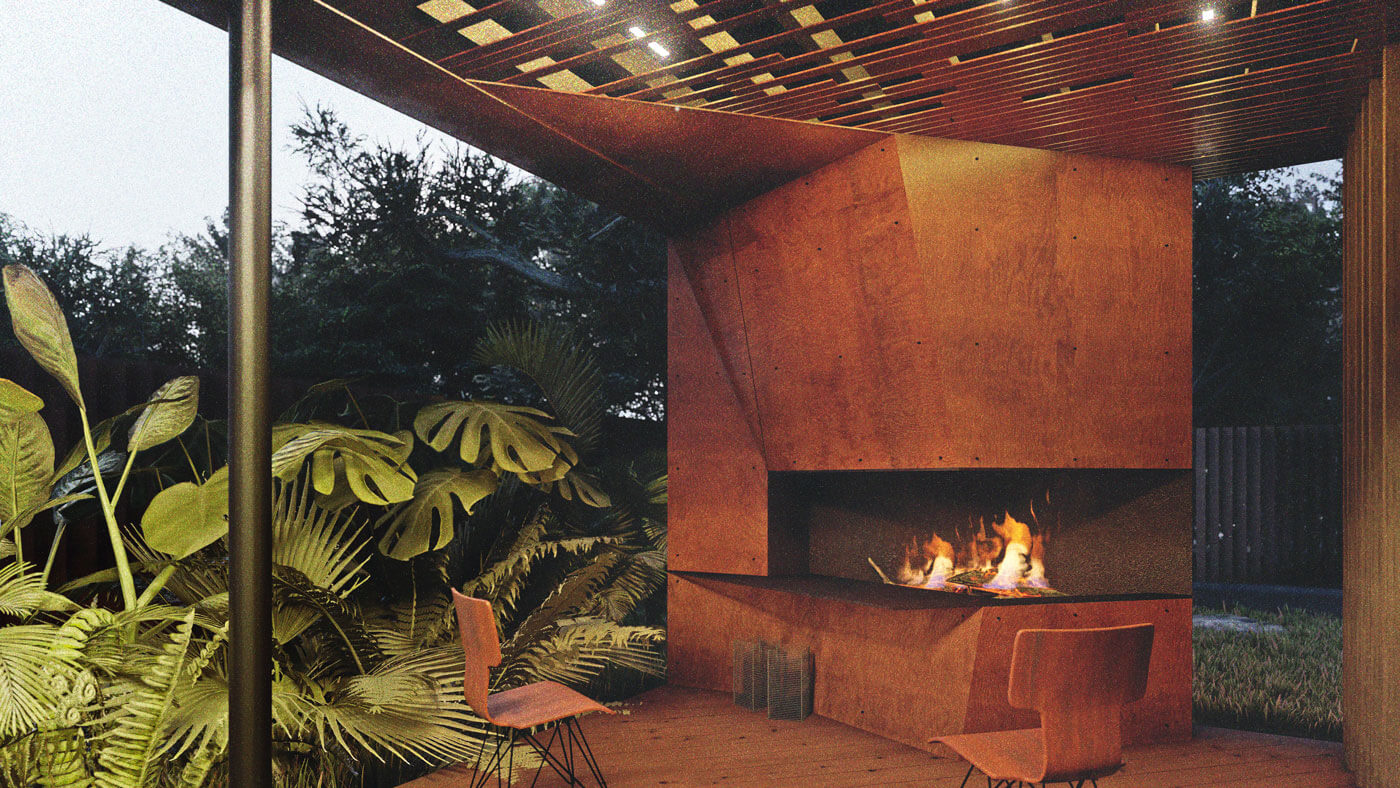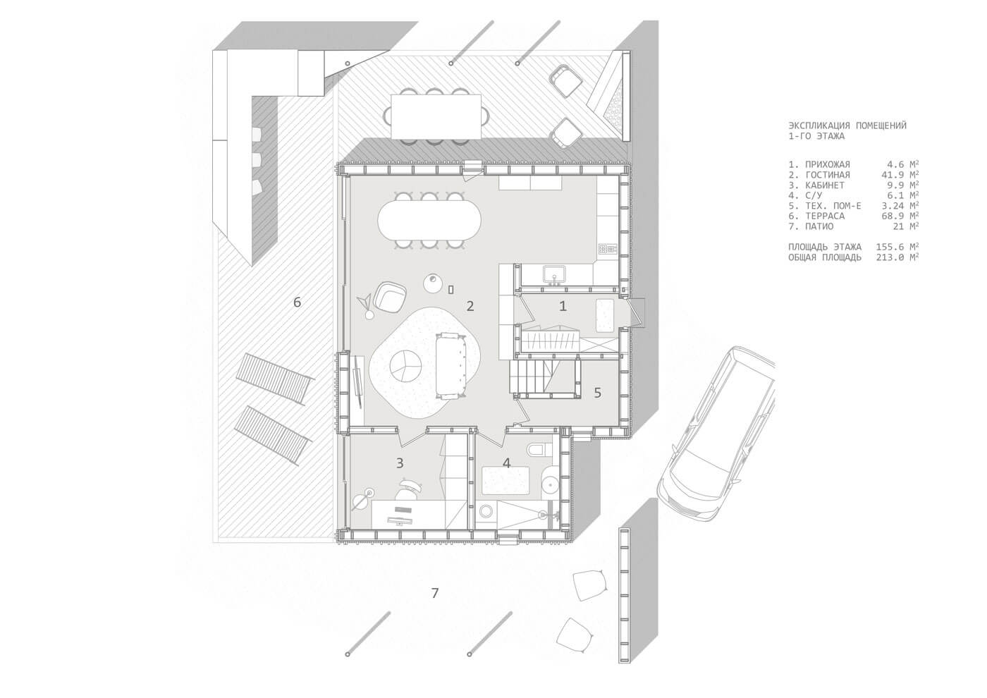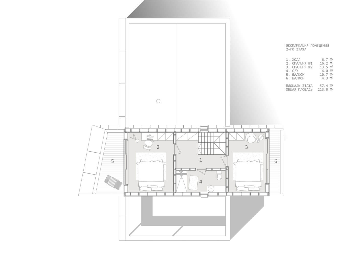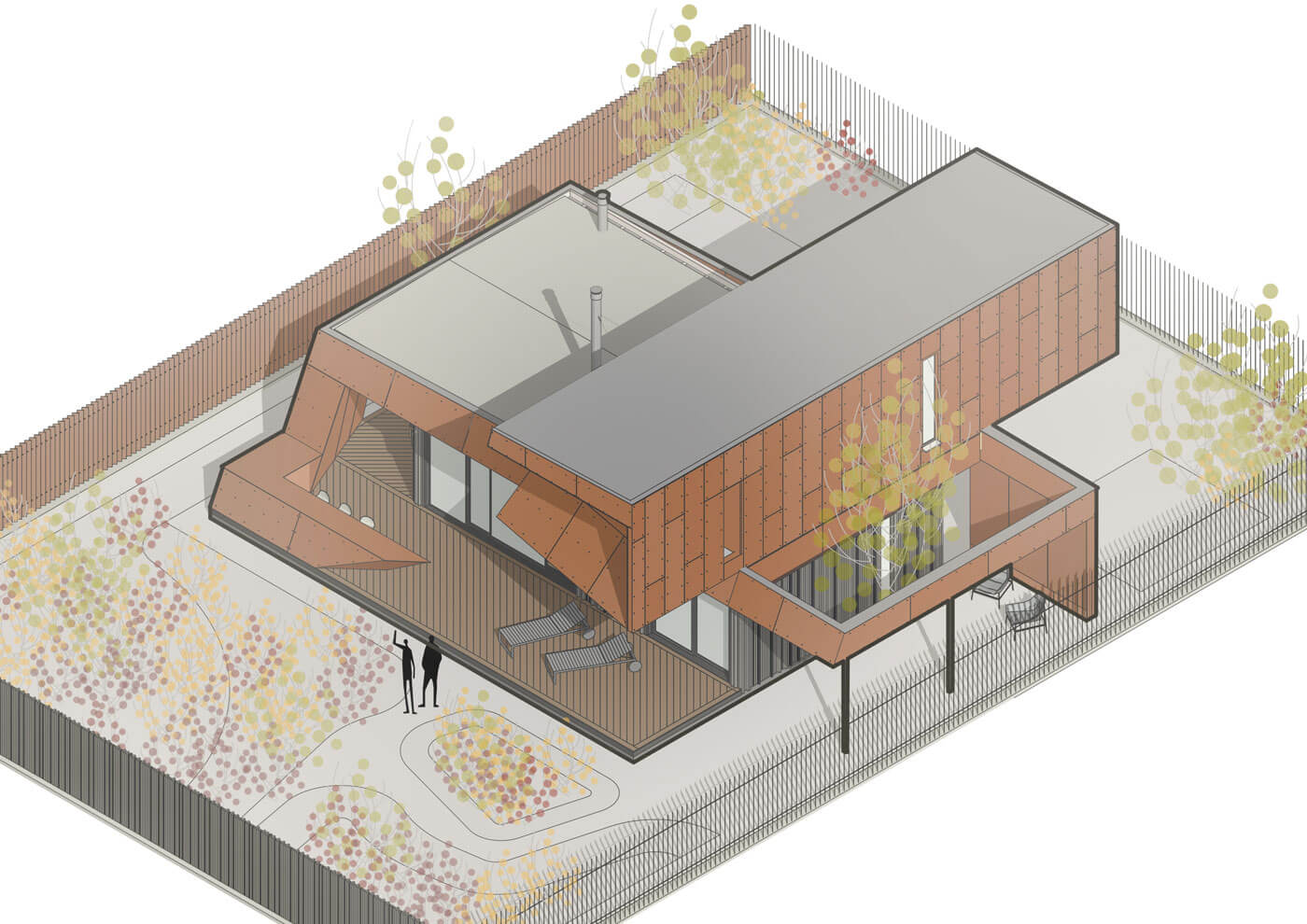 Дом, который бы «пылал» на южном солнце посреди окружающей застройки одного из посёлков Краснодарского края, создавался для небольшой семьи художника-гончара и дизайнера. Основой стала его геометрическая простота планировочной композиции, которая состоит из двух повернутых прямоугольников, объединенных лестничным холлом. На первом этаже расположилась просторная гостиная, гостевой санузел и кабинет. На втором этаже находятся две спальни, одна из которых хозяйская и ещё один санузел. При этом экстерьер в противовес был спланирован так, чтобы в зависимости от точки обзора он всегда увлекал взгляд своей динамикой за счёт деконструкции геометрии его элементов. И наиболее подходящим строительным решением для реализации задуманных идей стал деревянный каркас.