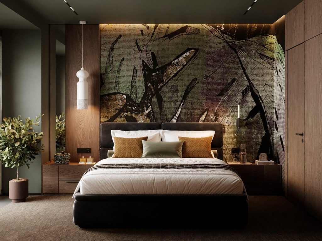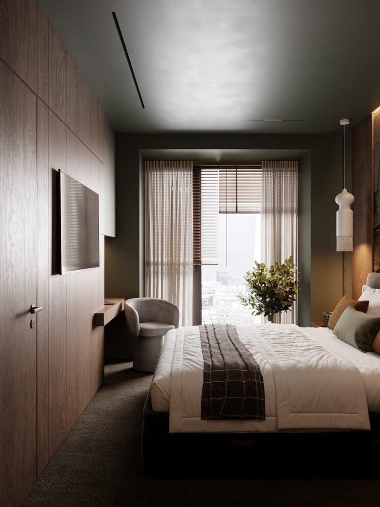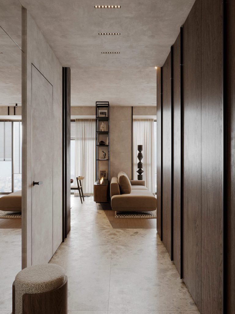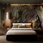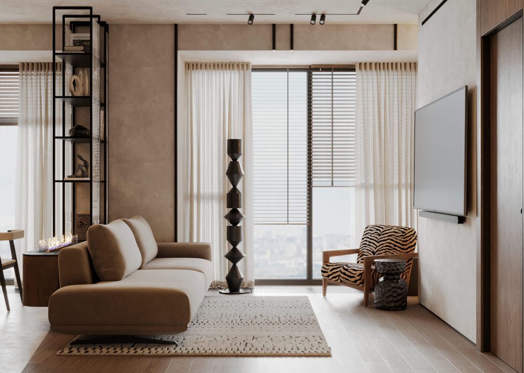 Приглушенные коричневые, песчаные, зеленые оттенки в сочетании с фактурой дерева и камня, анималистические принты, поддерживаемые этническим декором и атмосферными светильниками, завершают образ.