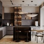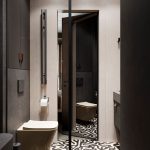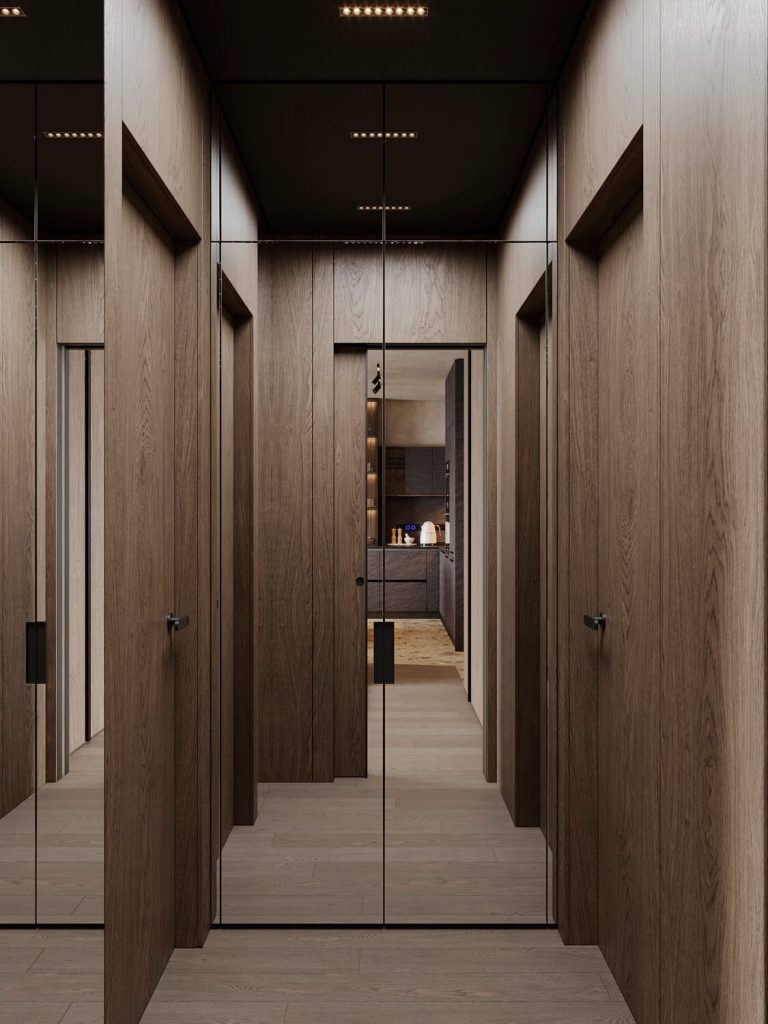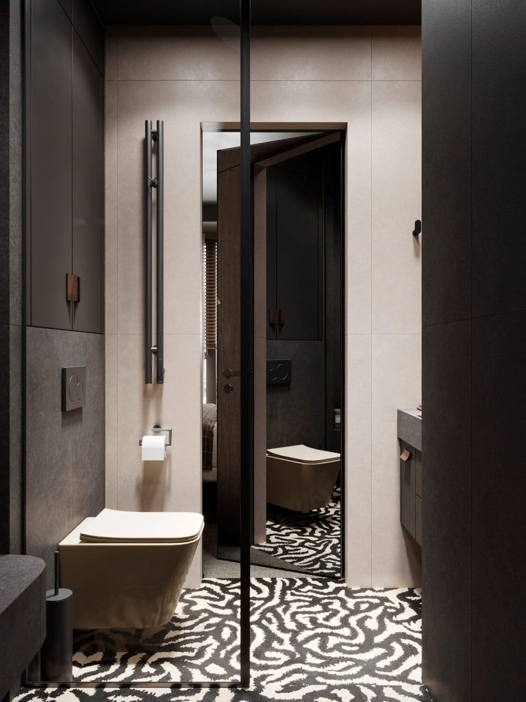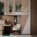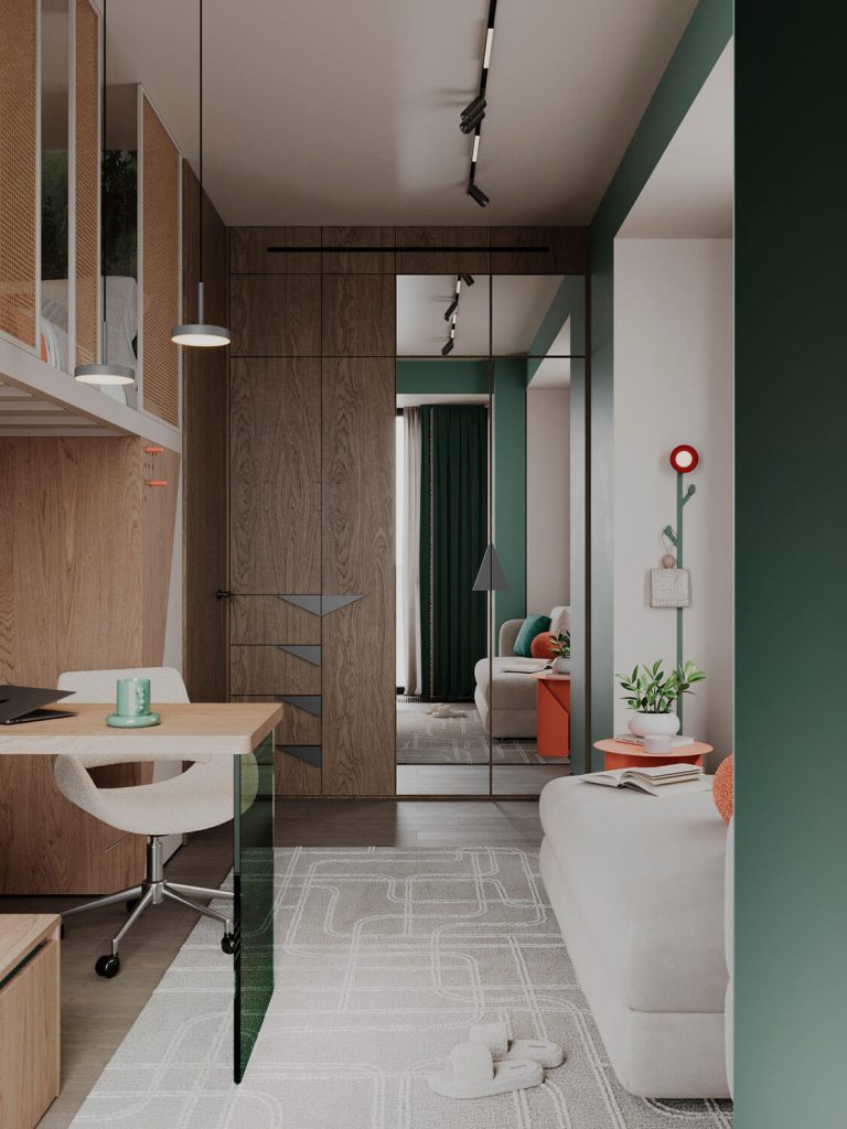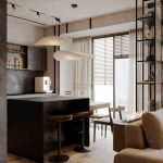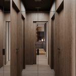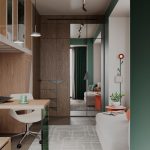 Относительно небольшая площадь квартиры со сложными конструктивными особенностями, а также необходимость организации дополнительных инженерных систем требовали нестандартного подхода к планировке данного проекта. Нам удалось разместить в квартире просторную кухню-гостиную, мастер-блок с душевой, детскую комнату с кроватью на втором уровне и рабочим местом под ней, ванную, а также за фасадами шкафов — хозяйственный блок с небольшой постирочной.