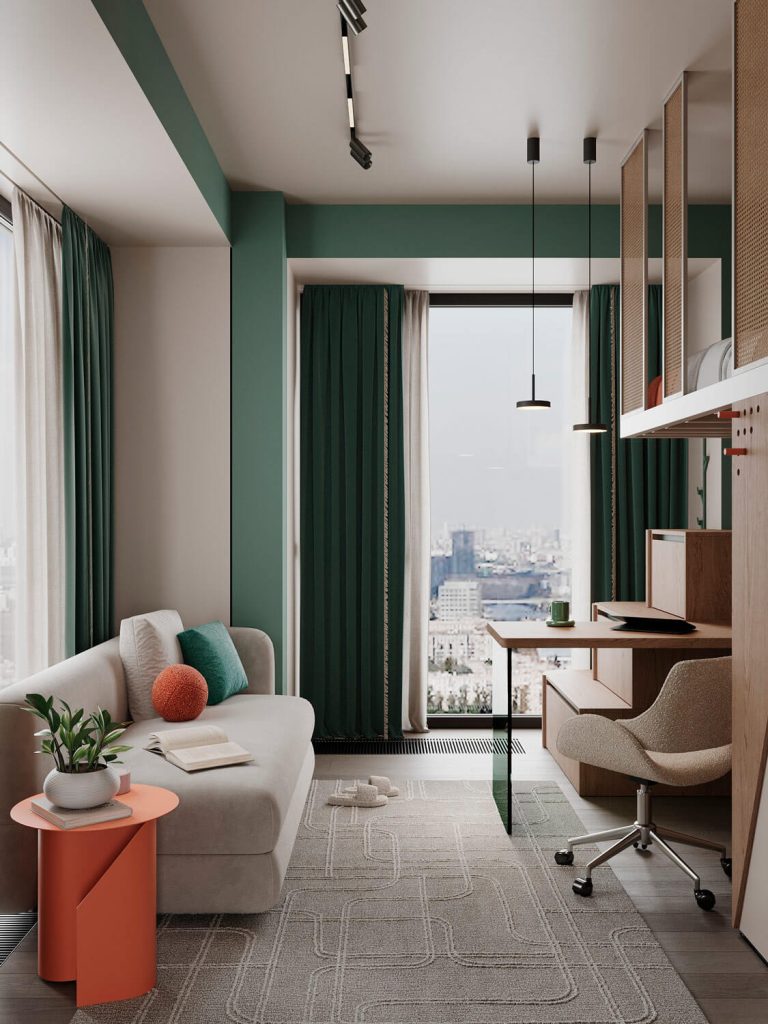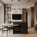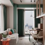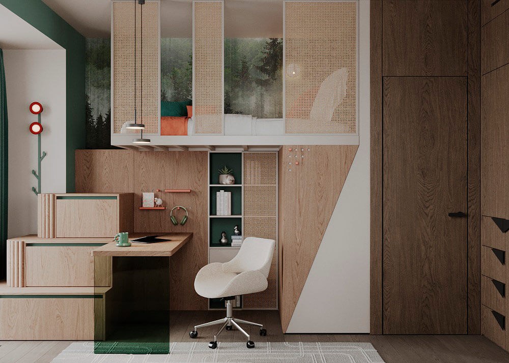 Главной идеей оформления пространства стали мотивы дикой природы: африканская саванна в зоне кухни-гостиной, утренний туман хвойного леса в детской и джунгли в спальне.