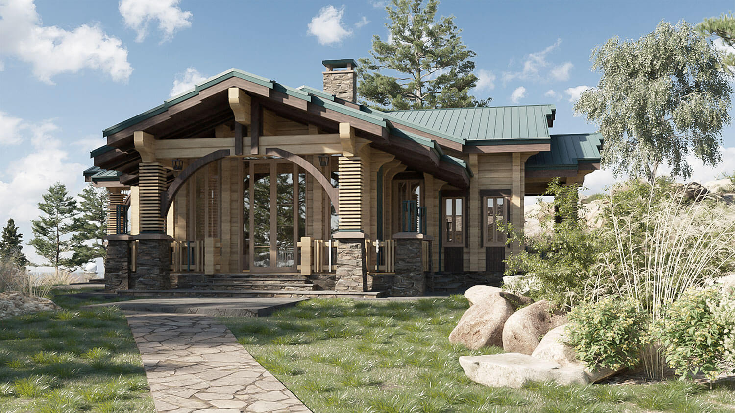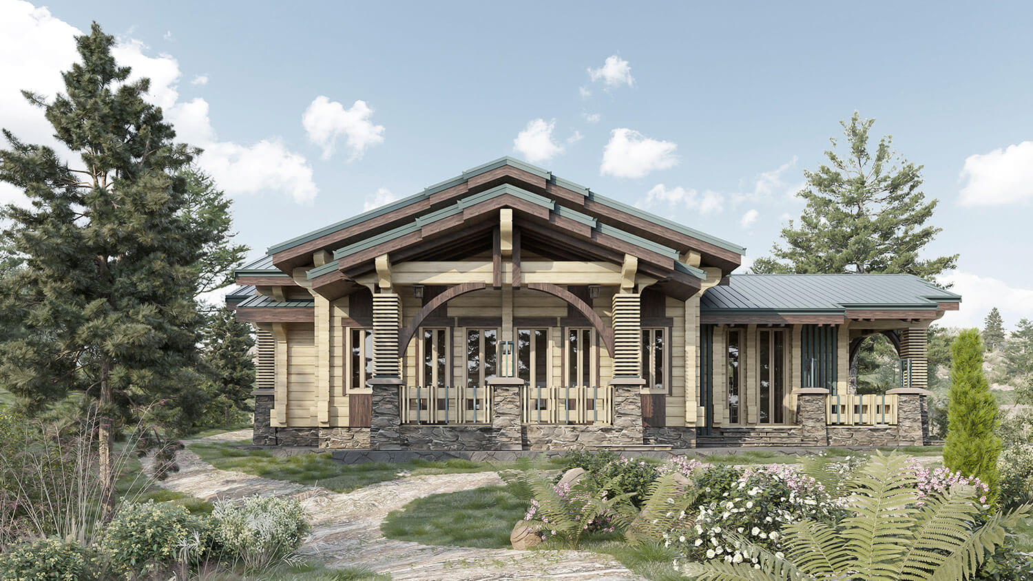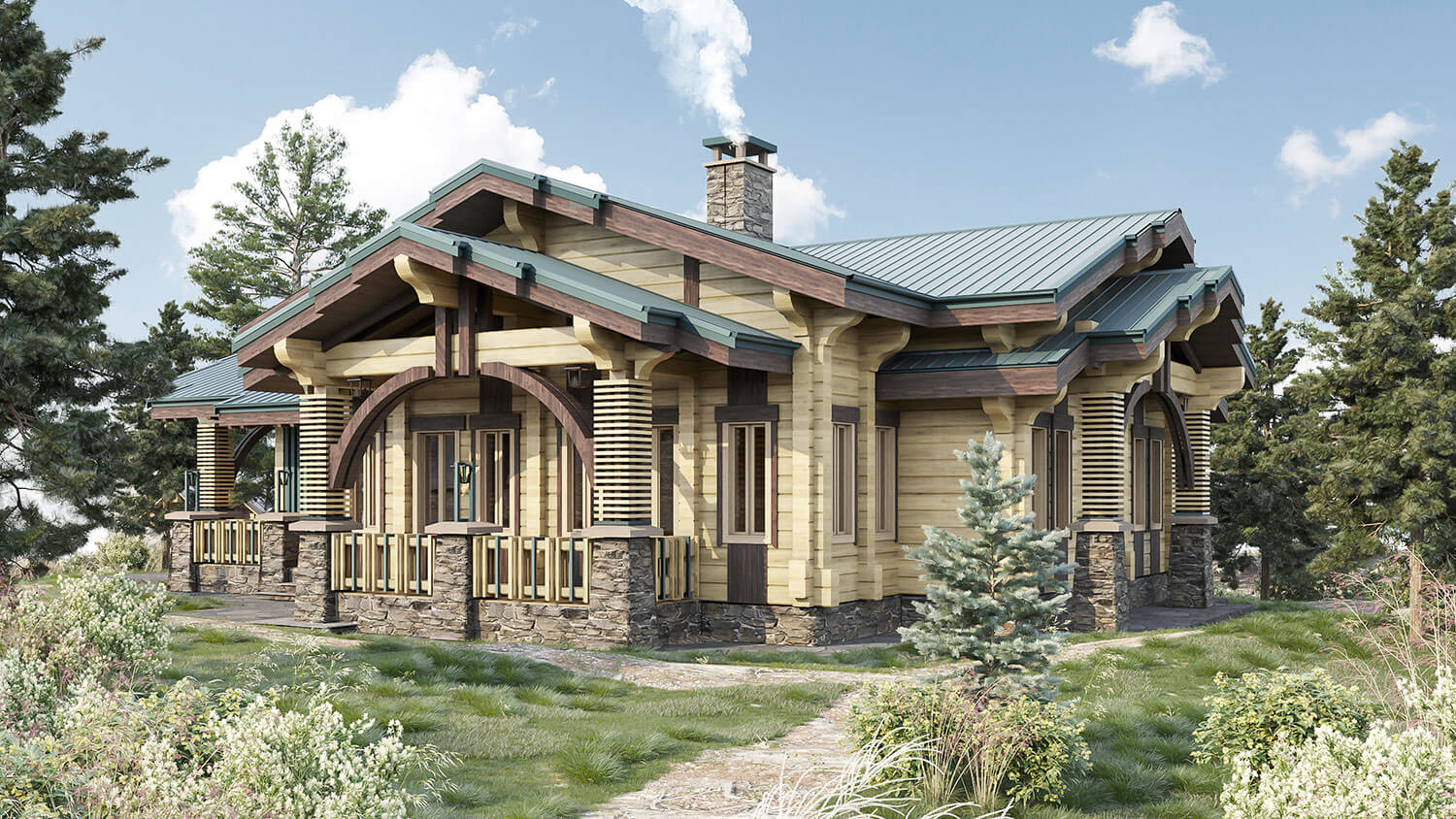 Выполненный в профилированном брусе дом облицовывается декоративными накладками из меди, которые дополнены вытянутыми фонарями на столбах в стиле ар деко. Такое решение позволяет так же организовать дополнительную подсветку вертикальных несущих столбов и плоскости стен. Кровля покрыта медью с целью придания облику более строгий и современный вид.