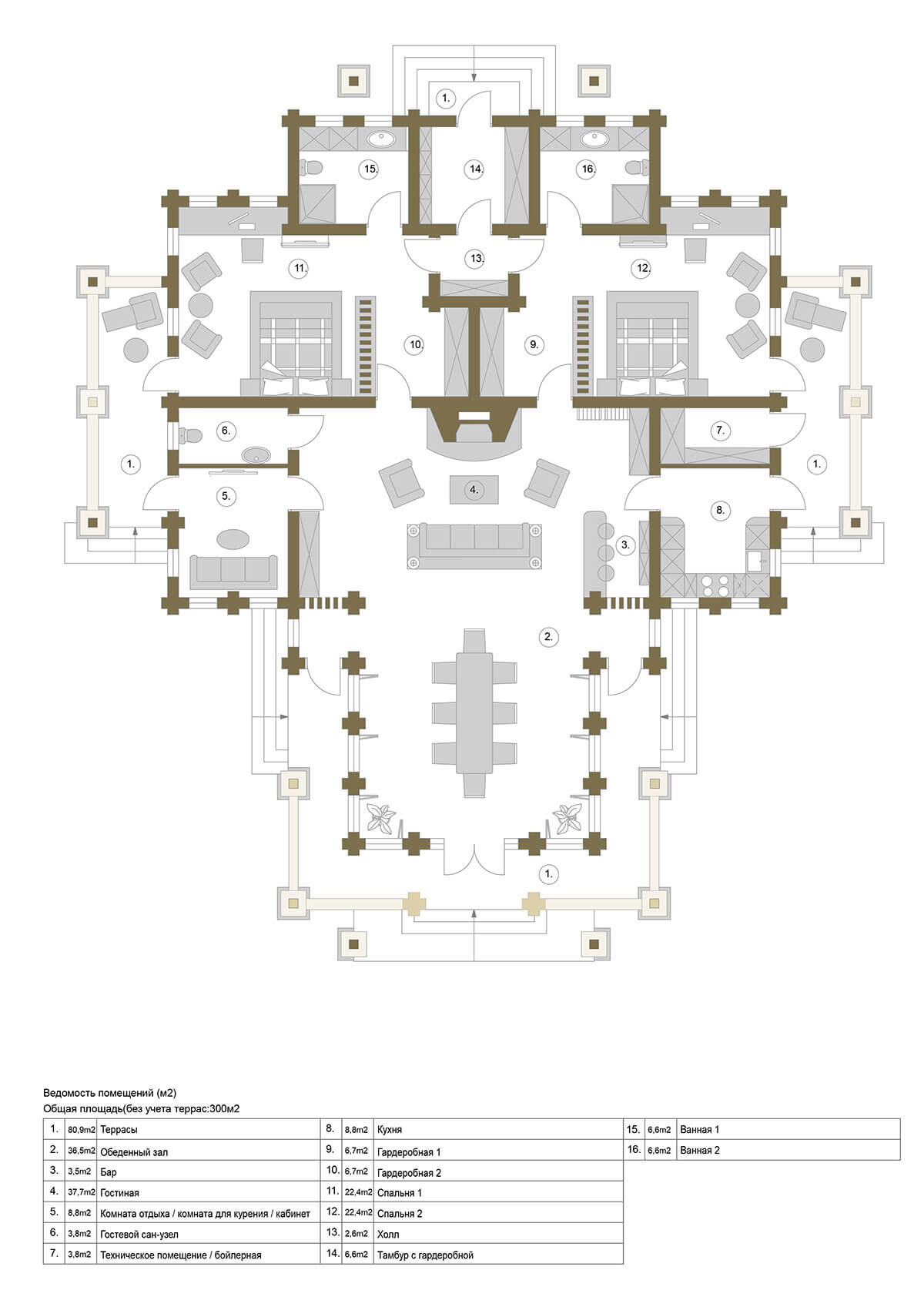 Планировочное решение дома организовано вокруг центрального пространства обеденной и гостиной. Две просторные спальни имеют свои отдельные ванные комнаты и гардеробные.