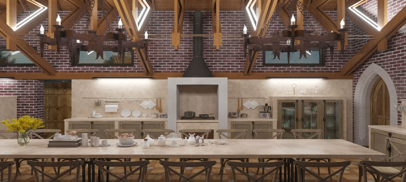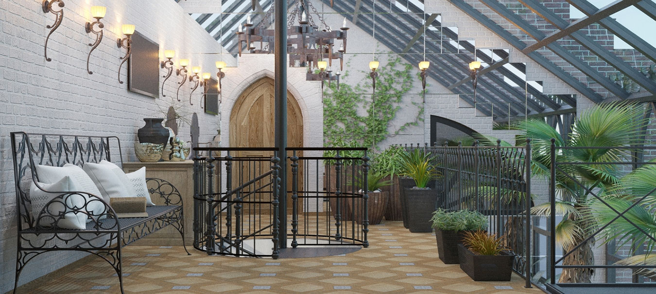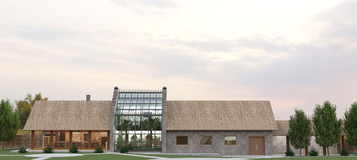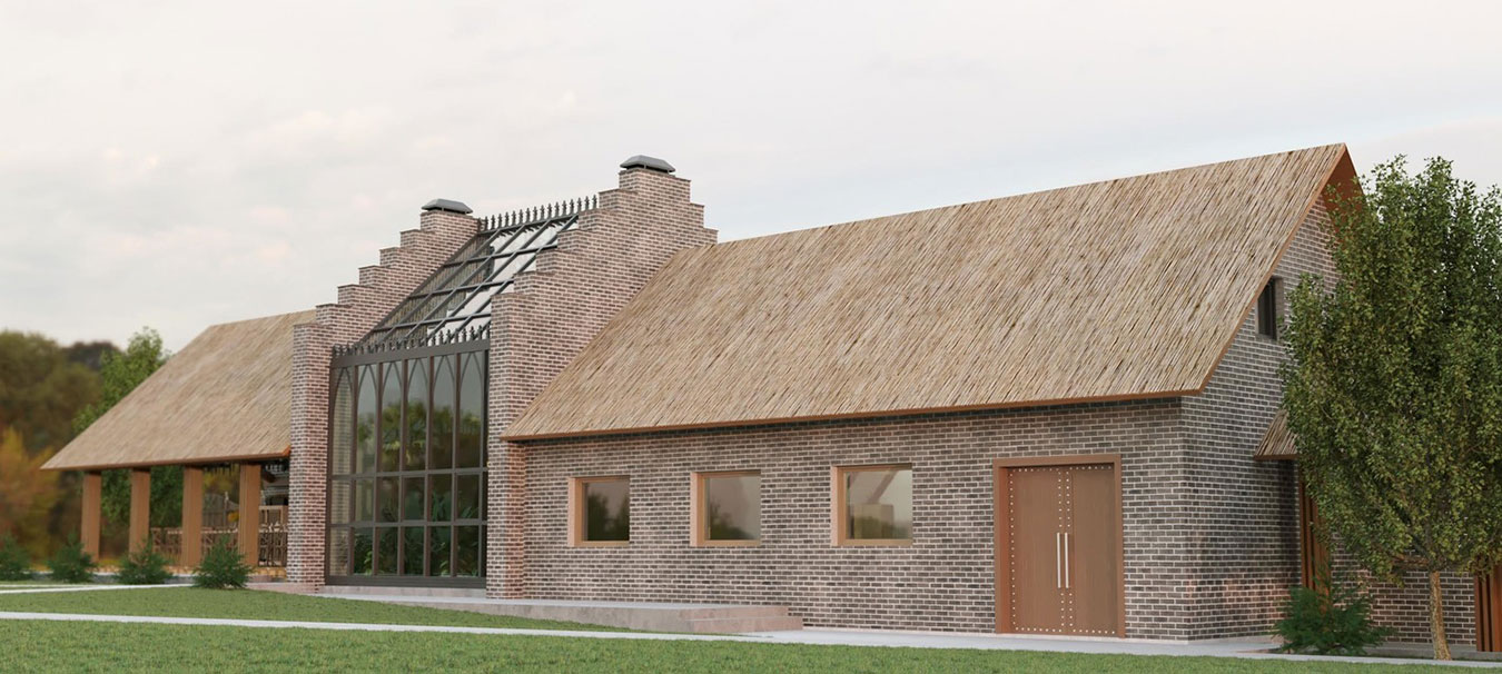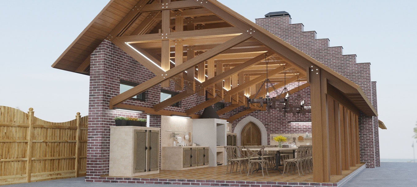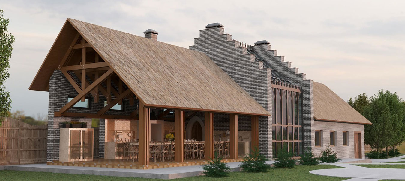 Гостевой дом площадью 310 м² с просторной столовой и зоной барбекю, спальней на втором этаже, оранжереей и гаражом.