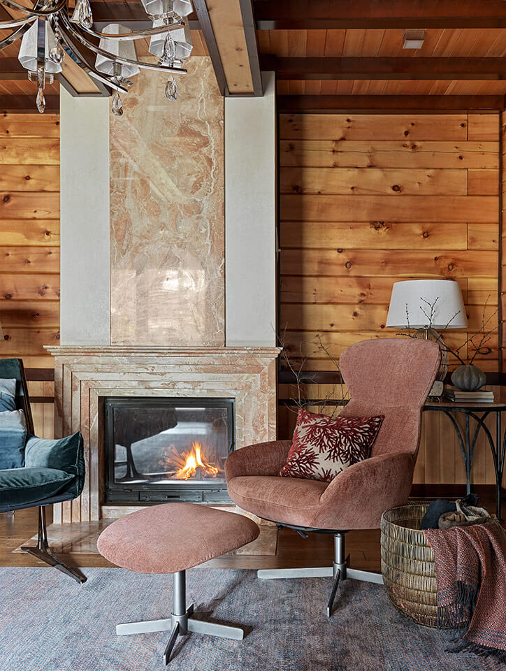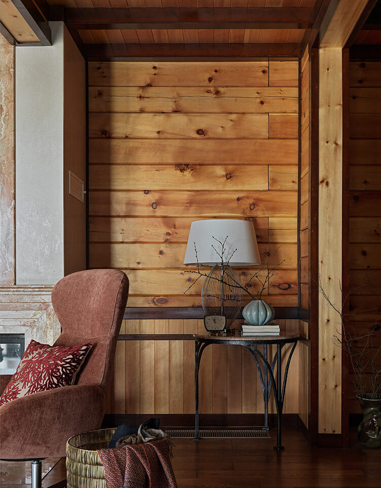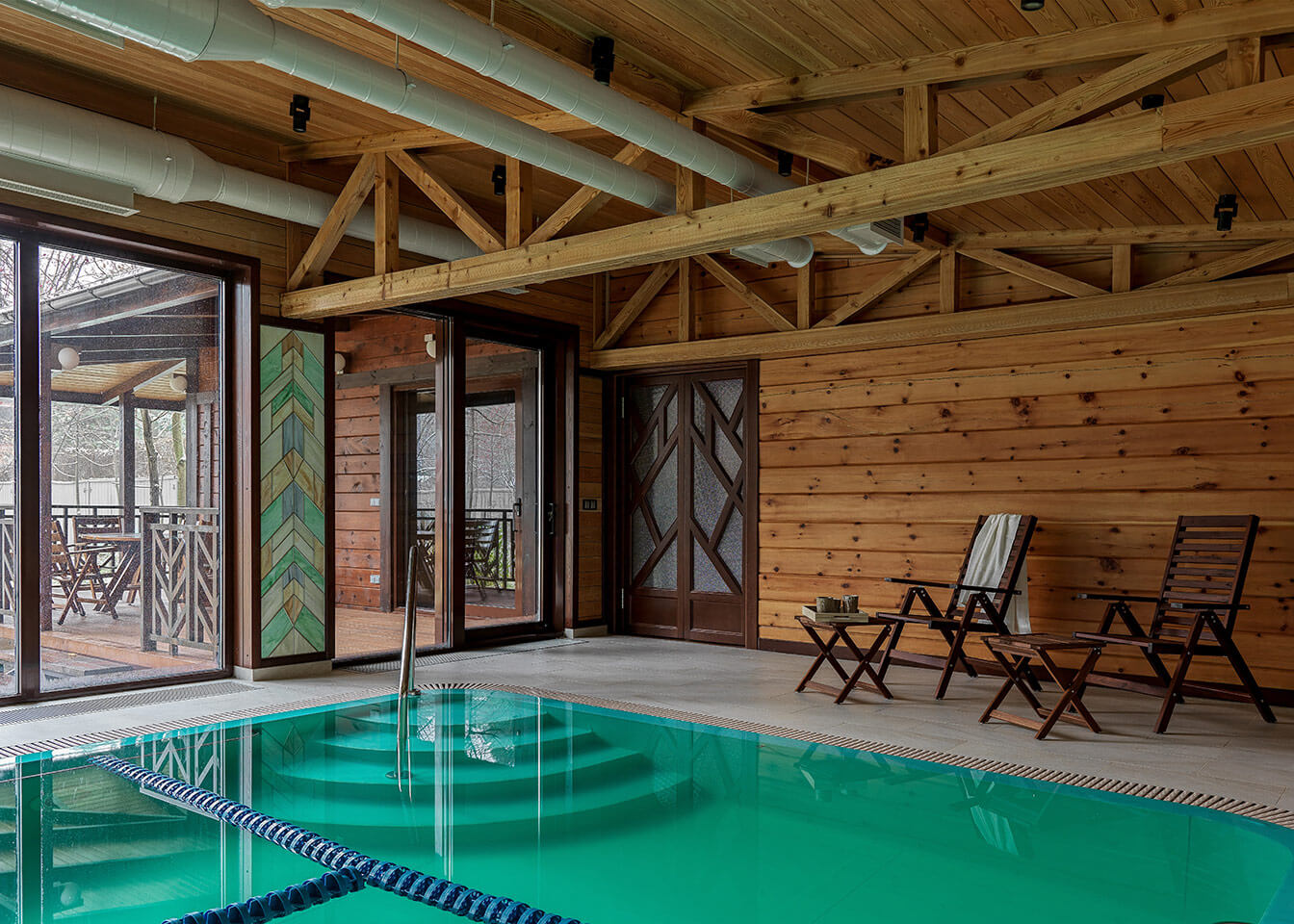 Автор ориентировалась на имеющуюся Г-образную форму, вписав в нее лаконичный дом, опоясанный открытой верандой. Строение выполнили из бруса – так хотел заказчик, и к тому же экологичный и красивый материал великолепно подчеркивал прелесть окружающего пейзажа. Внутреннее пространство также изобилует деревом (в частности, использовалась инженерная доска из дуба), создавая атмосферу русской усадьбы, где течет неторопливая, размеренная жизнь.