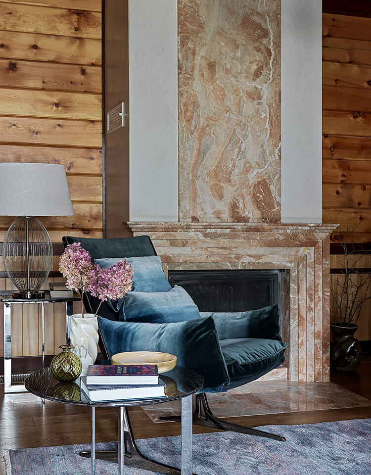 Спокойствие и благородство обстановки подчеркивают и другие элементы интерьера – от мебели, выполненной специально для этого проекта, до выбора фактур и цветов: приглушенные сложные тона, тактильно приятные ткани, тщательно подобранные предметы искусства…В целом внутреннее пространство выглядит удивительно естественным, комфортным, обволакивающе уютным.Впрочем, заказчик хотел, чтобы в обстановке присутствовали и выразительные художественные детали. Автору удалось вписать в общий облик дома такие тонкие и роскошные элементы, как мраморные порталы камина и печи, декоративную ковку на лестнице.