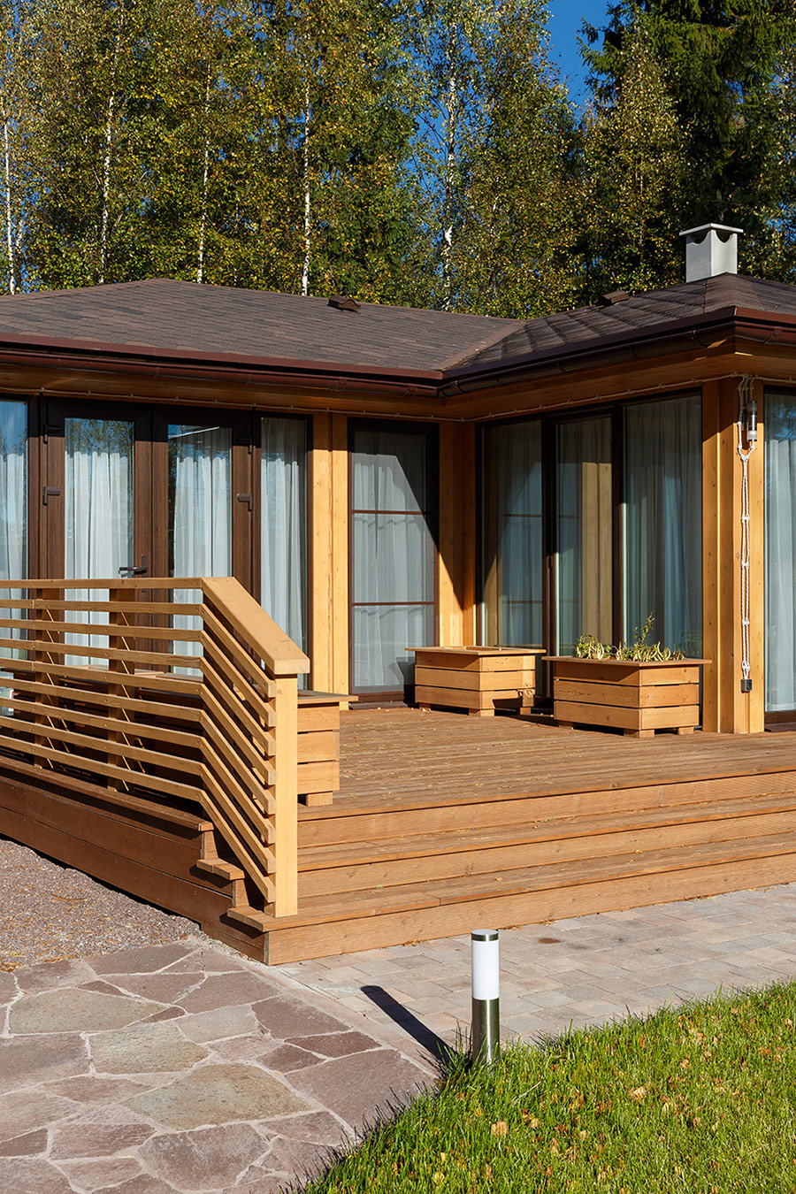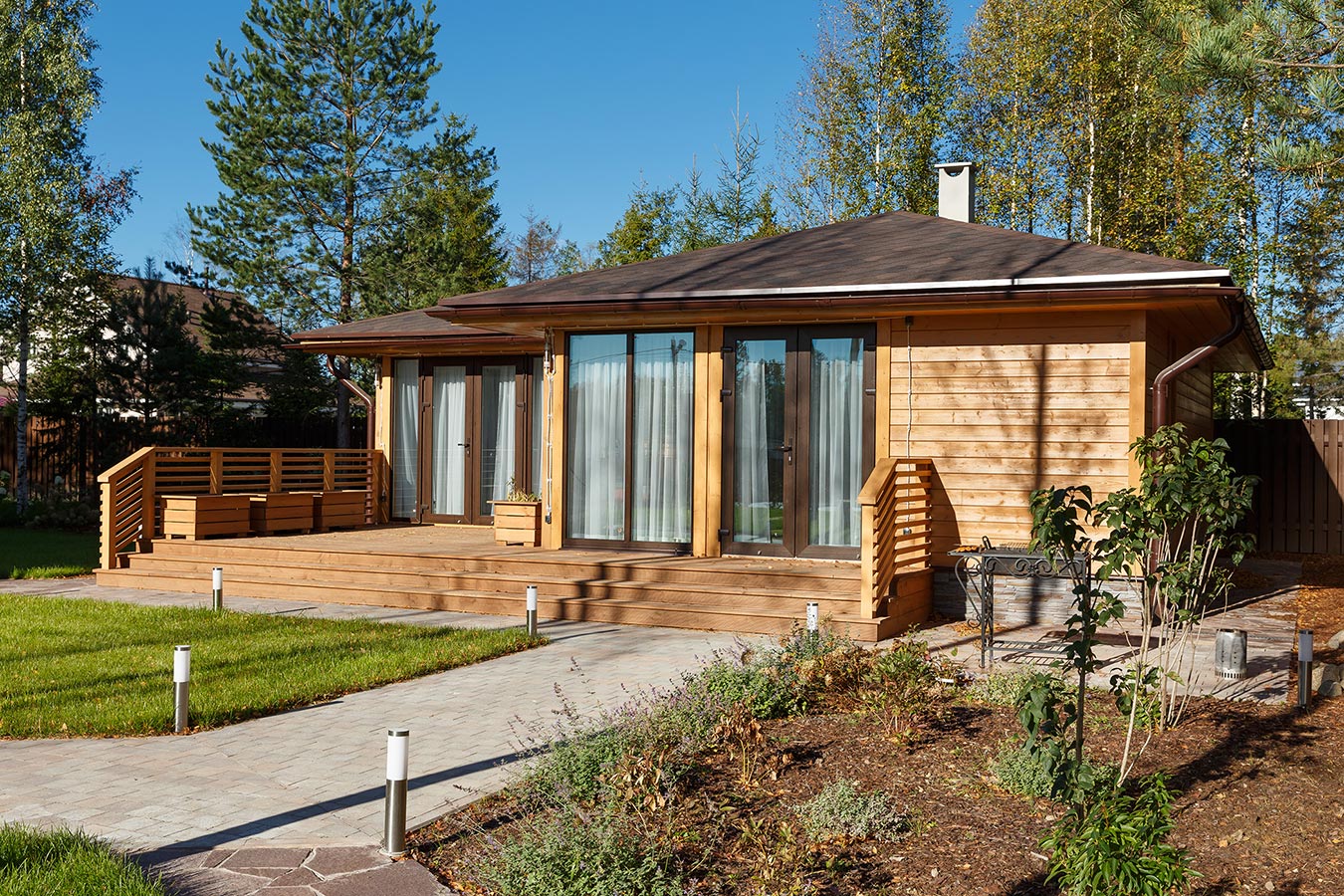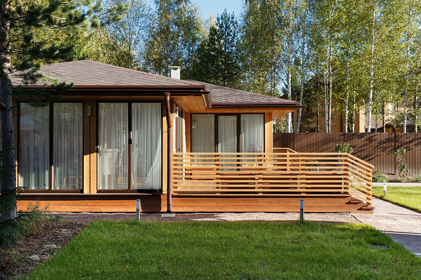 Основная идея при постройке гостевого дома — создать уютное пространство вокруг зоны барбекю, чтобы проводить выходные в кругу друзей в максимальной близости к природе в любое время года, а также отделить шумные компании от главного здания. Поэтому обустроили большое помещение для встречи гостей с зоной столовой, террасу, спальню, санузел с душевой и кладовую.