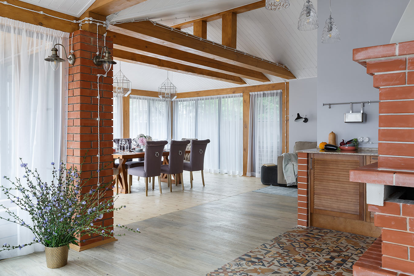 Цветовая гамма спокойная с яркими акцентами, что соответствует природным ландшафтам в окрестностях Петербурга в разные сезоны. Сад – это часть интерьера, поэтому цветовое решение интерьера сочетается с природными оттенками. Например, терракотовый кирпич, благородно-янтарные балки, темно-коричневые рамы остекления — прекрасный фон для зеленого массива участка, который благодаря панорамным окнам стал частью обстановки.
