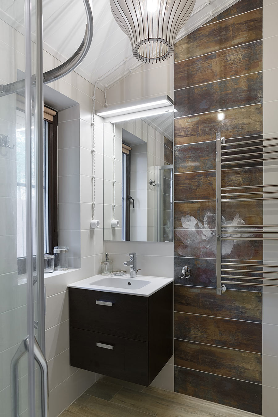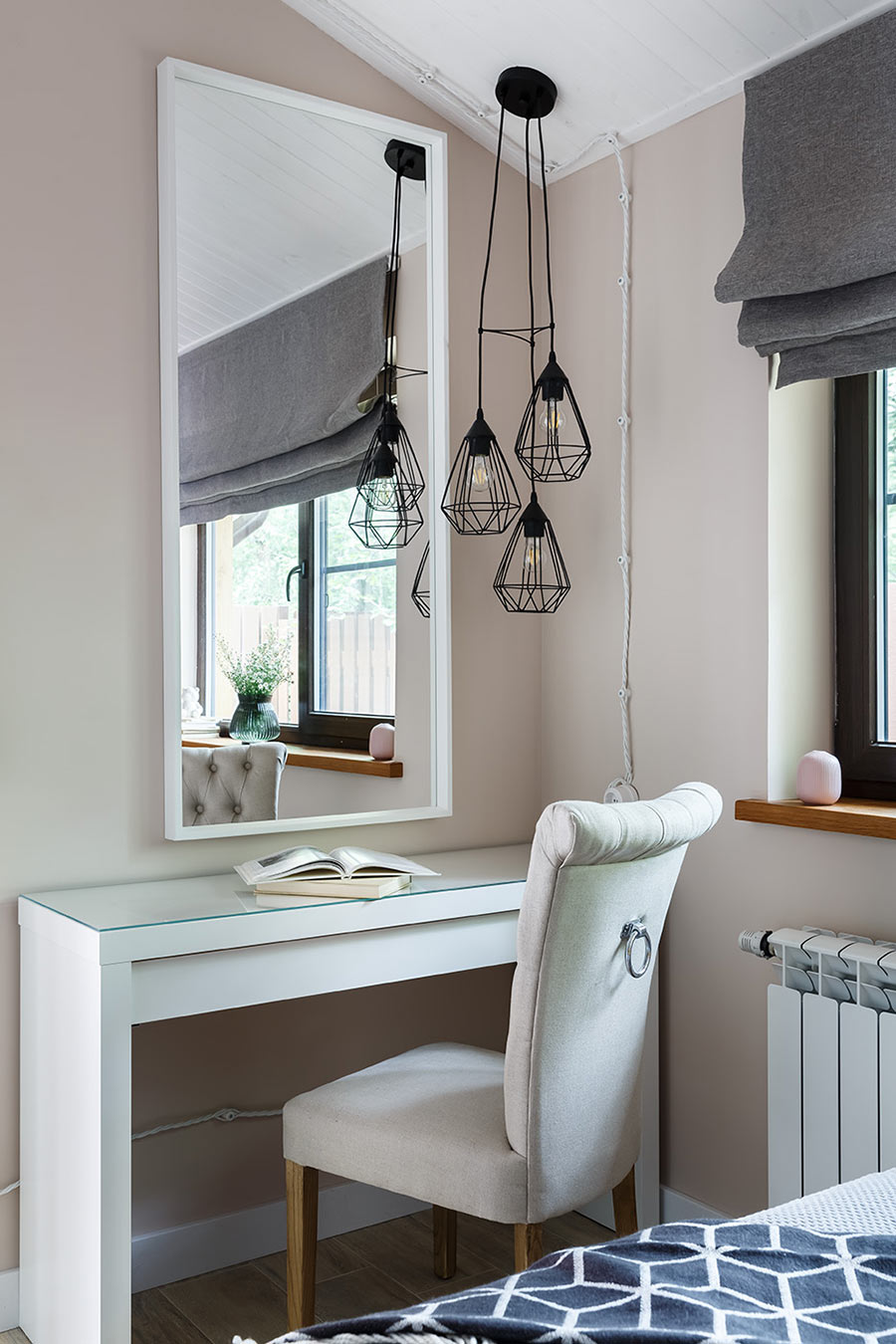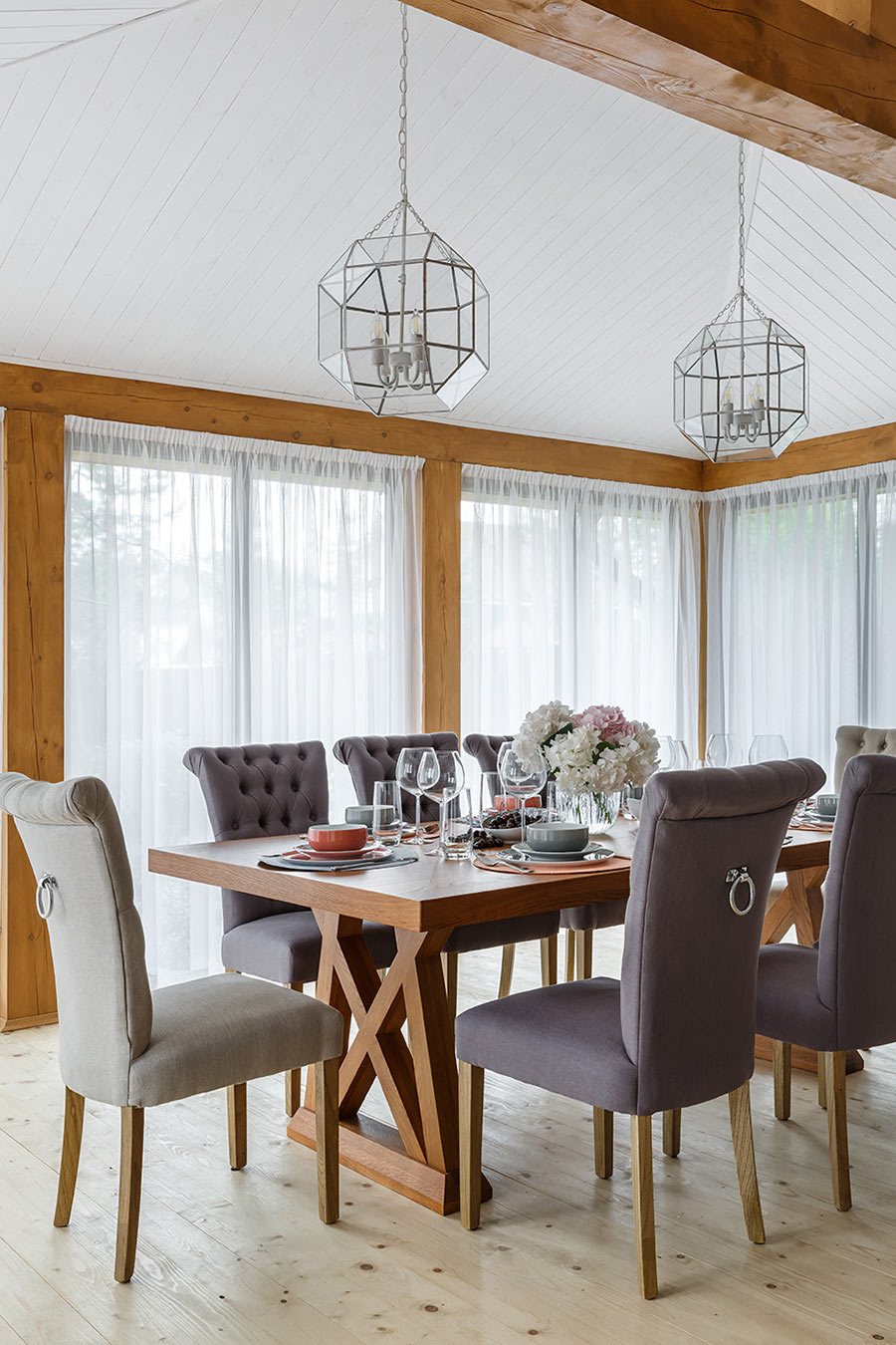 Интерьер выдержан в современном стиле, но с ярко выраженным загородным колоритом, который подчеркивают люстры, бра и другие светильники в разнообразных концептуальных решениях. Ретропроводка отсылает к деревенскому стилю. Большое количество разных сценариев искусственного освещения используется как декораторский прием.